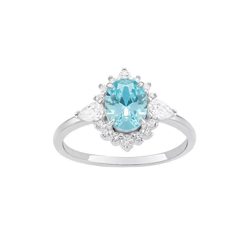 Add a vintage-inspired touch of elegance to any ensemble with this sterling silver PRIMROSE aqua and white cubic zirconia ring. Click on this JEWELRY & WATCHES GUIDE to learn about fit, styles, materials and more! Add a vintage-inspired touch of elegance to any ensemble with this sterling silver PRIMROSE aqua and white cubic zirconia ring. Click on this JEWELRY & WATCHES GUIDE to learn about fit, styles, materials and more! FEATURES Band width: 13 mm Shank style: straight Band fit: comfort fit Nickel free Metal: sterling silver Plating: rhodium Finish: polished Packaging: boxedSTONE DETAILS Stone type: cubic zirconia Total weight: 1 3/4 ct. Center stone weight: 1 1/5 ct. Center stone size: 6 mm x 8 mm Shape: oval, pear, round Setting: prong Gemstones may have been treated to enhance their appearance. Special care may be required. Please visit our Gemstone Treatment & Special Care Guide for more information. Size: 9. Color: Sterling Silver White. Gender: female. Age Group: adult.