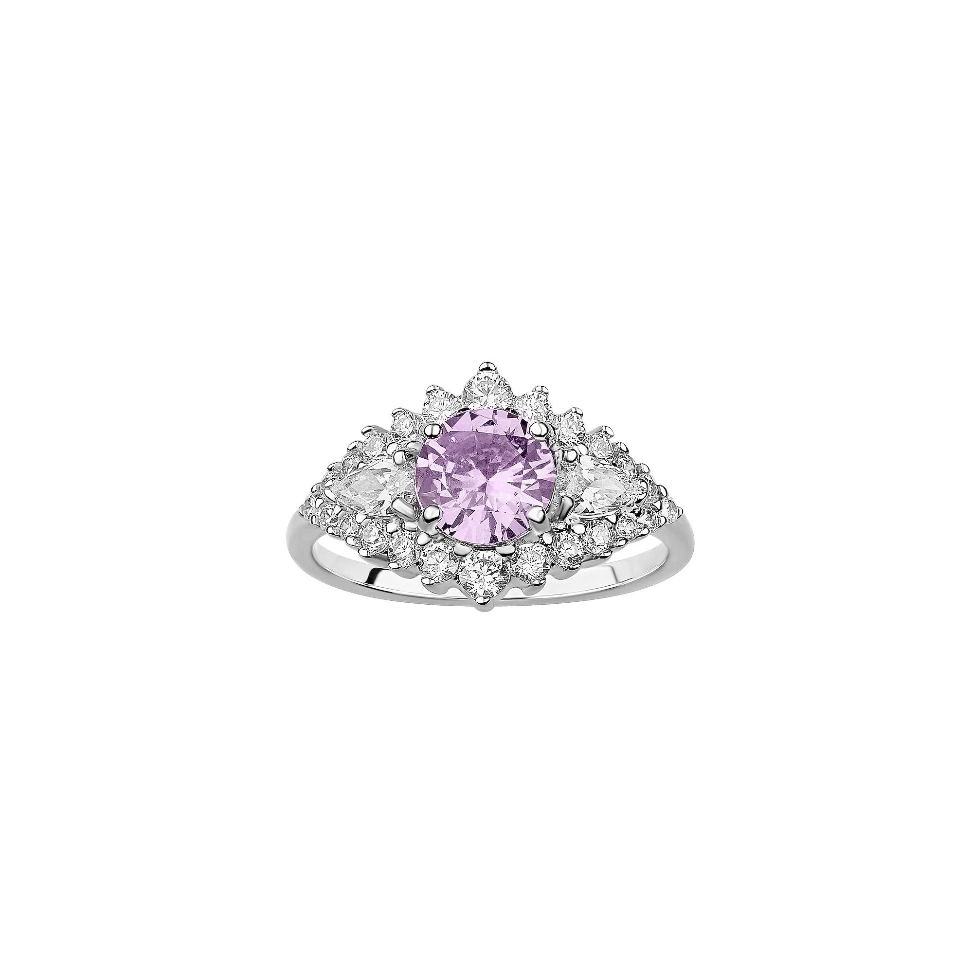 Accent your look with the unique style of this Brilliance cubic zirconia cluster ring. Accent your look with the unique style of this Brilliance cubic zirconia cluster ring. Width: 13 mm Nickel free Metal: sterling silver Plating: rhodium Finish: polished Packaging: boxedSTONE DETAILS Stone type: cubic zirconia Total weight: 2 1/3 ct. Center stone weight: 1 1/4 ct. Center stone size: 7 mm Shape: pear, round Setting: pave, prong Gemstones may have been treated to enhance their appearance. Special care may be required. Please visit our Gemstone Treatment & Special Care Guide for more information. Color: Purple. Gender: female. Age Group: adult.