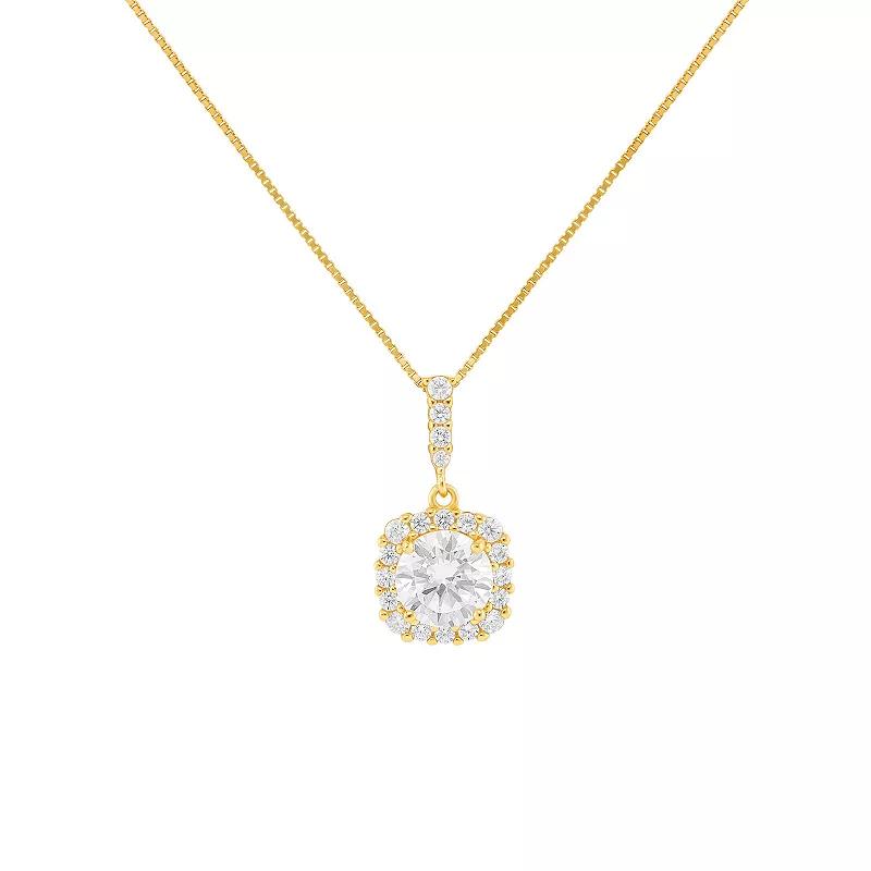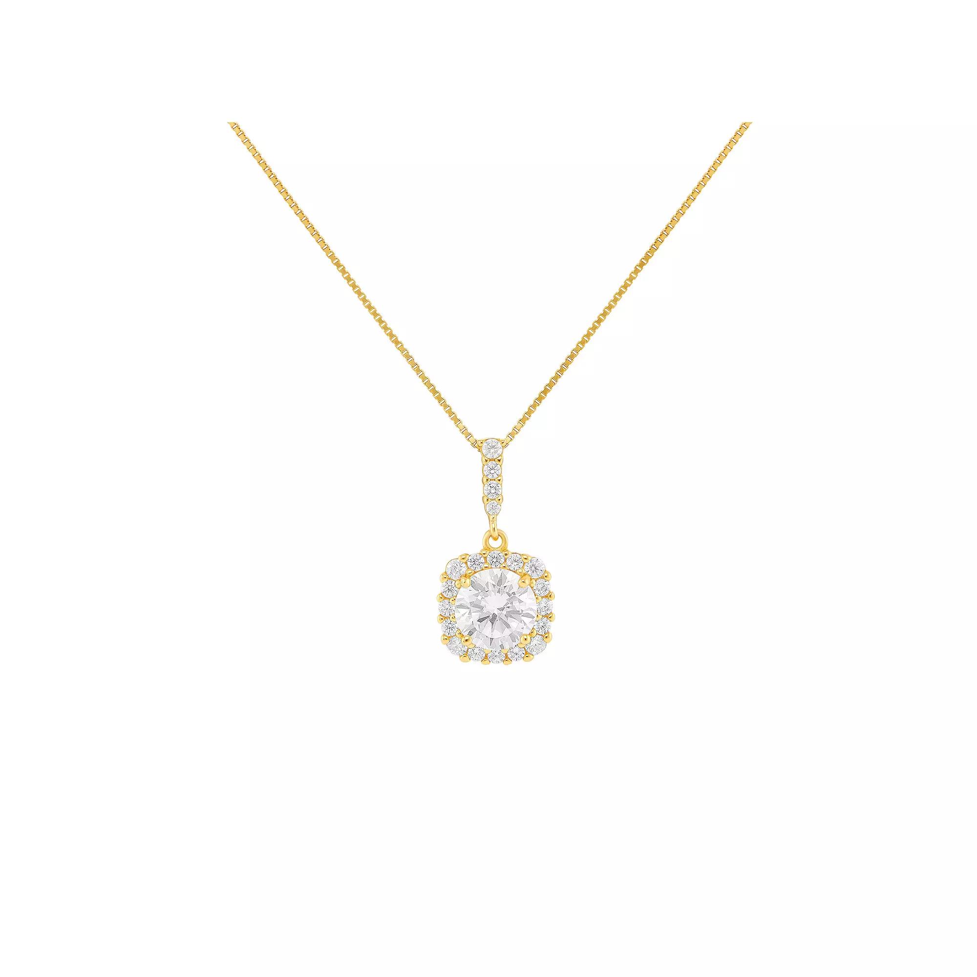 Featuring a shimmering cubic zirconia center stone in a cushion-shaped setting, this PRIMROSE necklace the perfect accessory for any special occasion. Click on this JEWELRY & WATCHES GUIDE to learn about fit, styles, materials and more! Featuring a shimmering cubic zirconia center stone in a cushion-shaped setting, this PRIMROSE necklace the perfect accessory for any special occasion. Click on this JEWELRY & WATCHES GUIDE to learn about fit, styles, materials and more! FEATURES Pendant size: 0.76L x 0.39W Chain length: 18 in. Chain type: box Clasp: spring-ring Nickel free Metal: sterling silver Plating: 18k gold Finish: polished Packaging: boxedSTONE DETAILS Stone type: cubic zirconia Total weight: 1 1/2 ct. Center stone weight: 1 1/4 ct. Center stone size: 7 mm x 7 mm Shape: round Setting: pave, prong Size: 18. Color: Yellow. Gender: female. Age Group: adult. Material: Gold Over Sterling.