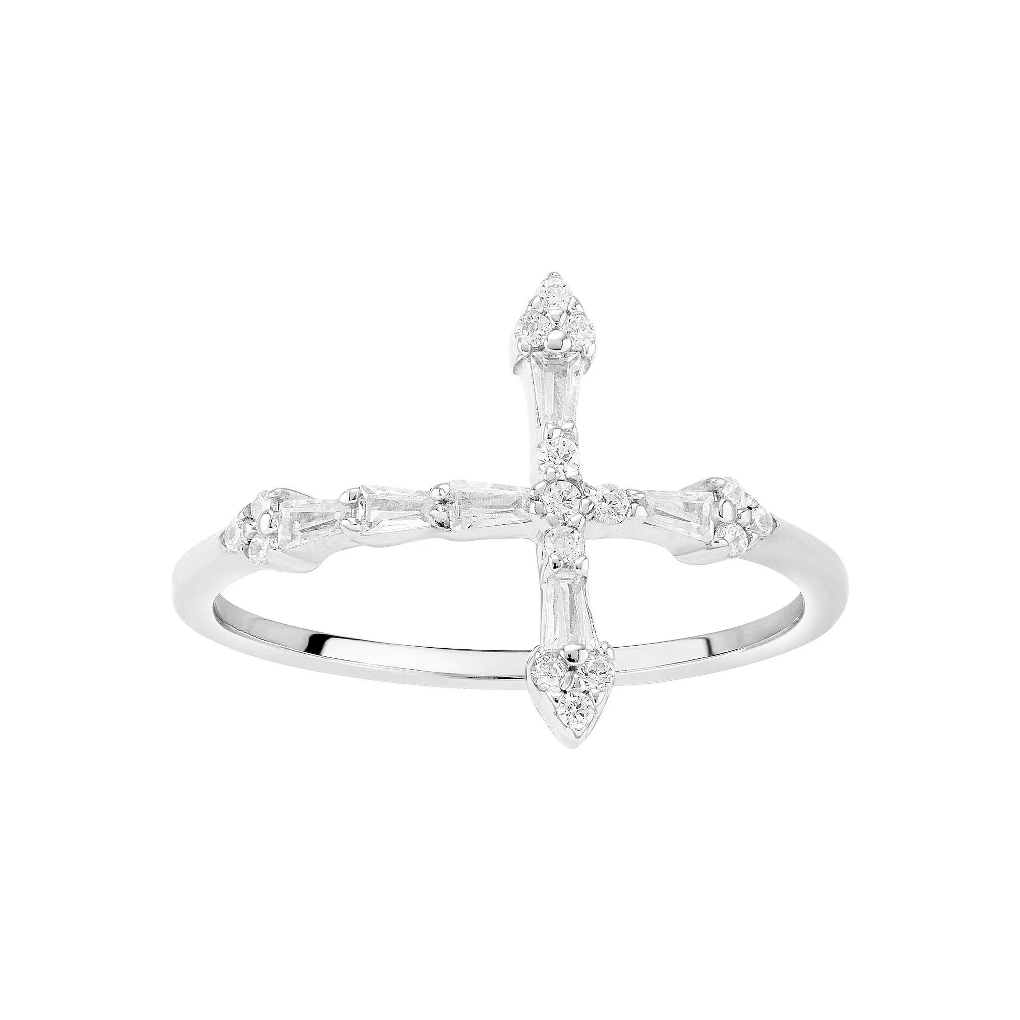 Accessorize your everyday style with this beautiful PRIMROSE sterling silver cross band ring. Click on this JEWELRY & WATCHES GUIDE to learn about fit, styles, materials and more! Accessorize your everyday style with this beautiful PRIMROSE sterling silver cross band ring. Click on this JEWELRY & WATCHES GUIDE to learn about fit, styles, materials and more! FEATURES Width: 15mm Shank style: straight Band fit: comfort fit Metal: sterling silver Plating: rhodium Finish: polished Nickel free Packaging: decorative cardSTONE DETAILS Total weight: 1/3 ct. Shape: baguette cut, round Setting: prong Stone type: cubic zirconia Size: 9. Color: Grey. Gender: female. Age Group: adult.