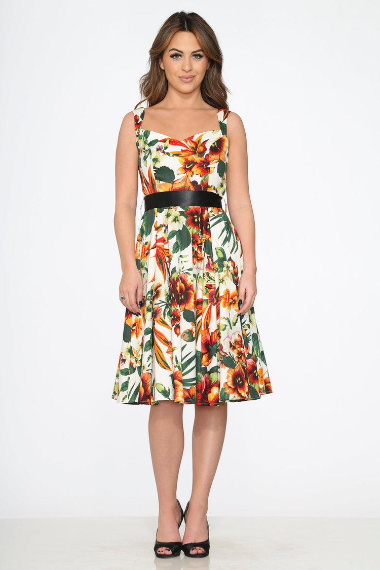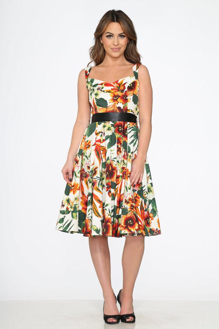 Delicate and graceful, the Prince Lily Floral Swing Dress by Orchid Bloom features a beautiful floral print inspired by the elegance of lilies in bloom. With its timeless swing silhouette and vintage flair, this dress is perfect for garden parties, weddings, or any occasion where a touch of romance is in order.Crafted from a breathable cotton-spandex blend, it provides comfortable stretch and a flattering fit. Finished with a center back zipper and practical side pockets, it offers both charm and convenience.Fabric Composition97% Cotton, 3% SpandexFabric provides stretchLength: 41"ImportedDesign DetailsCenter back zipperSide pockets