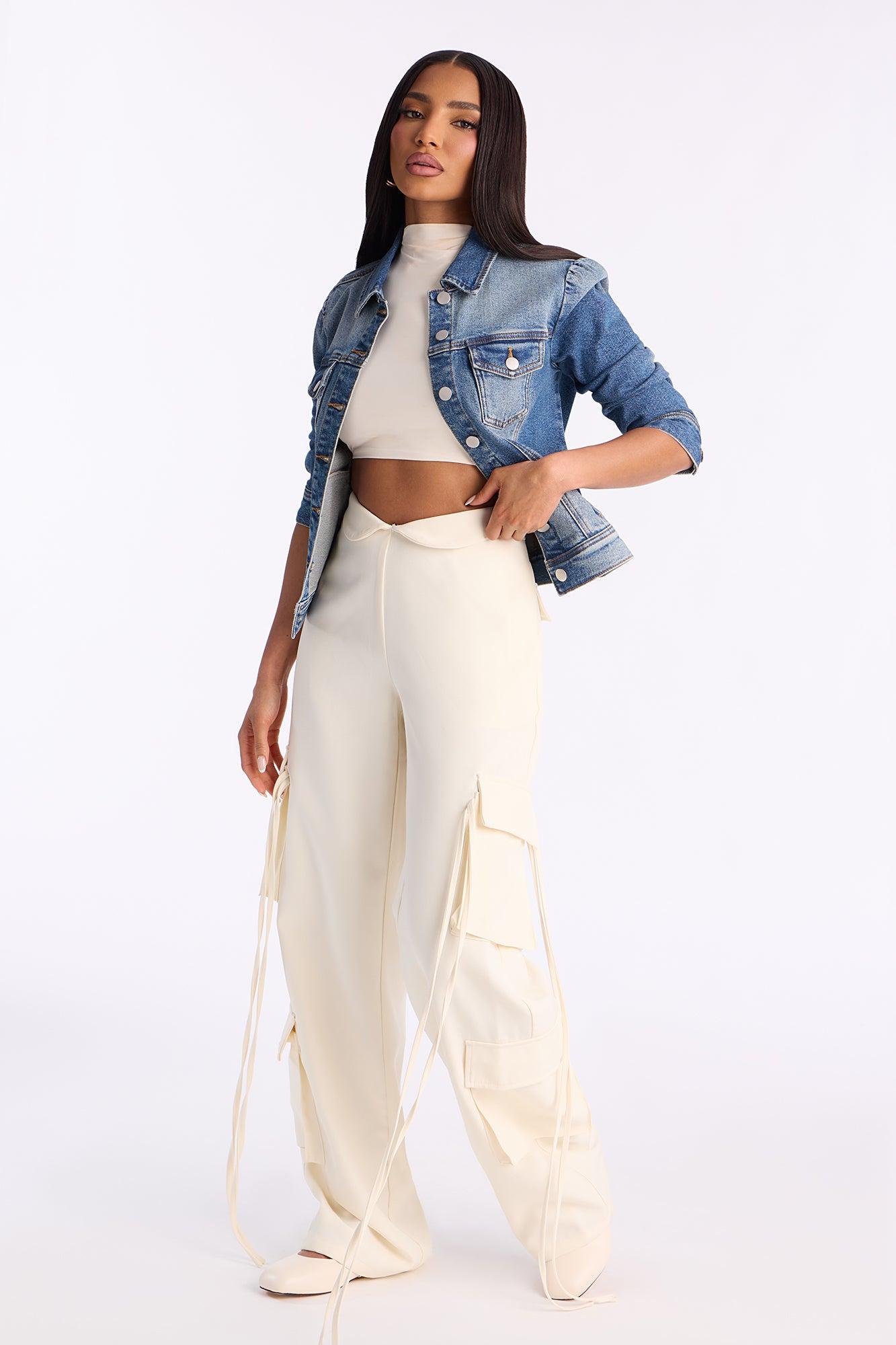 Available In Medium Wash. Denim Jacket Fitted Puff Sleeve Collar Functional Chest Pockets Button Closure Buckle Back Denim Stretch Disclaimer: Due To The Specialized Wash Process, Each Garment Is Unique. 99% Cotton 1% Spandex Imported