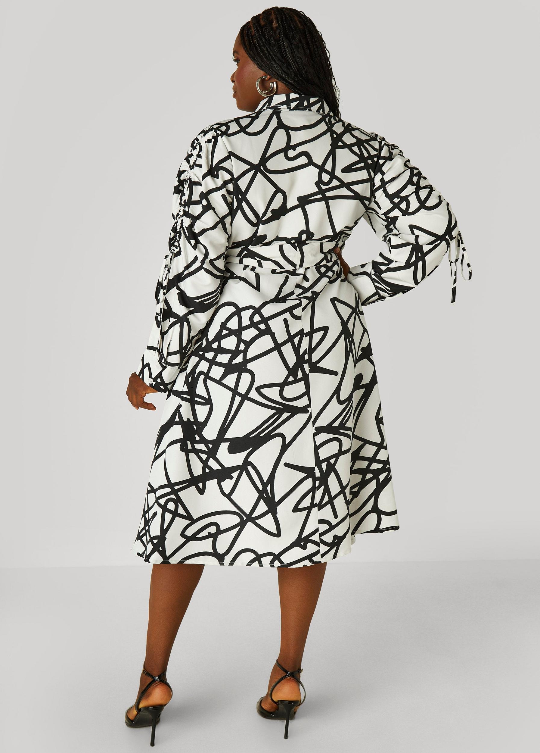 This black and white print midi shirtdress came to stir things up with faux drawstring sleeves, button cuffs and a sash-tie waist.