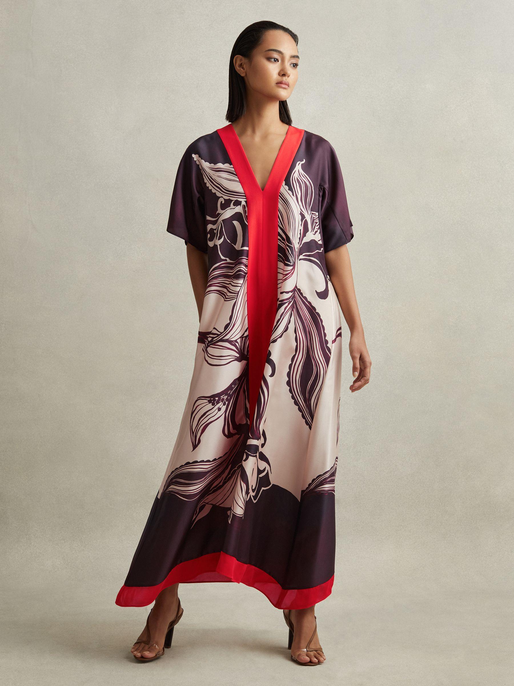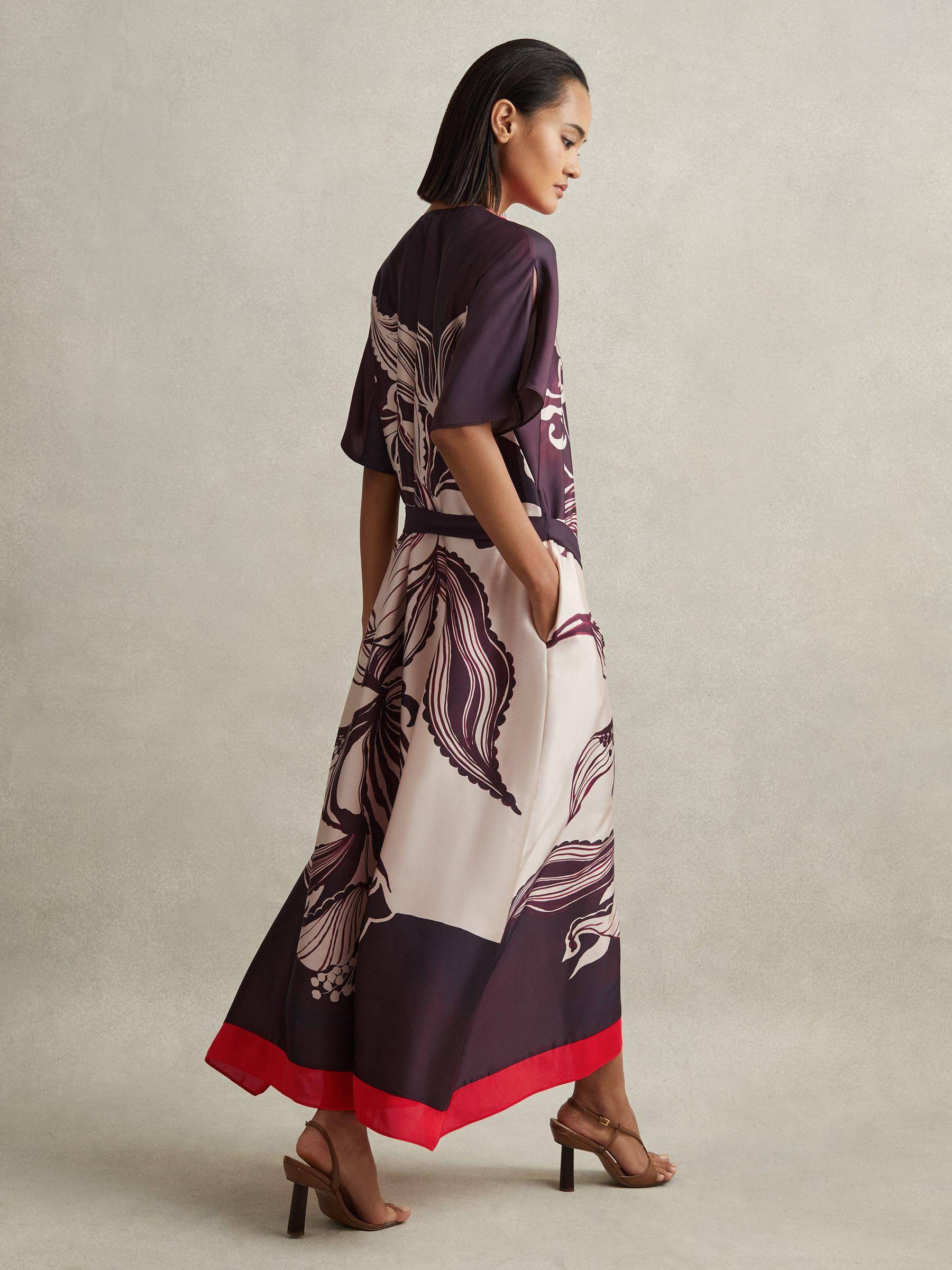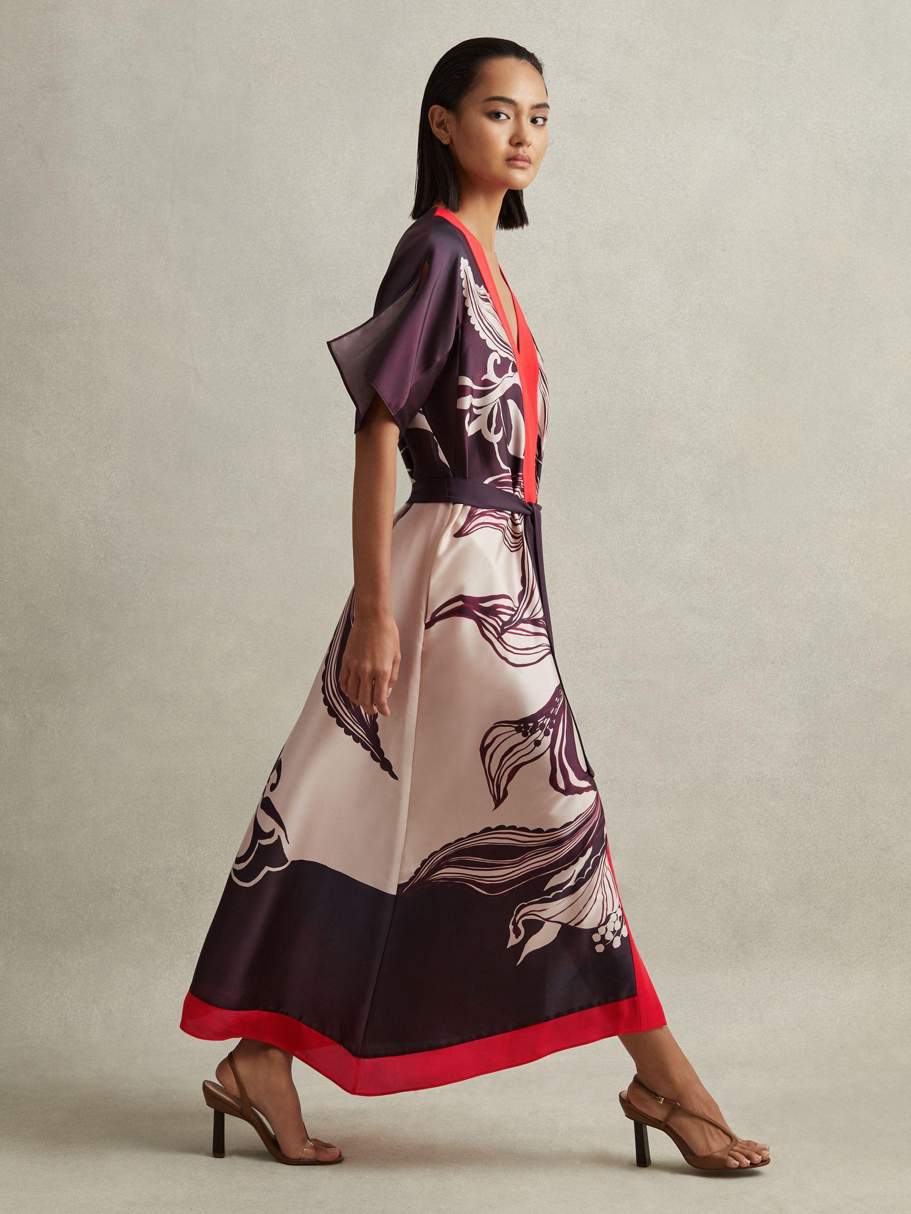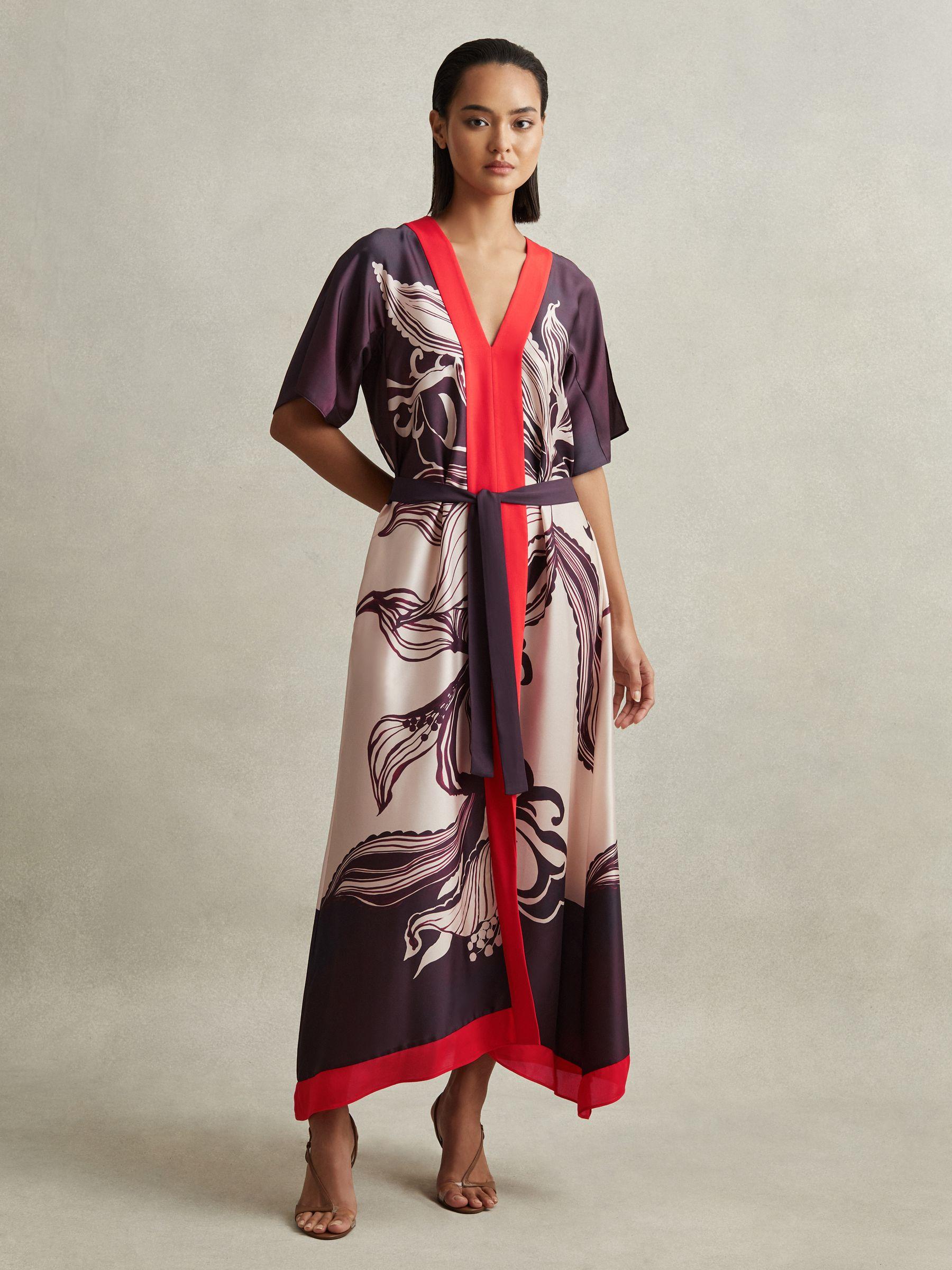 Designed from a fluid fabric in an abstract print, the Hanna dress falls naturally in a trapeze shape, with a front split and split sleeves adding extra movement. Printed V-neckline Split sleeves Front split Self-tie waist belt Midi length The model is wearing a size 8 Measurements of model: Height 5ft 10" / 178cm