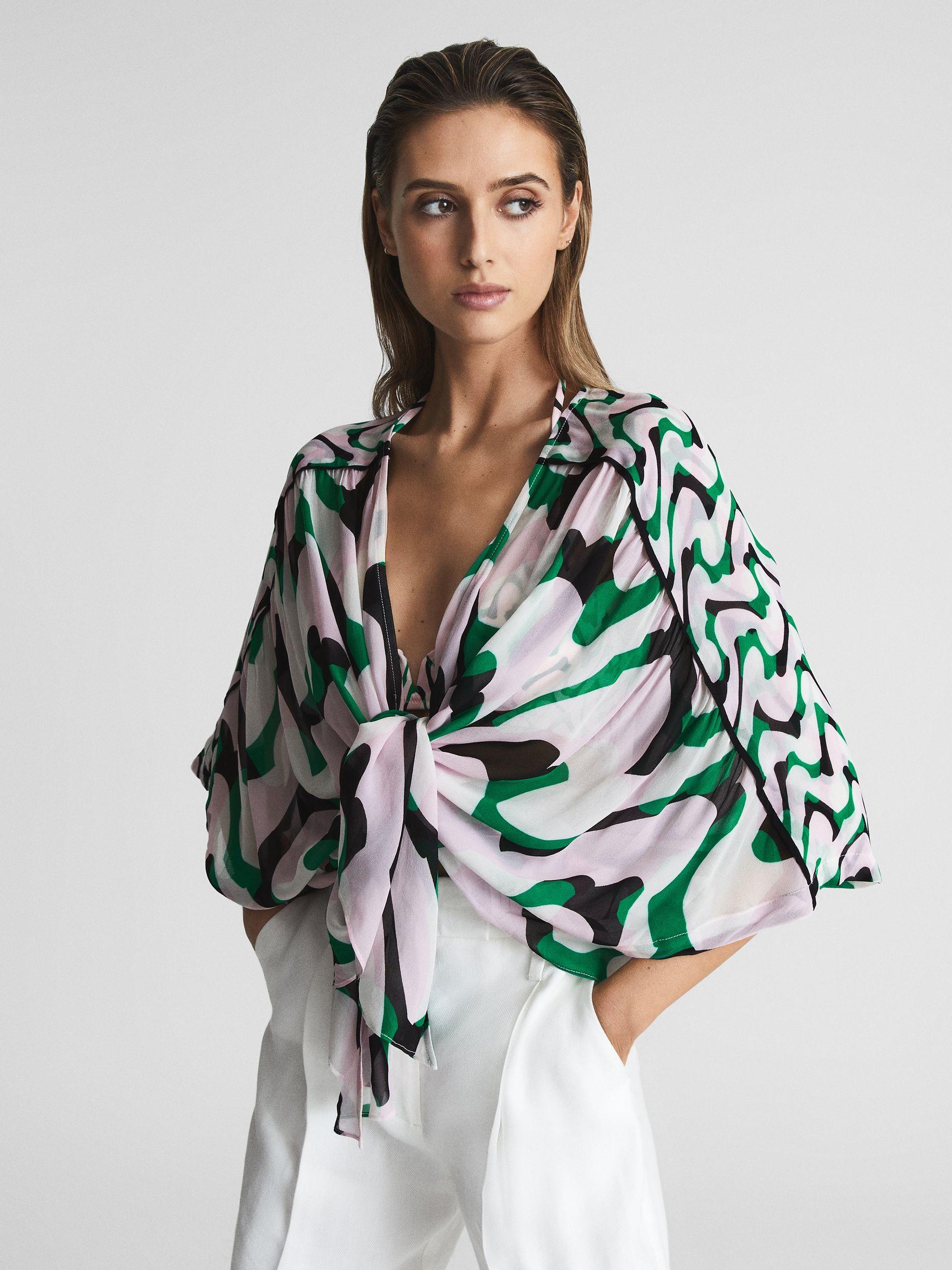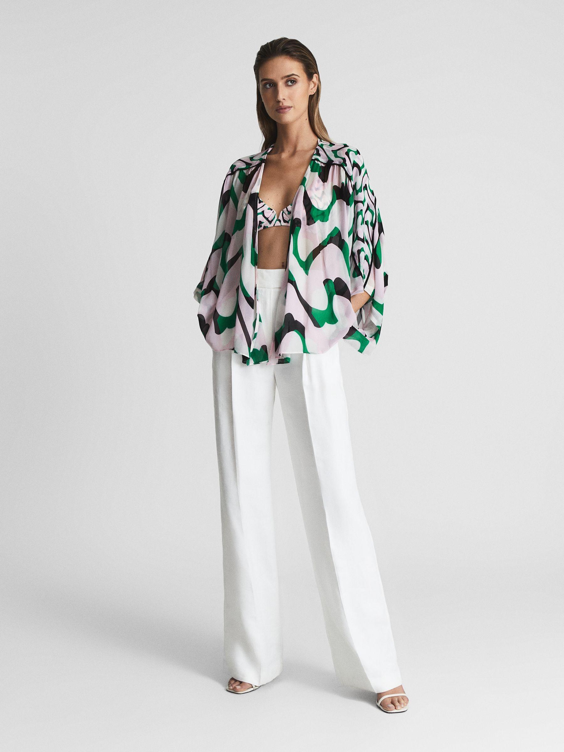 The Paige shawl top is designed with vacation styling in mind. It's a sleeveless piece crafted to be worn with versatility over your bikini top. Pack it in your suitcase to drape over your shoulder whilst you're around the pool or to wear to lunch at the resort. This style is presented in a new-season pattern that matches our Audrinna bikini set - wear altogether for a chic, coordinated ensemble that looks perfect in the sun. Shawl style. Semi-sheer fabrication. Printed design. The model is wearing a size 8. Measurements of model: Height 5ft 10" / 178cm, Chest 32" / 81 cm, Waist 24" / 61cm.