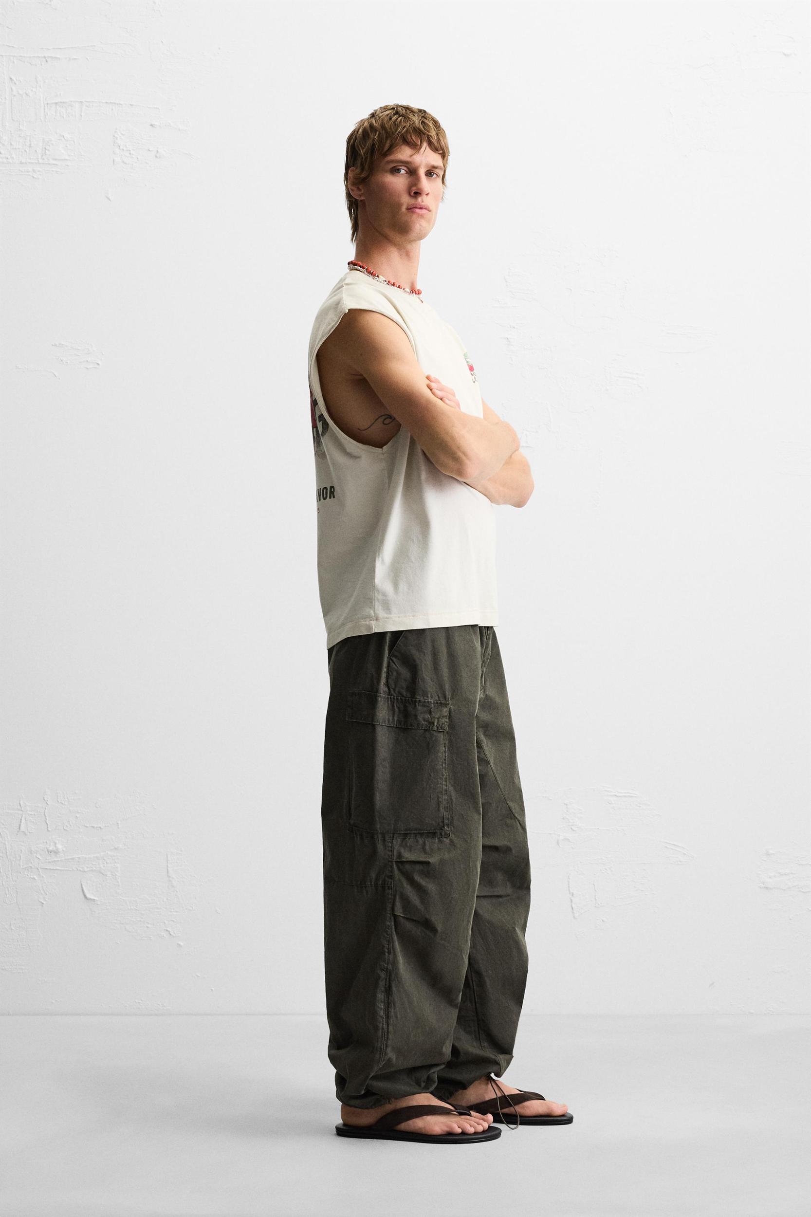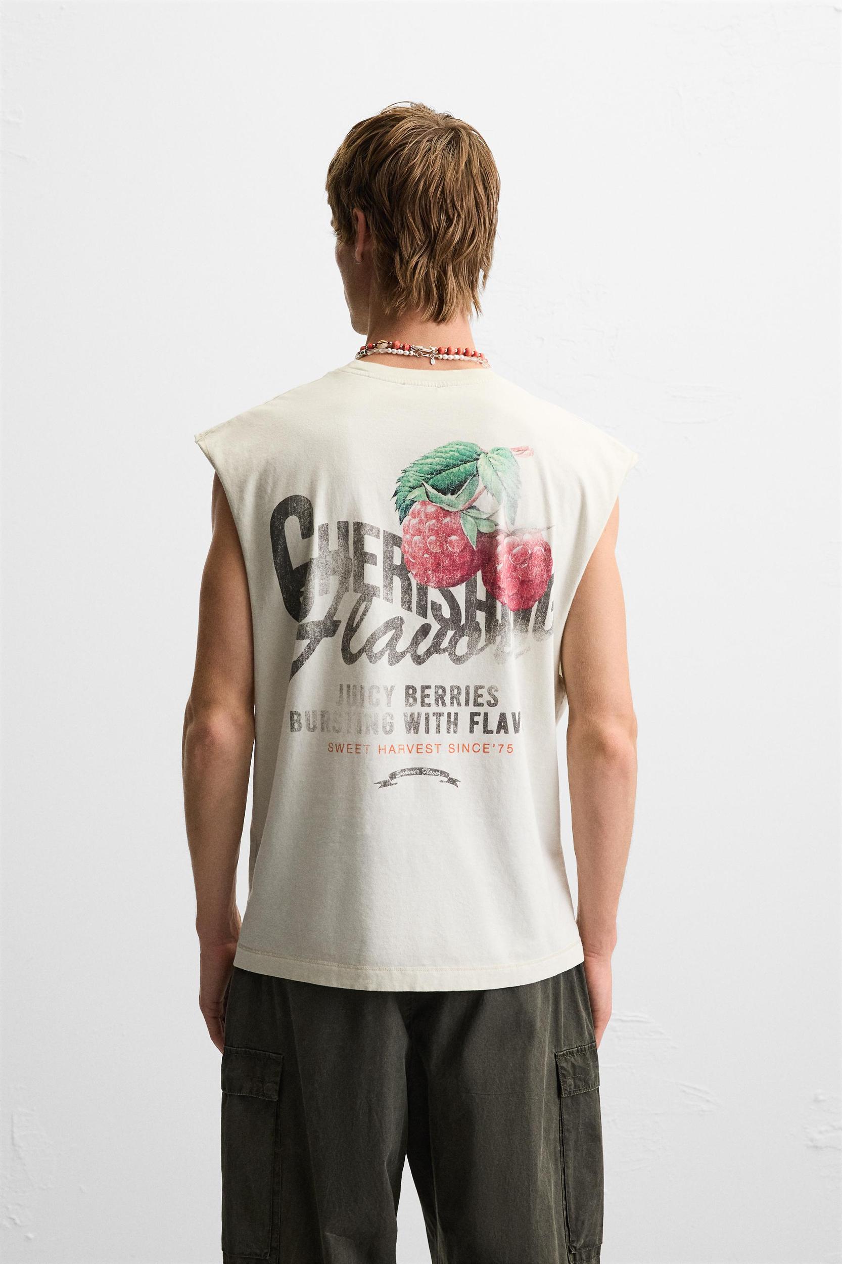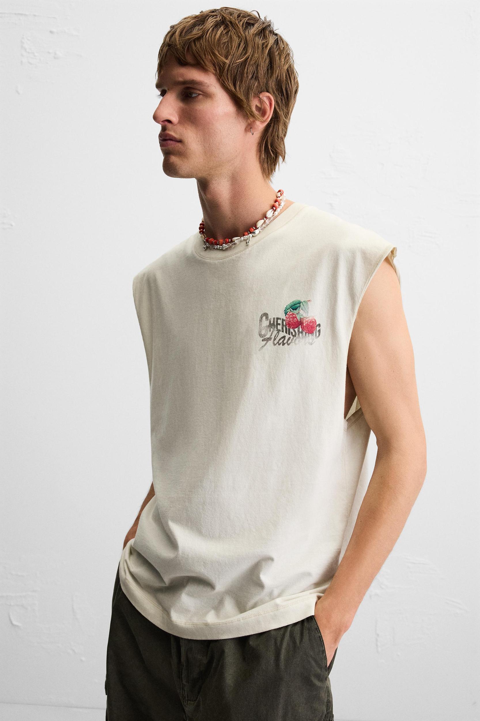Relaxed fit tank top. Round neck and sleeveless. Contrasting print on the back. Irregular hem. The garment has a unique appearance thanks to its special washing process. For this reason, it may differ slightly in color from the photo.