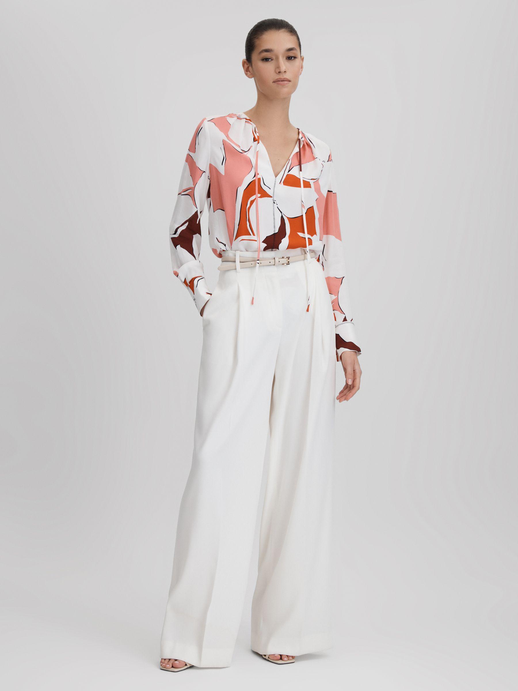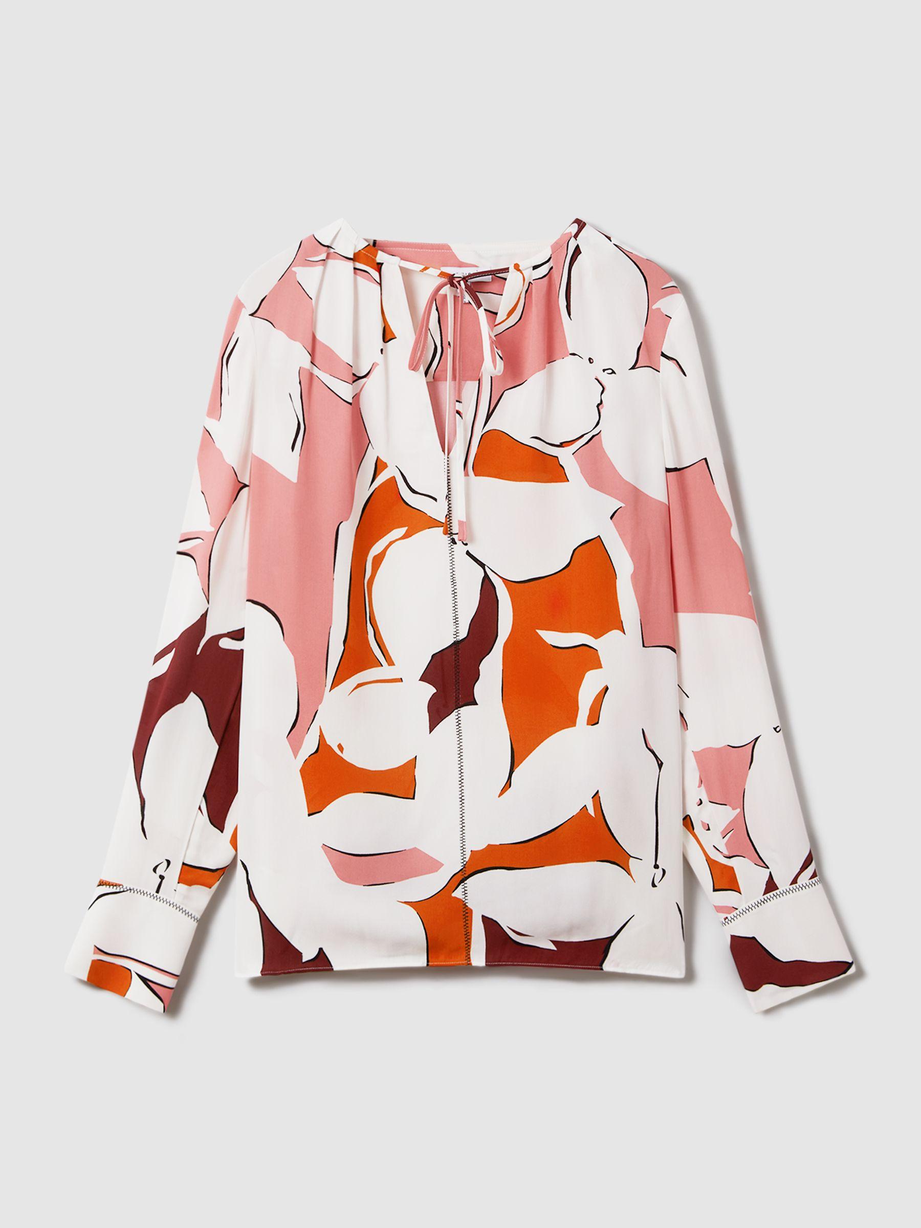 The Tess blouse is detailed in an abstract floral print with contrast stitch detailing. Pleats and a tie neck complete the front for added elegance. Pleats to front Abstract floral print Tie neck Buttoned cuffs Split hem The model is wearing a size 8 Measurements of model: 5ft9" / 175cm