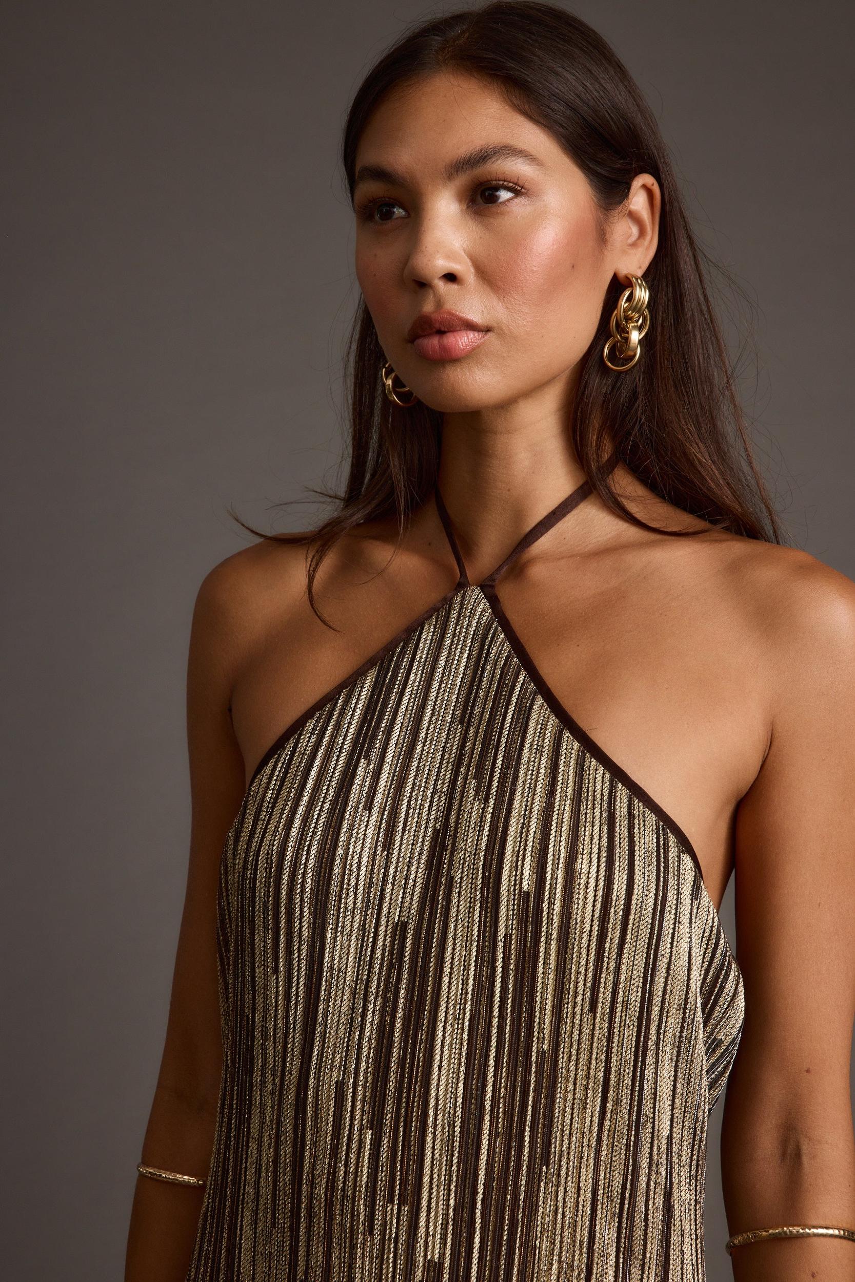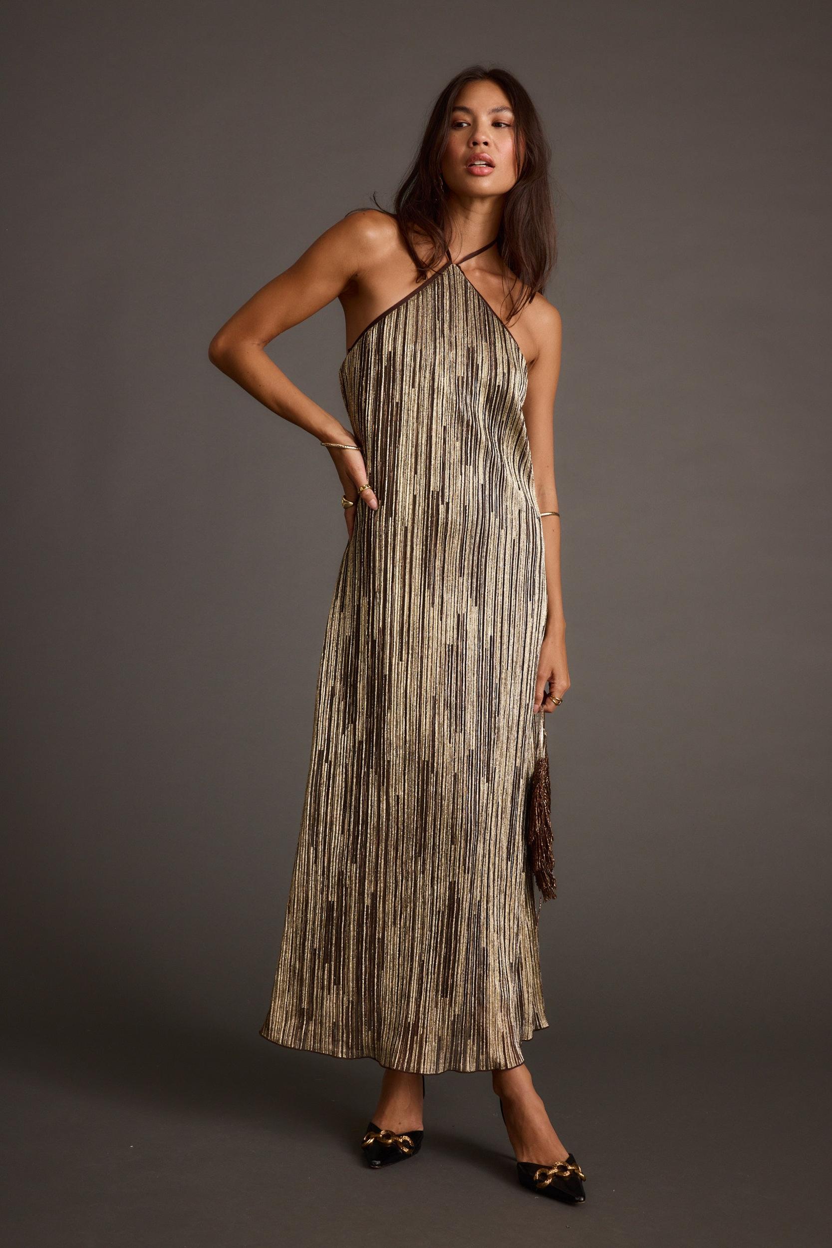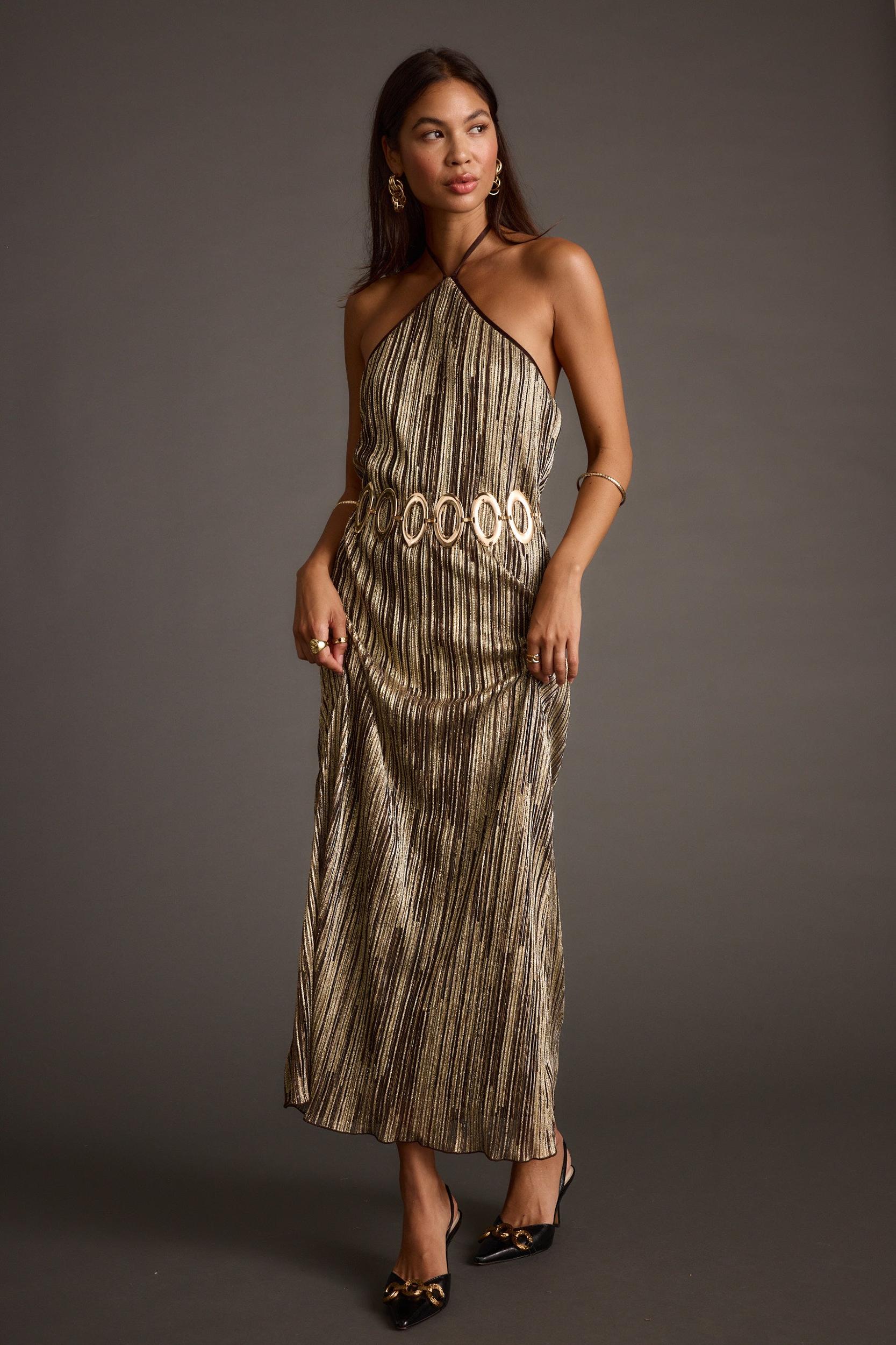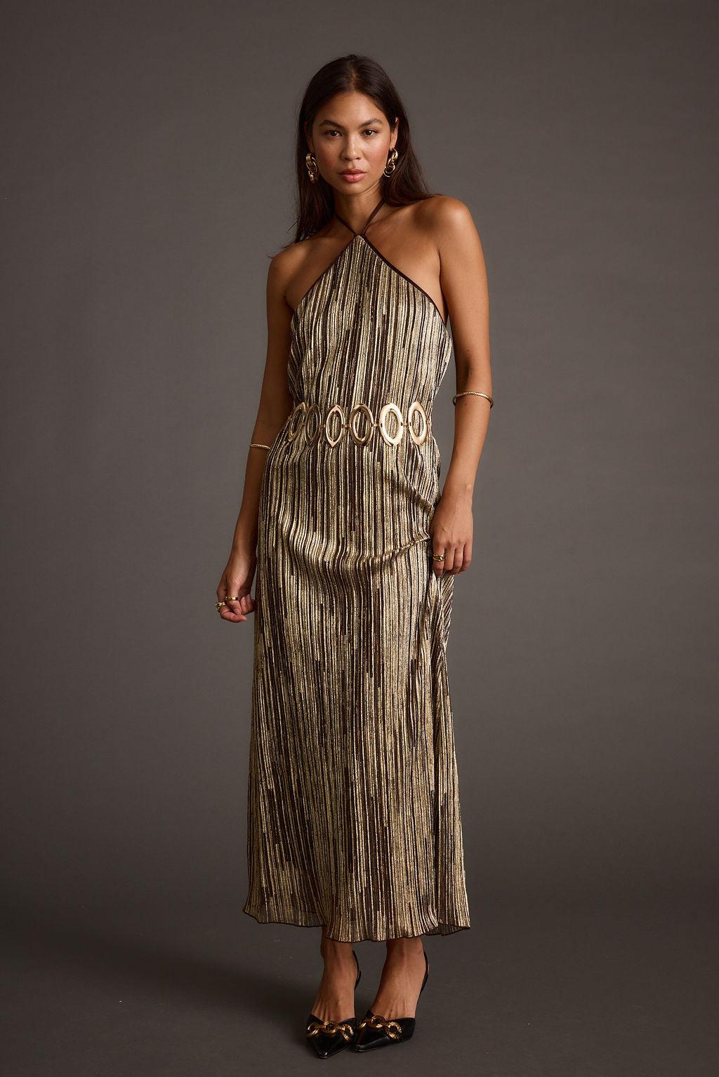 The Prism Metallic Halter Maxi Dress was made for movement. Its liquid-gold pleats shimmer with every step, giving you that holiday glow from dinner to dance floor. Style with a sleek bun and minimal jewelry for an effortless finish.Discover more holiday-ready outfits