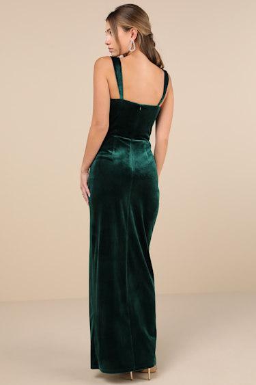 Strut your way through any evening feeling like the epitome of elegance with the Lulus Pristine Luxury Emerald Green Velvet Bustier Maxi Dress! Stretchy and soft velvet velour shapes this glamorous dress that features tapered shoulder straps and a bustier-inspired bodice with supportive boning across the front and a notched, straight neckline (with hidden V-bar support). The high, fitted waist tops a figure-skimming column skirt that falls to a chic maxi hem with a flirty side slit. Hidden back zipper/clasp.