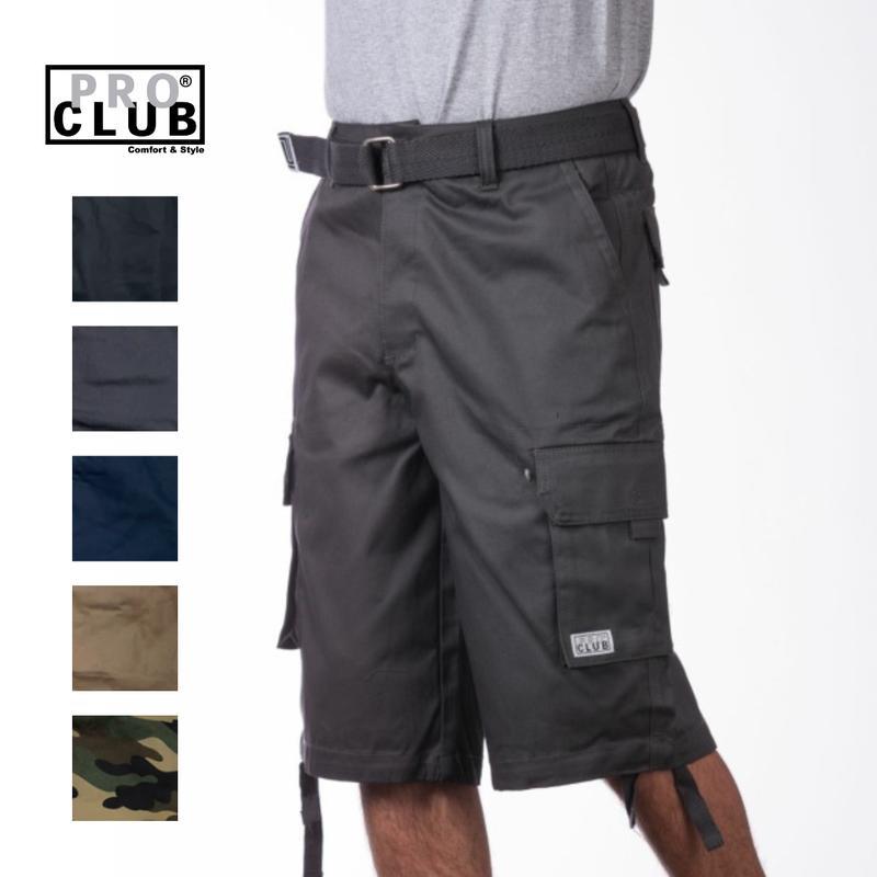 These cargo shorts feature six pockets and removable woven belt for the ultimate combination of style, utility, and comfort. 100% Cotton Twill ORIGINAL STYLE - Shorts come with a woven belt and feature six functional pockets: two side pockets, two rear pockets with velcro-closure flaps, and two side cargo pockets with velcro-closure flaps to hold all of your gear and then some! Ideal for summer and warm weather. PERFECT FIT - A relaxed fit with long inseam of 13.5 inches designed to fall below or at the knees depending on height. Removable woven belt provides easy adjustments. COMFORT - Crafted from 100% cotton woven twill, these shorts are breathable and comfortable, yet still durable and rugged. QUALITY - Pro Club is renown for over 30 years of quality product. Your mission for style and comfort ends here. STYLE DETAILS - Zipper fly with button closure. Removable drawstrings on leg openings. FABRIC CARE - Machine wash cold / tumble dry low. * The belt can vary between two different variations.