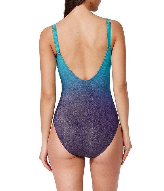 From Profile by Gottex, this one piece swimsuit features: Shimmer fabrication Tank silhouette Ombre print V-neckline Built-in soft cups Adjustable straps Tummy control Moderate coverage Front and back lining Pull-on construction Recycled nylon/extra life lycra knitted Hand wash Imported.