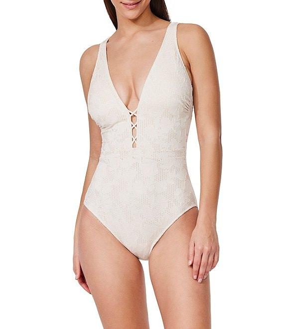 From Profile by Gottex, this one piece swimsuit features: Texture fabrication Plunge silhouette V-neckline Built-in soft cups Adjustable straps Lace overlay Moderate coverage Lined Pull-on construction Recycled nylon/extra life lycra Hand wash Imported.