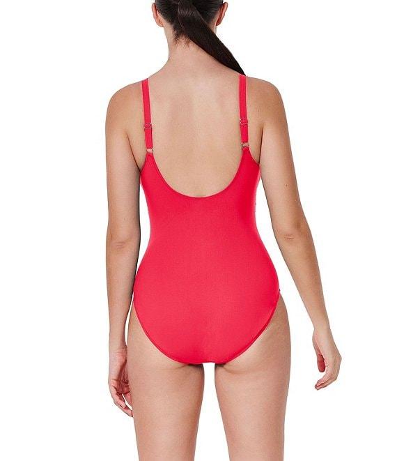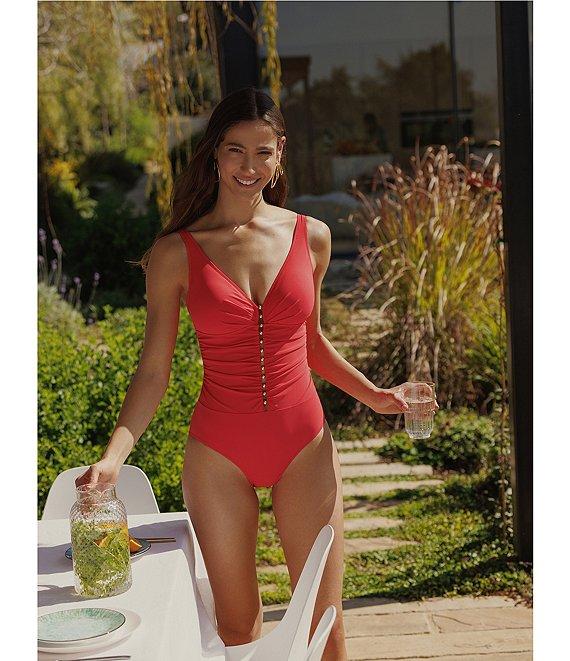 From Profile by Gottex, this one piece swimsuit features: Tank silhouette V-neckline Built-in soft cups D-cup size bra Adjustable straps Gold beaded ladder detail Side shirred detail Tummy control Open back Moderate coverage Lined Pull-on construction Recycled nylon/extra life lycra knitted Hand wash Imported.
