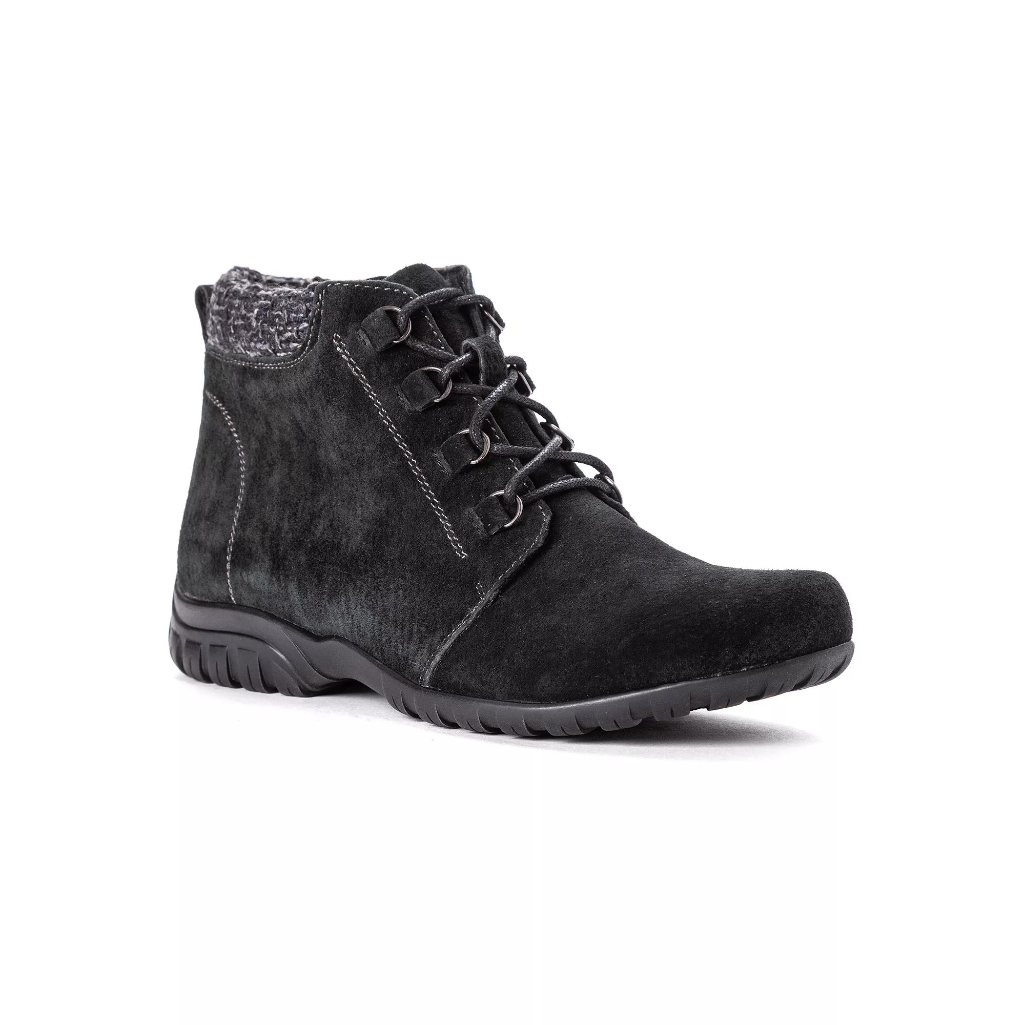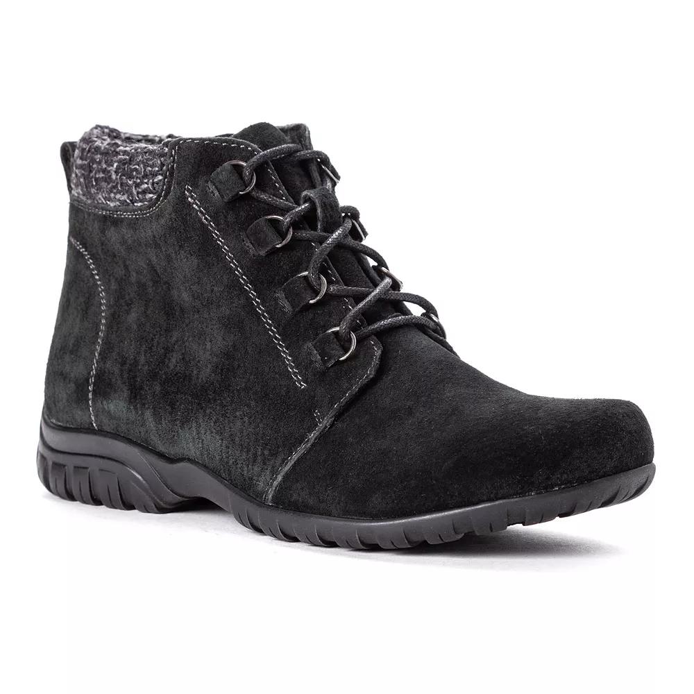 These Delaney boots from Propet are great for your everyday activities. Click this FOOTWEAR GUIDE to find the perfect fit and more! - https://www.kohls.com/feature/shoesizeguide.jsp. BOOT FEATURES: Scotchgard treated suede, Padded tongue & collar, Side zipper allows for easy on/off, Traction sole. BOOT CONSTRUCTION: Suede, textile upper, Mesh lining, Rubber outsole. BOOT DETAILS: Round toe, Zipper & lace-up closure, Padded footbed, 1-in. platform, 12-in. circumference, 4-in. shaft. Size: 6.5 Wide. Color: Black Suede. Gender: female. Age Group: adult.