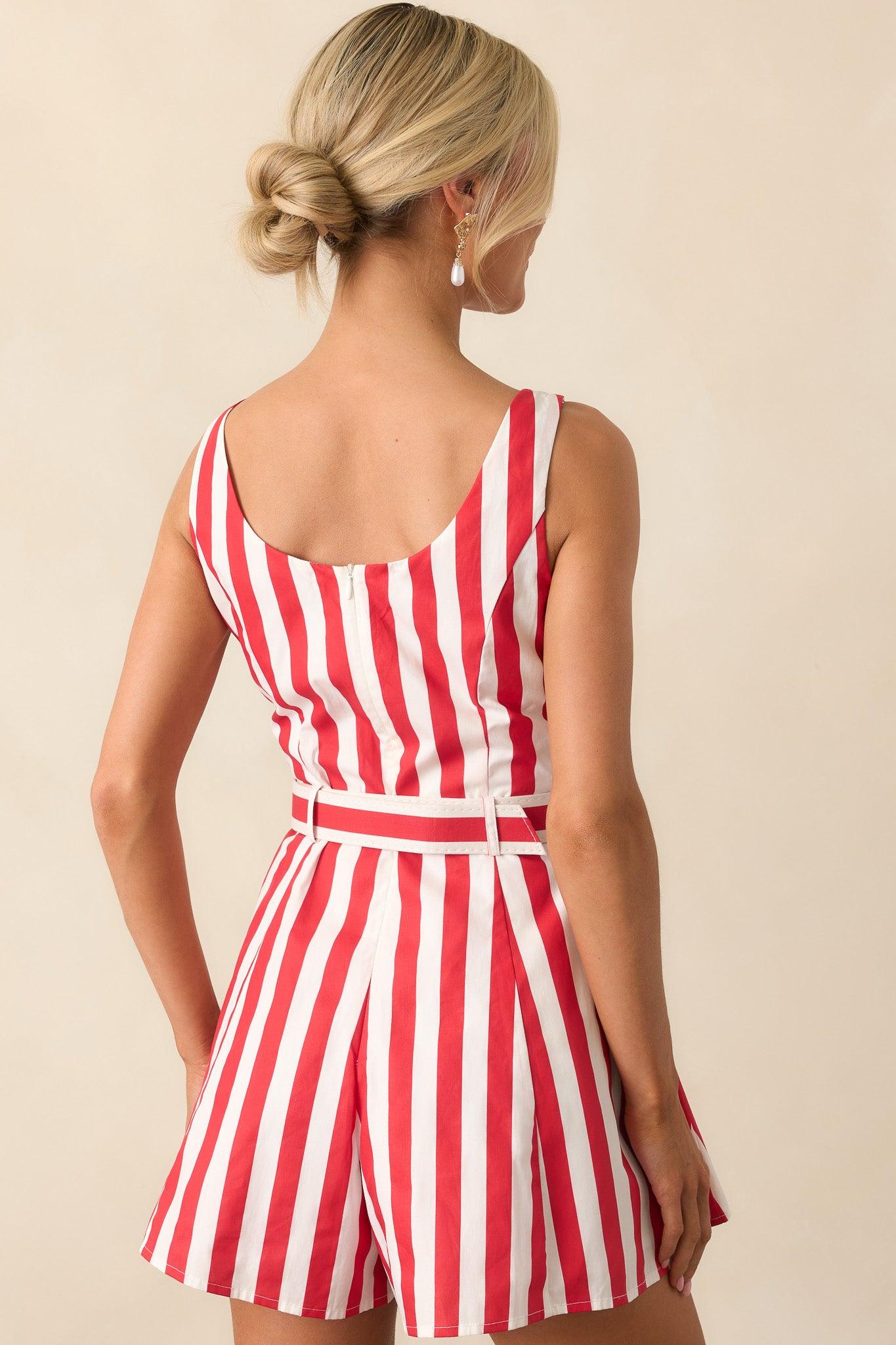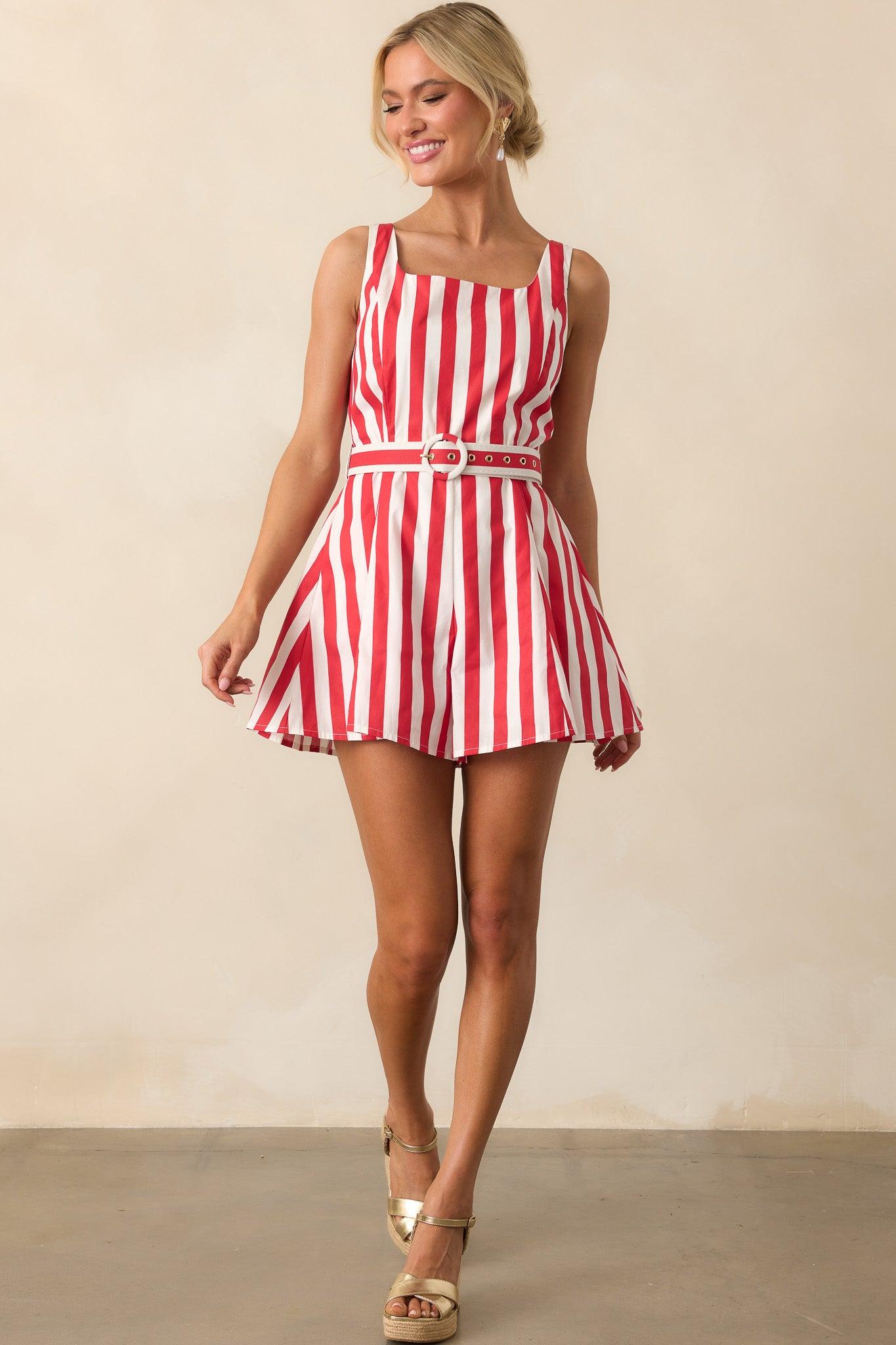 Experience comfort and style with the Prosperina Alessandra Red Stripe Cotton Romper! Made with soft, breathable cotton fabric, this romper features a trendy red stripe design. The perfect piece for any summer adventure, it will keep you cool and stylish all day long. This red stripe romper features a discrete back zipper, functional belt loops, a matching belt, two functional side pockets, a flared bottom design, and a squared neckline.