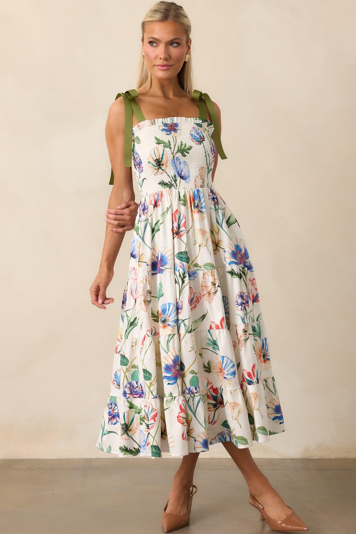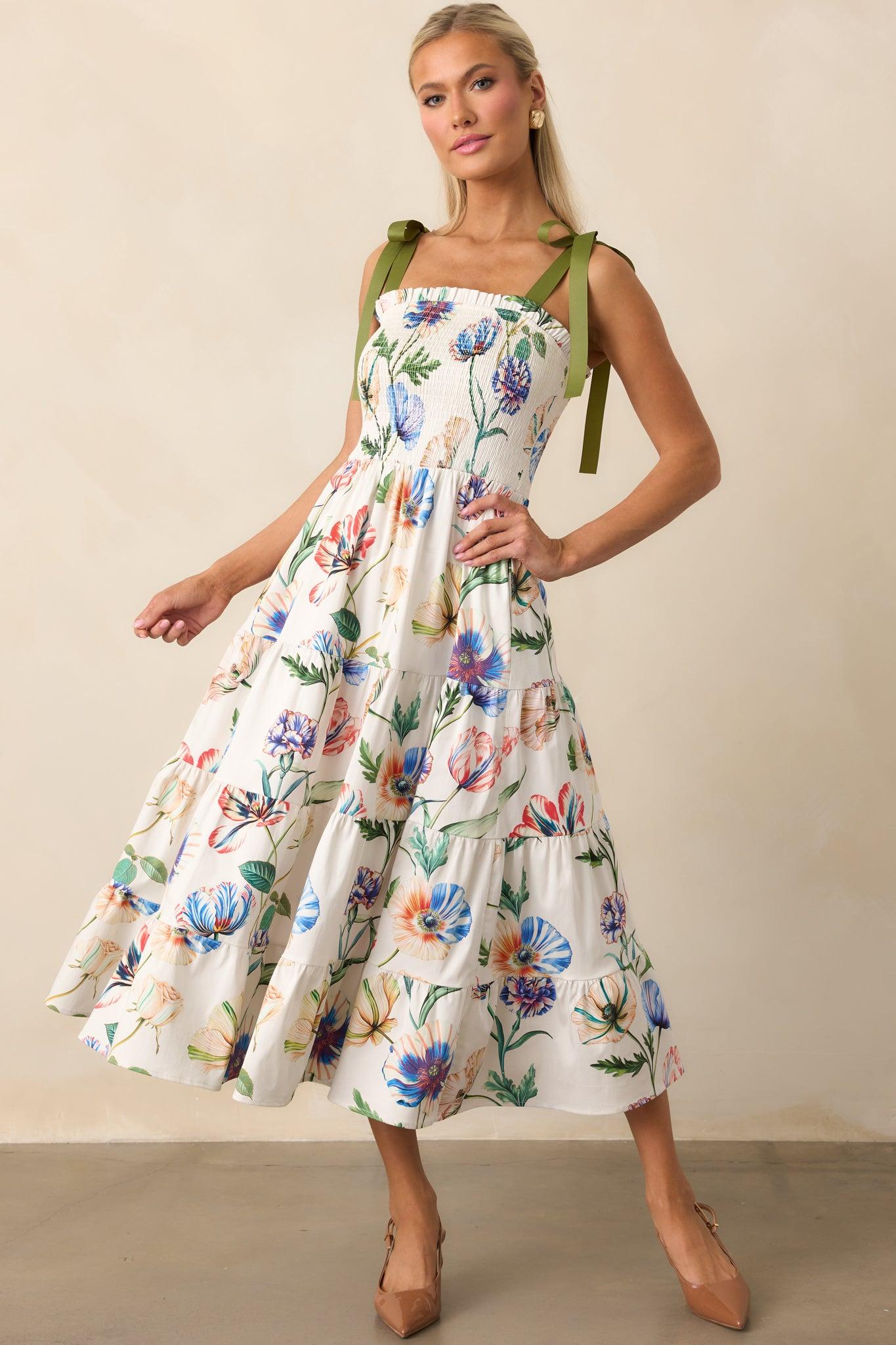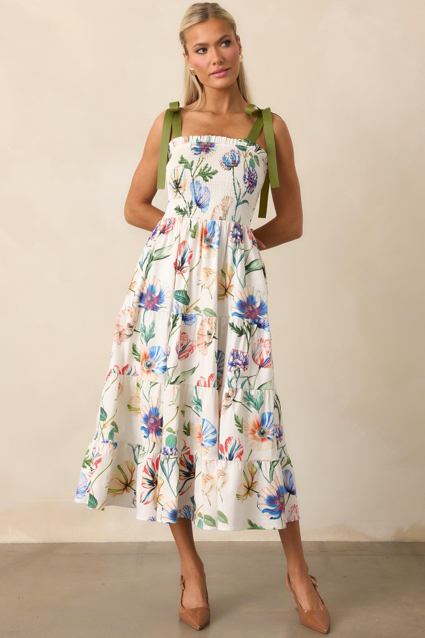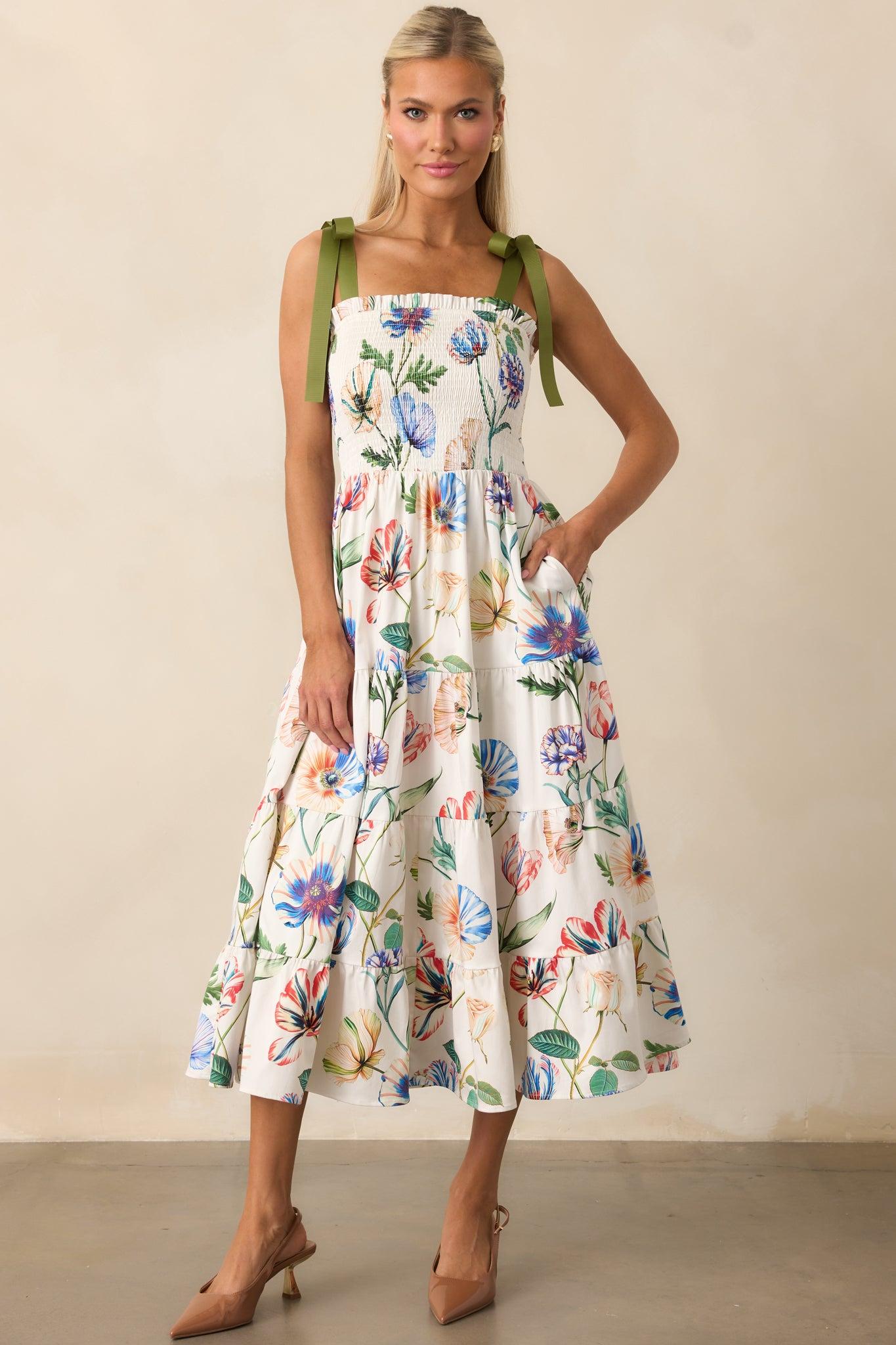 The Prosperina Aurea Ivory Multi Floral Print Cotton Midi Dress has a timeless sweetness, made for moments that feel easy, graceful, and just a little bit special. This ivory midi dress features an exclusive Prosperina multicolor floral print, green adjustable self-tie bow straps, square neckline with ruffle trim, fully smocked bodice, tiered skirt, white lining, and functional pockets. 97% Cotton & 3% Spandex Lined: 100% Rayon Wash inside out, with cold water on a gentle cycle Use mild detergent & avoid bleach Hand wash cold & air dry preferred Manufactured in China & Designed in The USA Model is 5'6" & is wearing an x-small Note: Dress length may vary slightly depending on how the self-tie straps are tied.