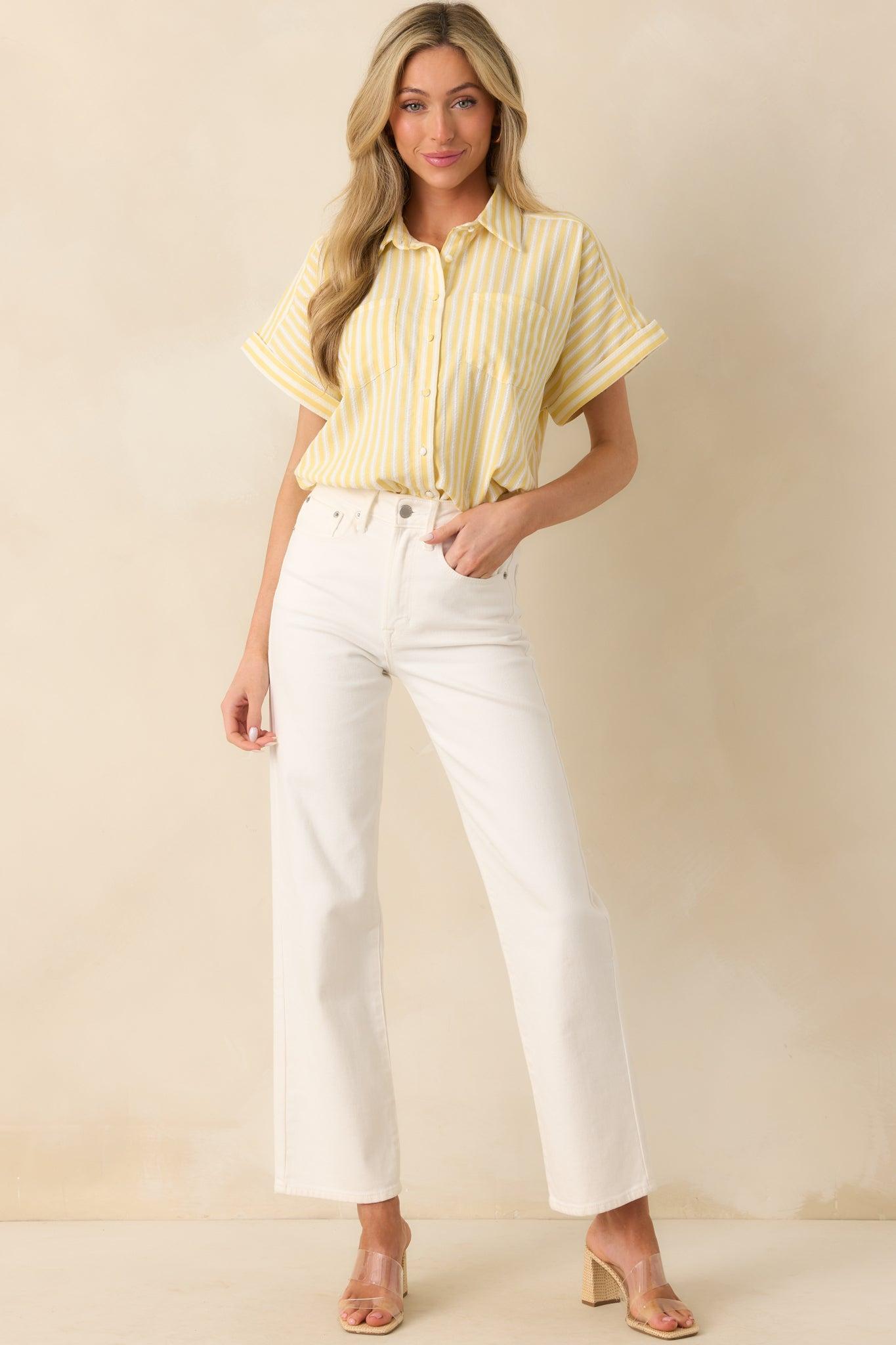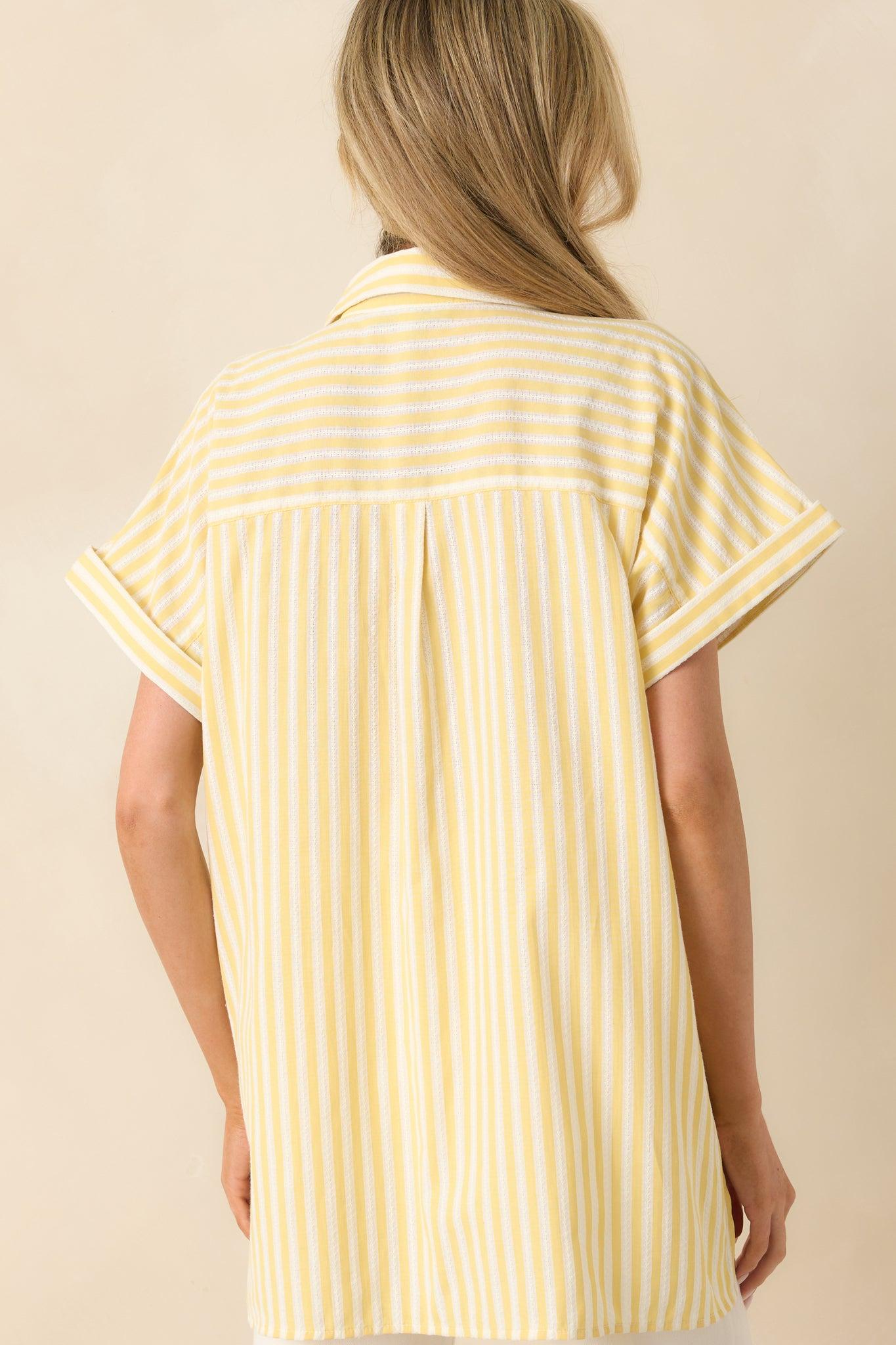 Prosperina Lemonade Yellow Stripe Cotton Brooke Top is a bright spot in any lineup, bringing a playful ease to your wardrobe. Cheerful and uplifting, it’s made for those moments when you want your outfit to match your mood—sunny, light, and all your own. This top features a light lemonade yellow & ivory stripe print, stitch detailing throughout, collared neckline, functional button front, short cuffed sleeves, side vent slits, high low bottom hem, functional breast pockets, and a relaxed fit.