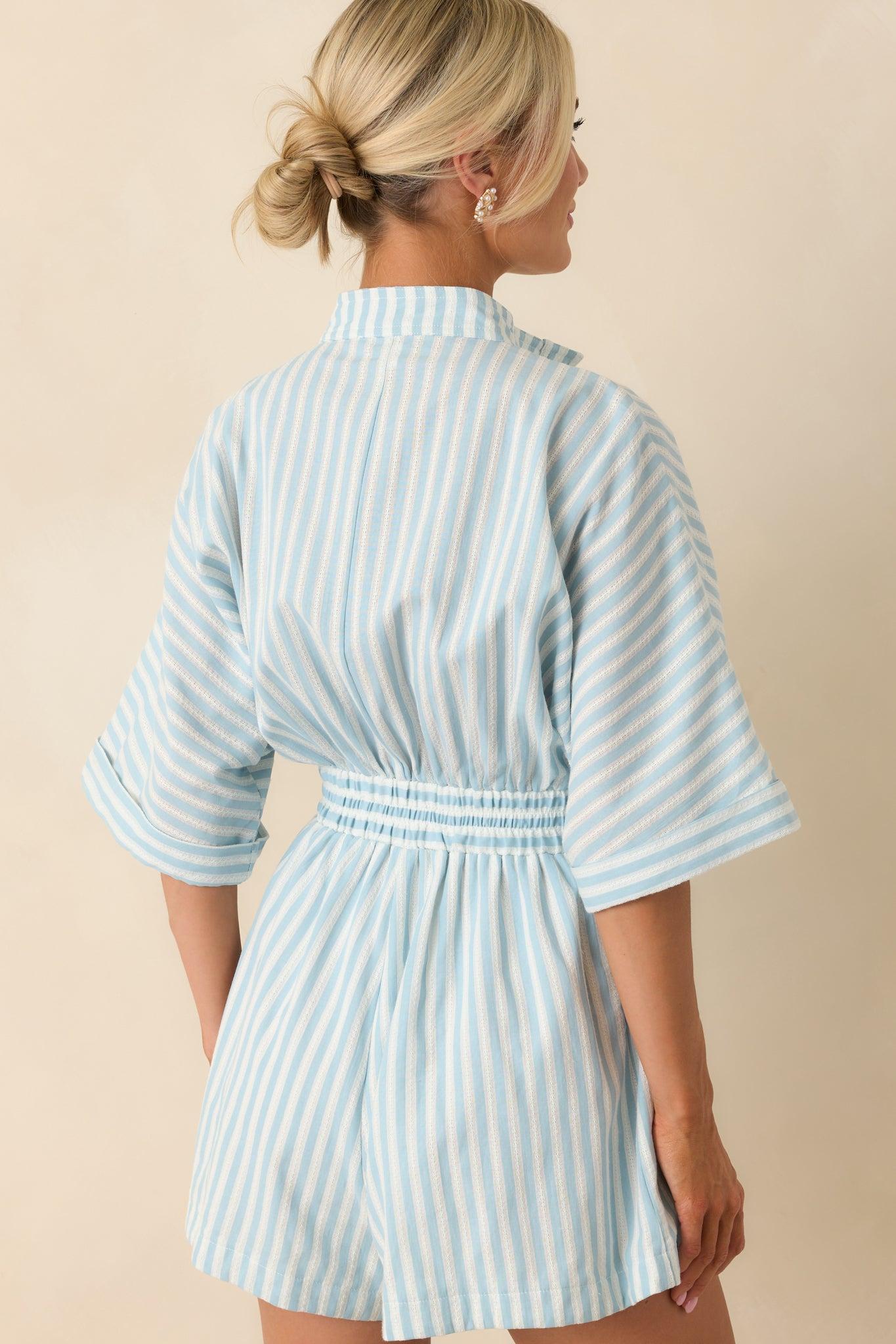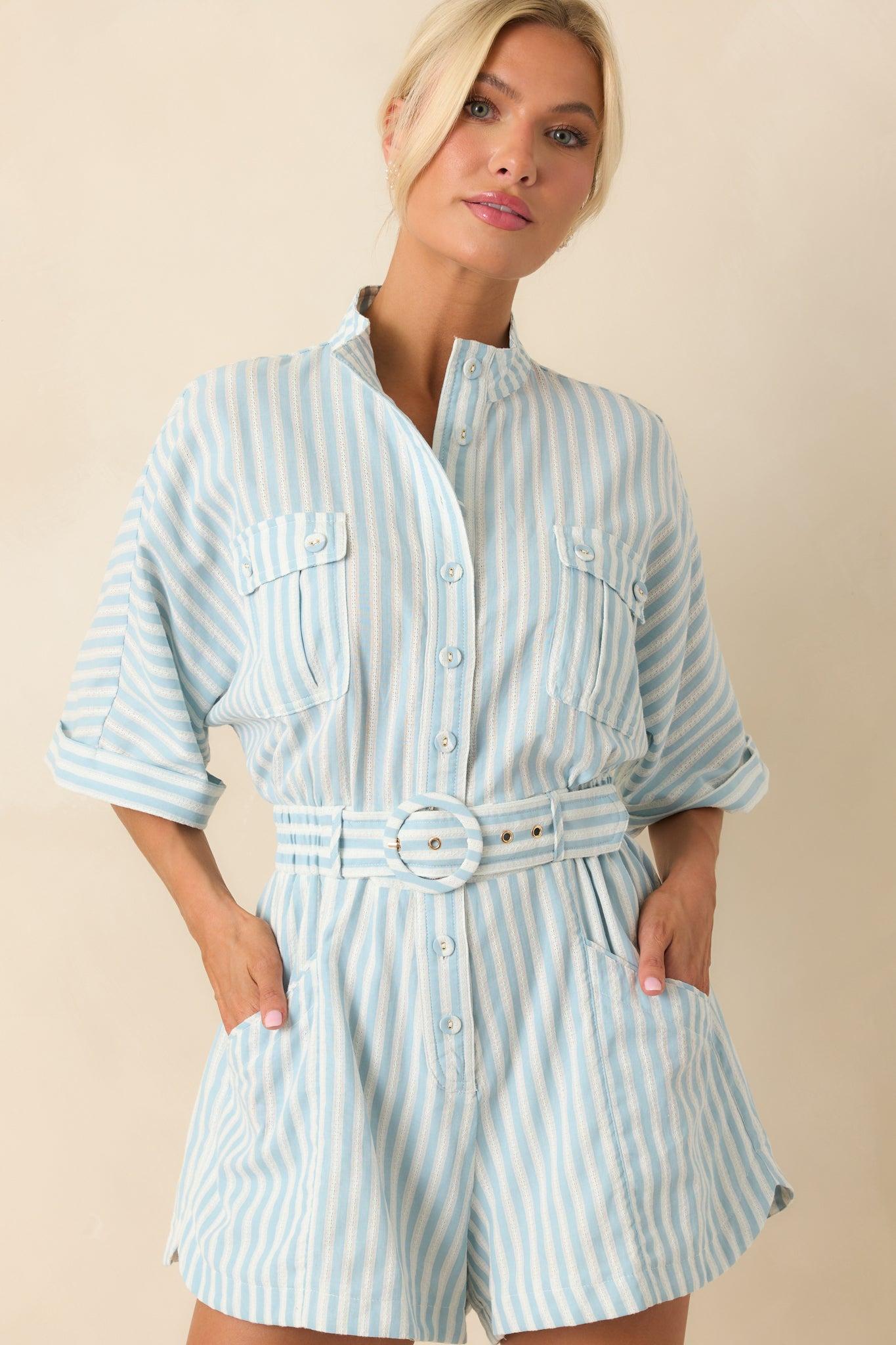 The Prosperina Chloe Blue Aqua Stripe Cotton Romper is all about sunshine and good vibes. With cheerful stripes and a playful feel, it’s perfect for warm days, picnics, or anytime you want your style to radiate brightness and carefree energy. This romper features a light aqua blue & ivory stripe print, stitch detailing throughout, collared neckline, functional button front, oversized cuffed short sleeves, elastic waist, adjustable front belted waist, functional breast pockets, and functional front patch pockets.