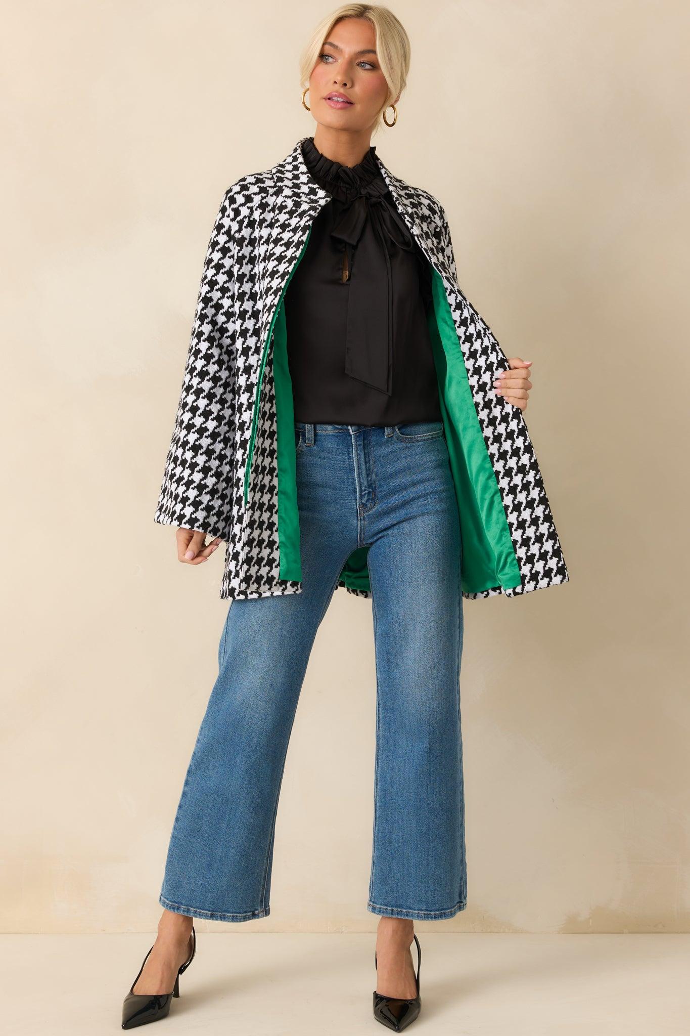 The Prosperina Deveraux Black & White Houndstooth Car Coat brings a classic statement to an effortlessly polished silhouette. Designed with a timeless houndstooth pattern, this piece feels elevated yet easy to style. This coat features a black-and-white houndstooth woven fabric, a collared neckline, long sleeves, functional front buttons, functional side pockets, and a fully lined interior with a smooth texture and hip-length fit.100% PolyesterLining: 97% Polyester & 3% Spandex Wash inside out, with cold water on a gentle cycleUse mild detergent & avoid bleach Hand wash cold & air dry preferred Manufactured in China & Designed in The USAModel is 5'8" and is Wearing a Size X-Small