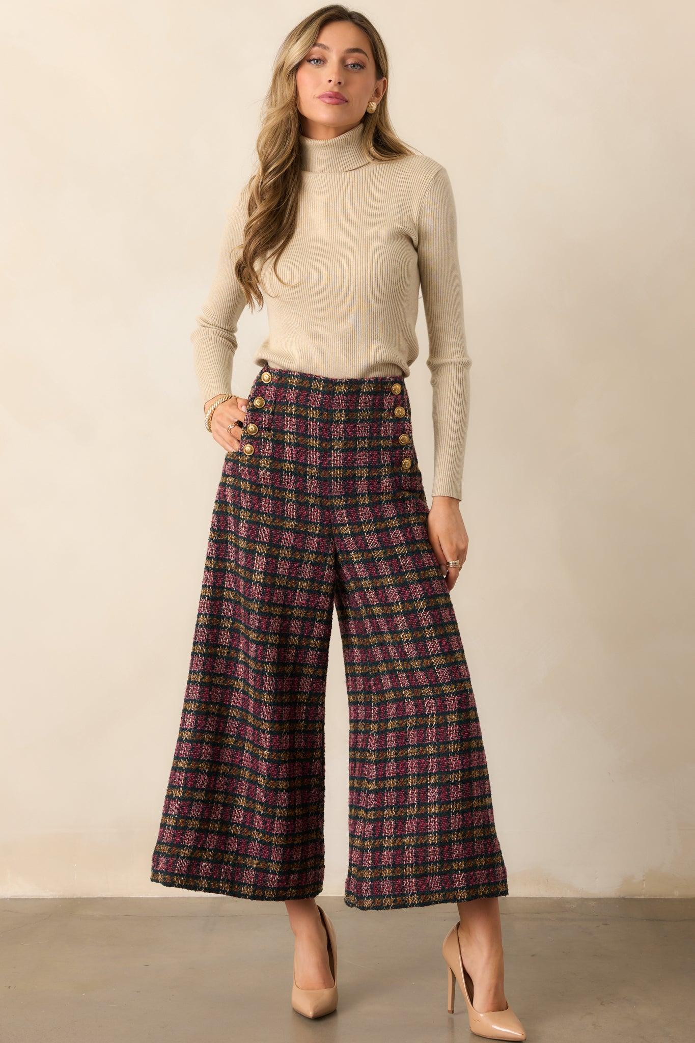 The Prosperina Dietrich Pink Multi Plaid Tweed Pants bring tailored sophistication, a classic tweed design with timeless feminine polish. These tailored high-rise pants feature a pink and green multi-color plaid tweed fabric, featuring a wide-leg cropped silhouette, functional gold crest buttons, functional pockets, and a concealed back zipper closure. 80% Polyester & 20% Nylon Lined: 97% Polyester & 3% Spandex Wash inside out, with cold water on a gentle cycle Use mild detergent & avoid bleach Hand wash cold & air dry preferred Manufactured in China & Designed in The USA Model is 5'6" & is Wearing a Size X-small
