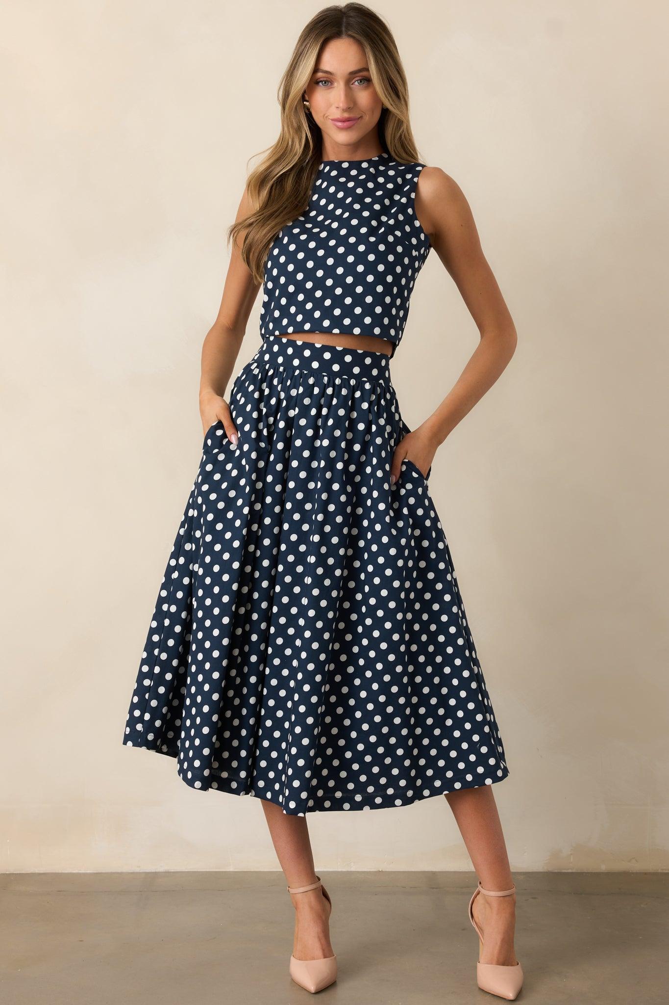 the Prosperina Erica Navy Polka Dot Cotton Midi Skirt has a graceful ease that works in any setting. Its flowing silhouette and classic feel make it a piece you’ll reach for whenever you want something effortlessly refined. This midi skirt features a navy and white polka dot print, an elastic back waist insert, full navy lining, and functional pockets. 100% Cotton Lined: 100% Cotton Wash inside out, with cold water on a gentle cycle Use mild detergent & avoid bleach Hand wash cold & air dry preferred Manufactured in China & Designed in The USA Model is 5'8" & is wearing an x-small