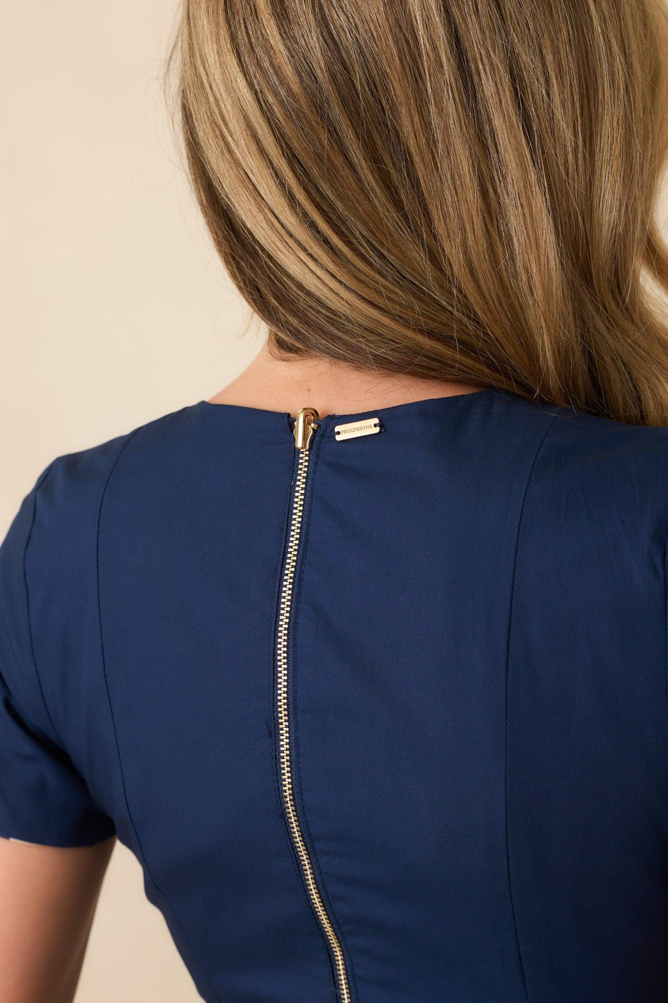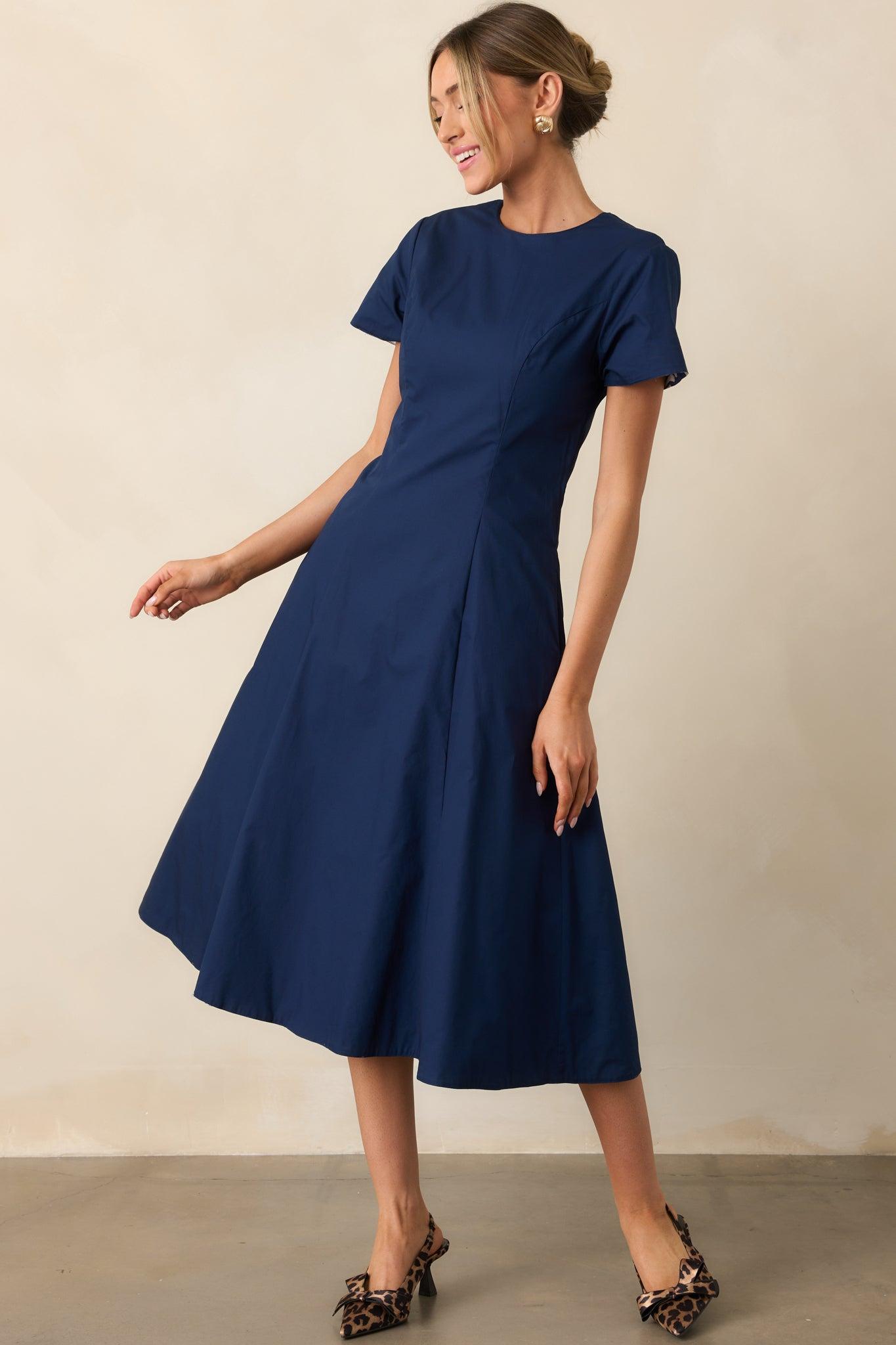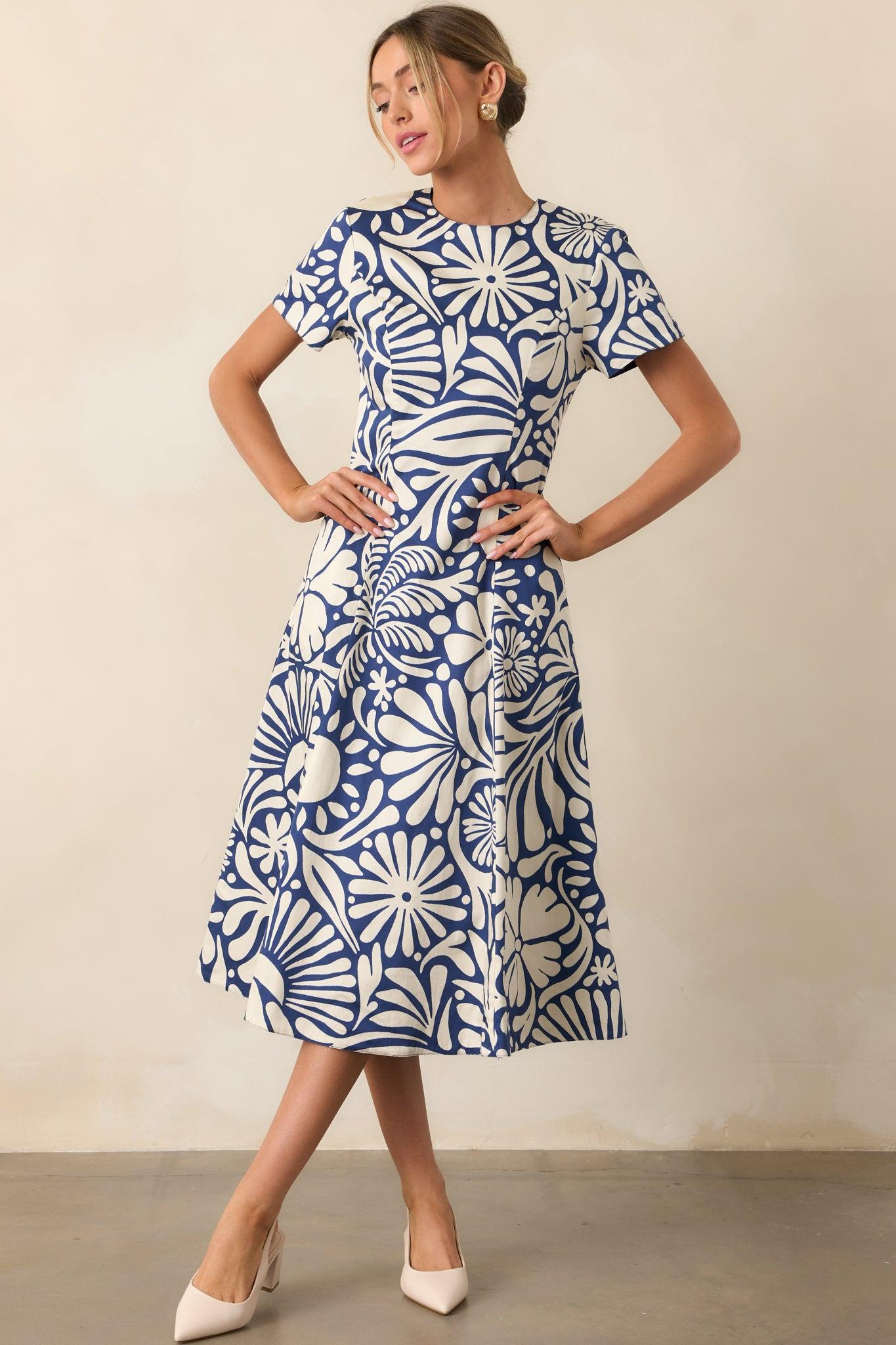 The Prosperina Margot Navy Floral Print Cotton Reversible Midi Dress captures an elegance that feels timeless. With its classic floral and versatile design, it’s a piece that fits beautifully into any season. This midi dress features a reversible design, an exclusive Prosperina Navy Mod Blossom floral print on one side, a solid navy fabric on the other side, a round neckline, short sleeves, a back zipper closure, a fitted waist, flowy skirt, and functional pockets.