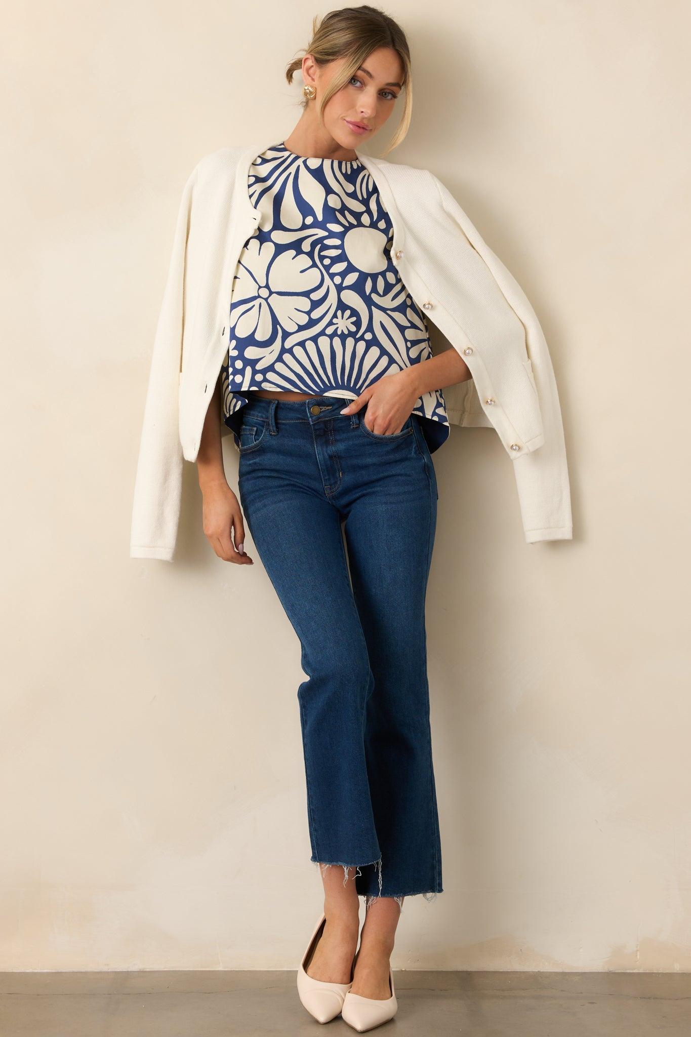 The Prosperina Marley Navy Floral Print Cotton Reversible Top brings a sense of easy versatility to your wardrobe. It’s the kind of piece that adapts effortlessly to whatever the day calls for. This top features an exclusive Prosperina Navy Mod Blossom floral print on one side, a solid navy fabric on the other side, round neckline, back keyhole button closure, sleeveless design, and a scoop bottom hem with a longer back.