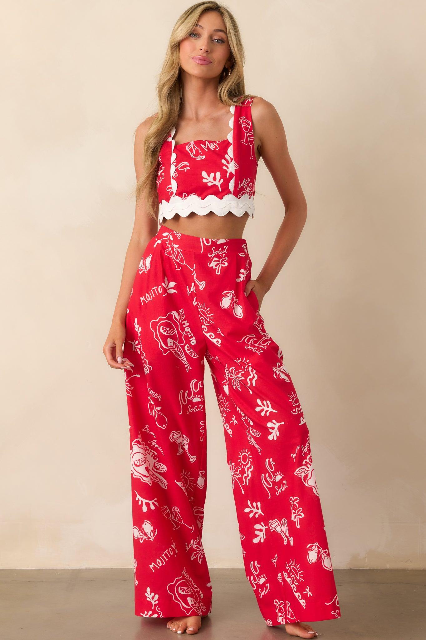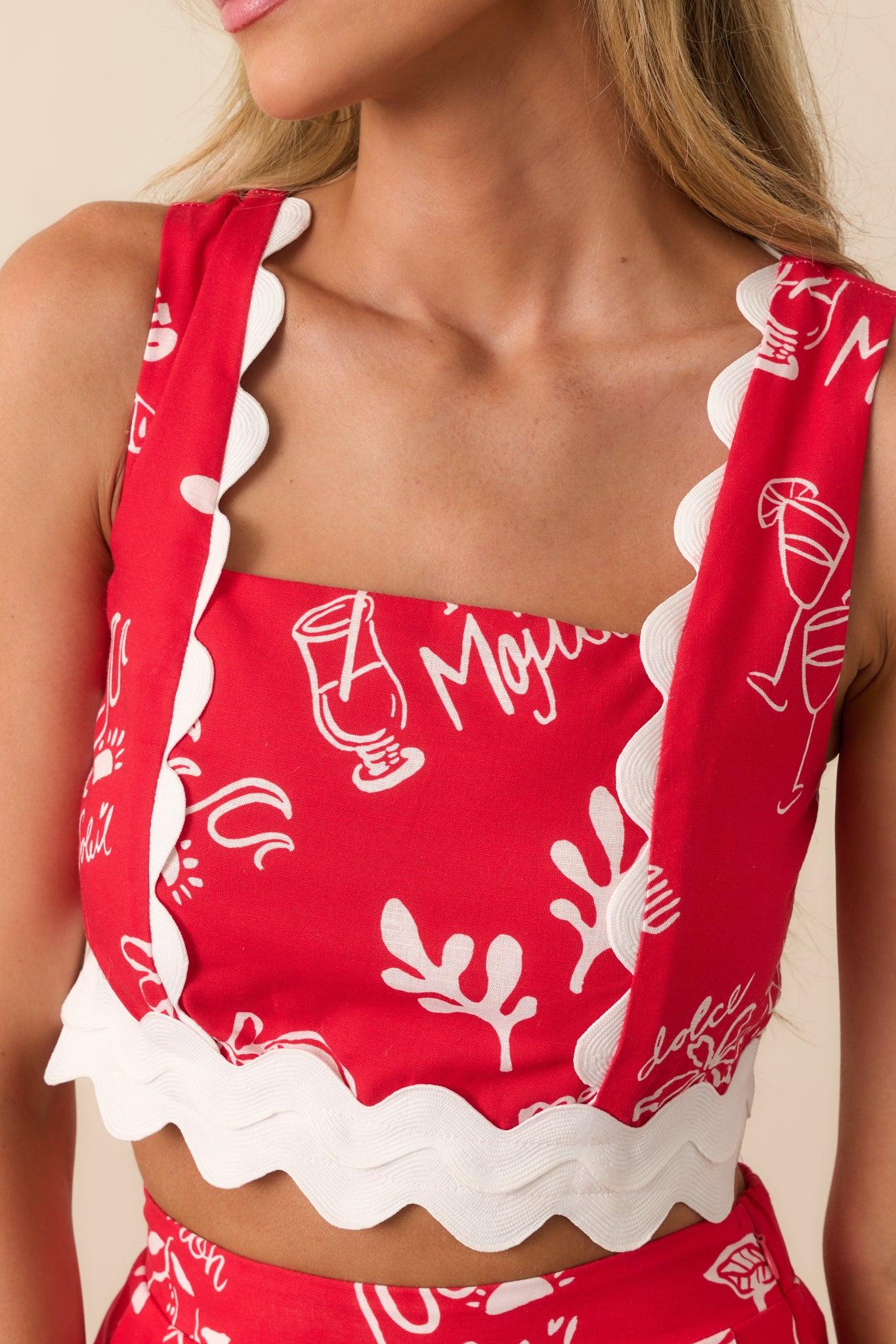 Unleash your unique style with the Prosperina Mia Red Mojito Print Scallop Crop Top. The vibrant print and scallop detailing add a touch of fun and femininity to any outfit. Stand out from the crowd and exude confidence with this must-have fashion piece! This red top features a white ric rac hemline, a white scallop design along the straps, a squared neckline, a cropped design, a smocked back panel, and a gold hardware back zipper.