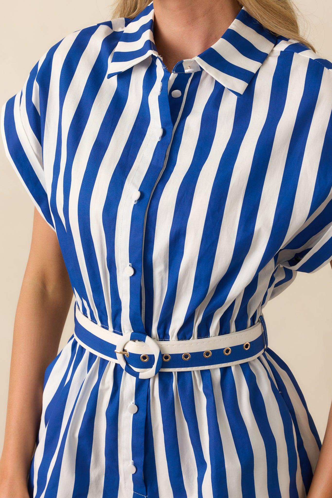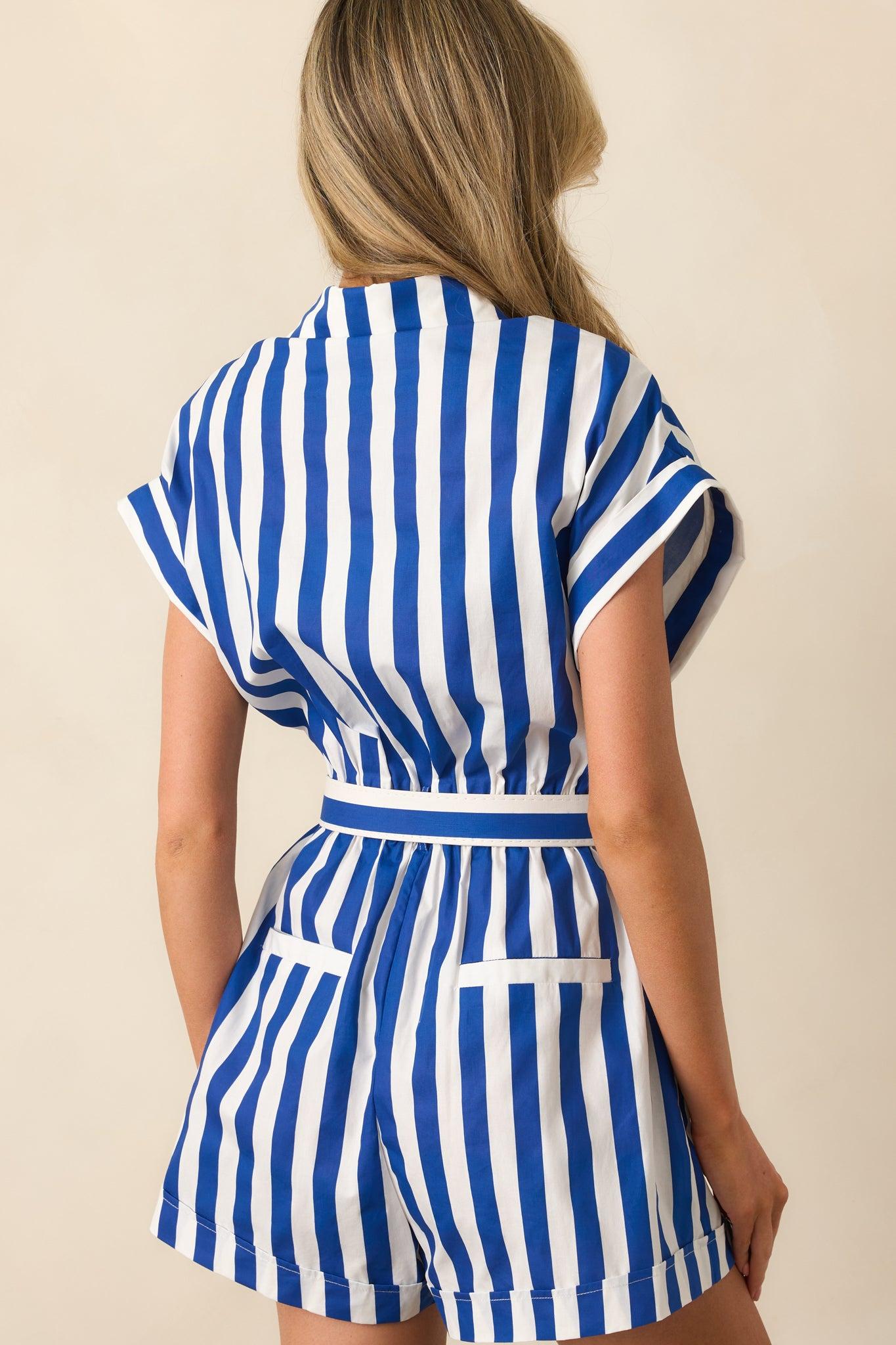 Looking for the perfect summer outfit? The Prosperina Natalia Royal Blue Stripe Cotton Romper is versatile, comfortable, and stylish. Made with soft cotton material, it's perfect for warm weather. The royal blue stripes add a fun pop of color, making it a must-have addition to your wardrobe. This blue stripe romper features a functional pearlescent button front design, a collared neckline, functional belt loops, an elastic waist band, a matching striped belt, two functional side pockets, two faux back pockets, and cuffed cap sleeves.