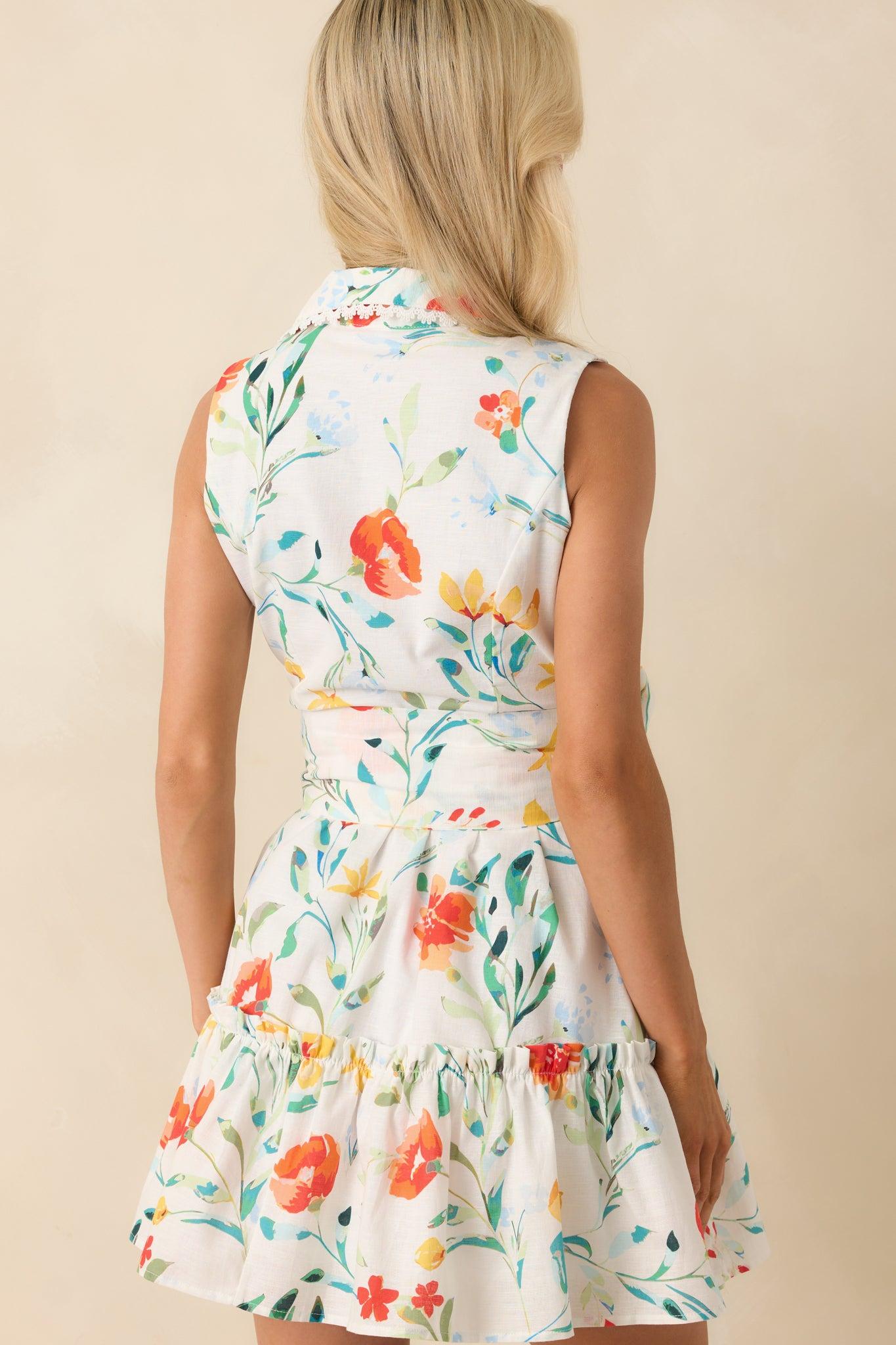 Prosperina Ivory Cotton Wild Poppies Print Poppie Mini Dress is a little celebration of all things in bloom. Lighthearted and full of charm, it’s made for the days that feel fresh, open, and just a bit more alive. This ivory mini dress features an exclusive Prosperina multicolor floral print, collared neckline, lace scallop trim detailing, functional button front, sleeveless design, ruffle skirt detailing, and an optional self-tie belt.