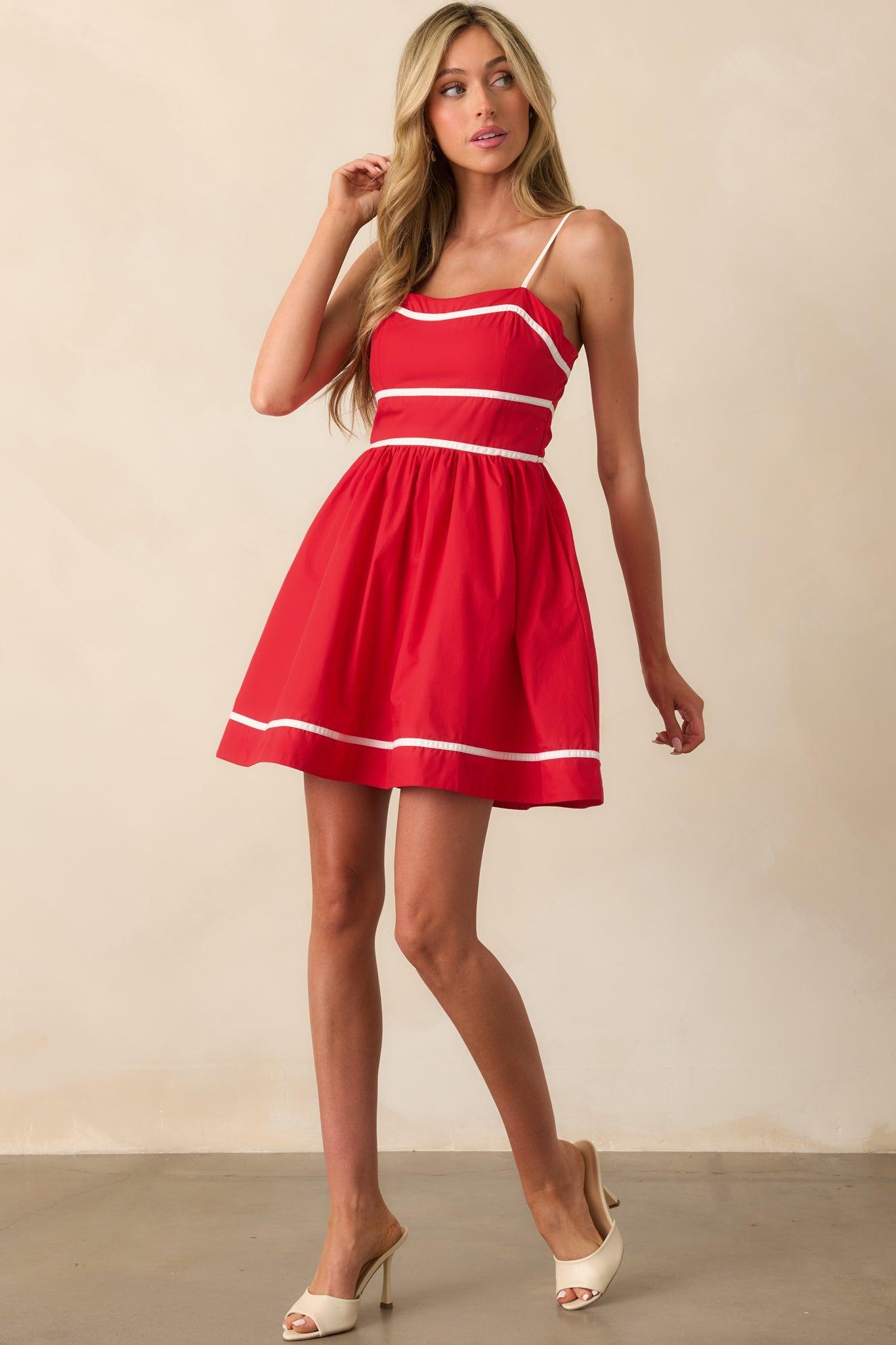Elevate your wardrobe with our stunning Prosperina Veronica Red Cotton Romper Dress! Made with high-quality cotton, this dress offers comfort and style. Its elegant design and vibrant color will surely turn heads. Perfect for summer occasions, this dress will make you look and feel confident. Add it to your closet today! This red dress features adjustable straps, two functional side pockets, white piping trim details throughout, a smocked back panel, a discrete back zipper, built in red shorts, and a self tie back bow.