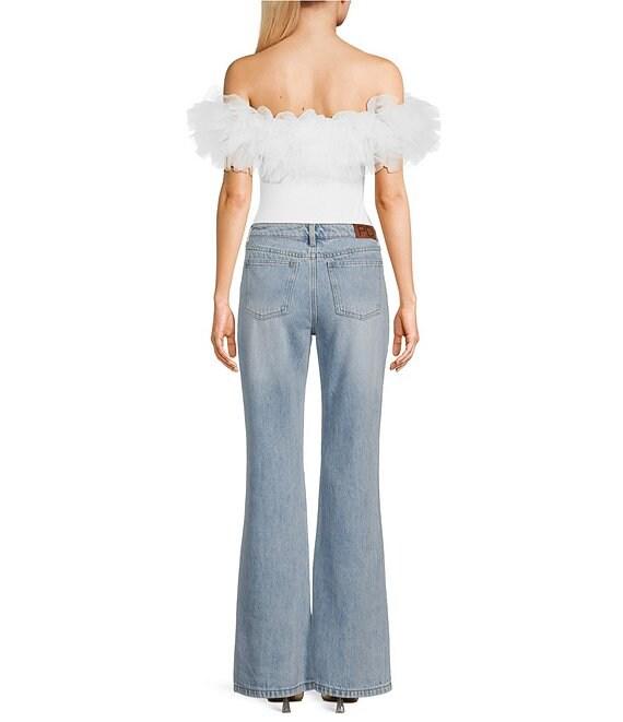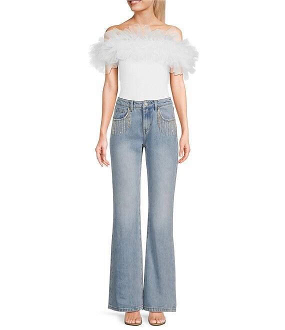 From Prosperity Denim, these jeans feature: High rise Rhinestone embellishments and fringed trim at the pockets Bootcut legs Zip/button-front closure Belt loops 32" inseam Cotton/Tencel™ Machine wash/tumble dry Imported.
