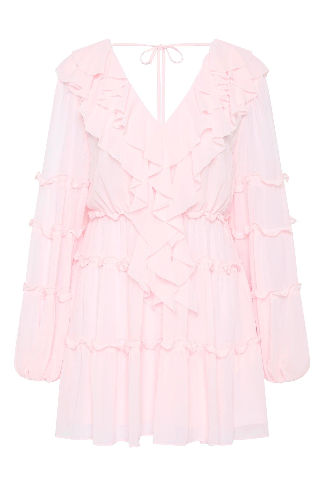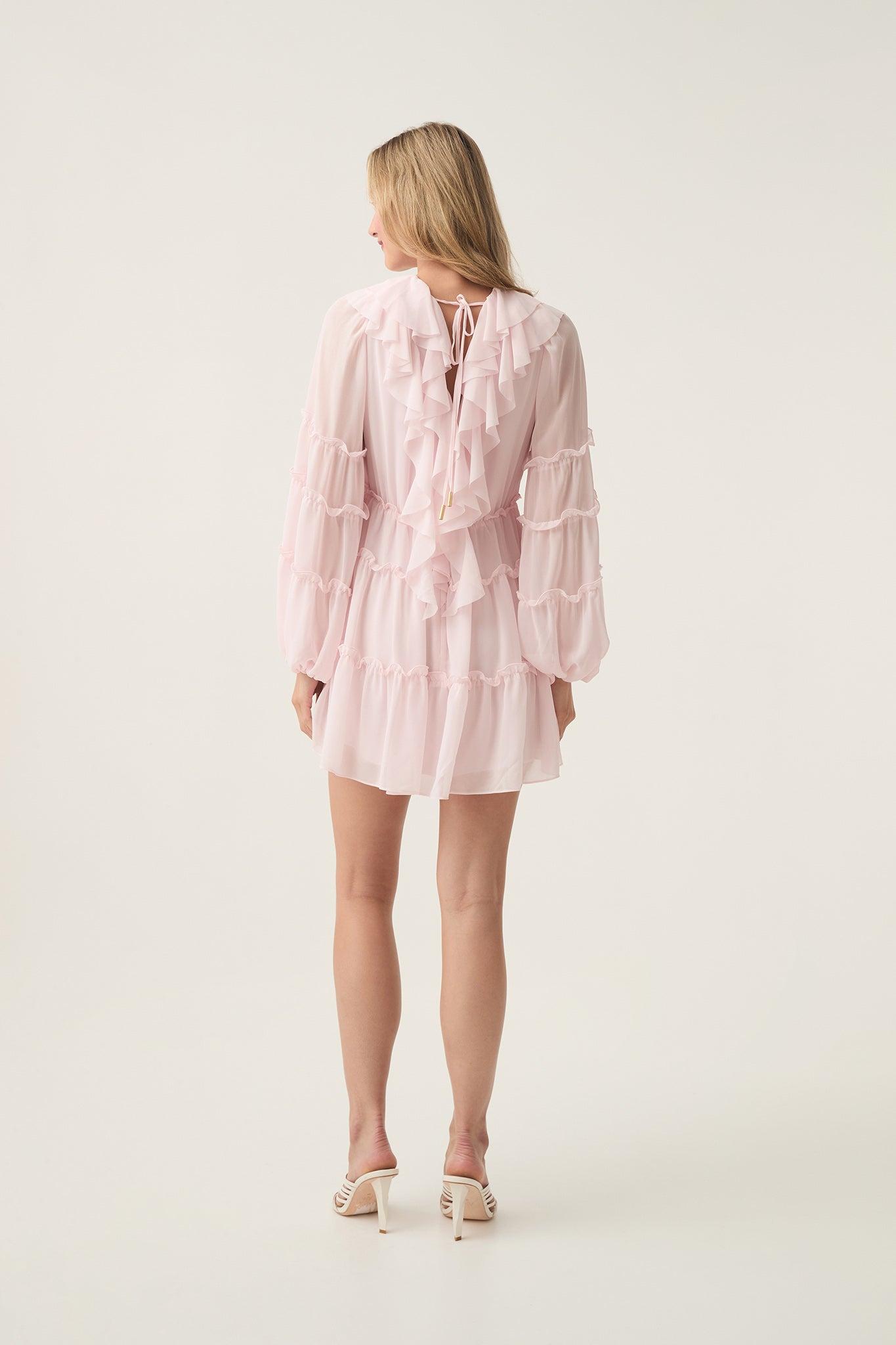 PRODUCT DETAILS Women's mini dress Relaxed fit Deep V-neckline with frill detail Blouson sleeves with elastic cuff Back and neck ties Tiered skirt with ruffles Lined through body Unlined through sleeves 100% Recycled Polyester Shop All Dresses SIZE AND FIT Model wears a size AU 8/S Height: 175cm/ 5’9 Bust: 81cm Waist: 60cm Hips: 89cm