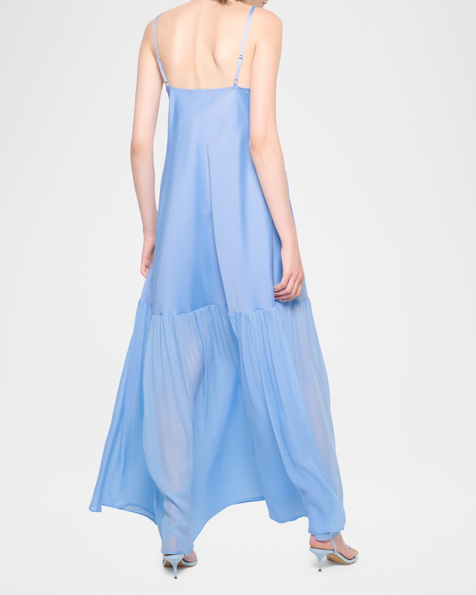 AS by DF "Provence" satin dress with a ruffled semi-sheer hem Approx. 52"L from shoulder to hem Deep V neckline Adjustable straps Full length Slipover style Polyester/viscose/spandex Unlined Dry clean Imported