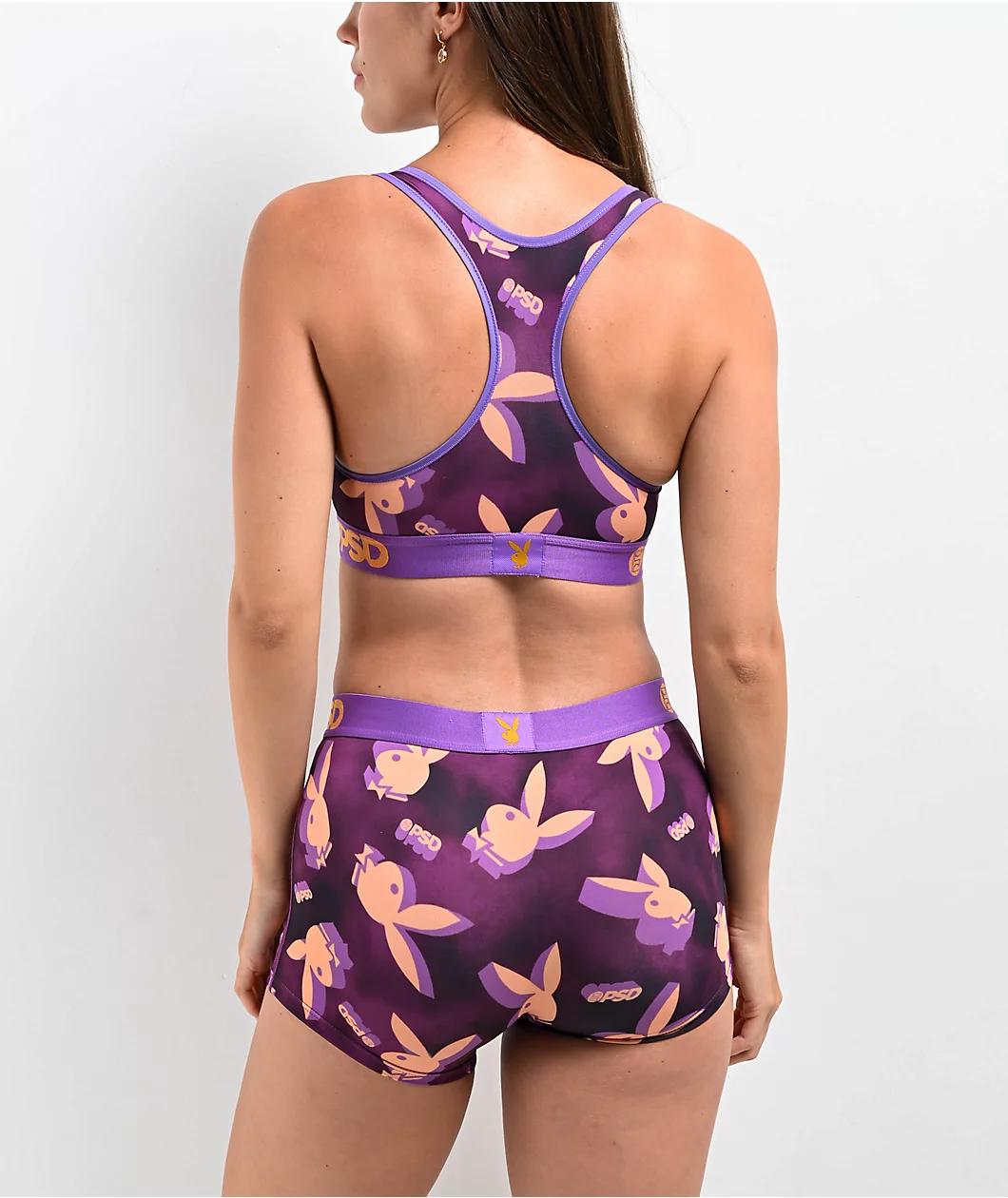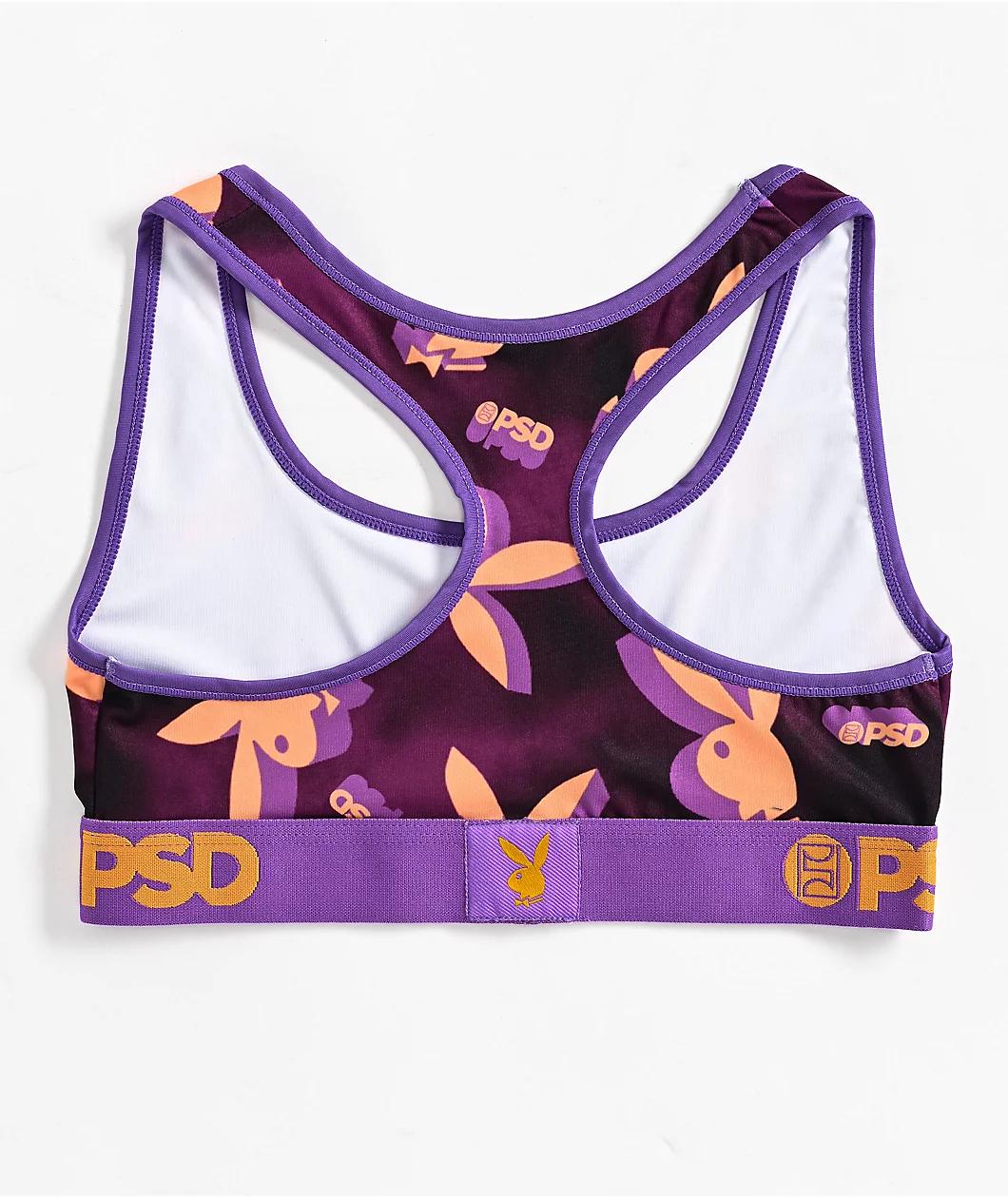 The PSD and Playboy official collaboration introduces the 3D Tumble sports bra. The racerback bra features a pattern of the iconic Playboy Bunny in orange with a purple shadow for a 3D effect. Featuring a slim fit, flatlock seams, and a lined chest,