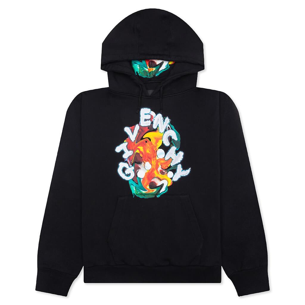 The Givenchy Psychedelic Boxy Fit Hoodie in Black is a statement piece that combines signature elements with psychedelic prints for a unique look. The hoodie features Givenchy's signature logo and psychedelic prints on the front and inside of the hood, adding a bold touch to the design. It comes with a drawstring on the hood for adjustable wear and a one kangaroo pocket on the front. The ribbed hem and cuffs enhance the fit, while the boxy silhouette adds a modern and relaxed style. Boxy fit Psychedelic prints on the front and inside of the hood Drawstring on the hood One kangaroo pocket on the front Ribbed hem and cuffs for Style no: BMJ0LA3YLW-001