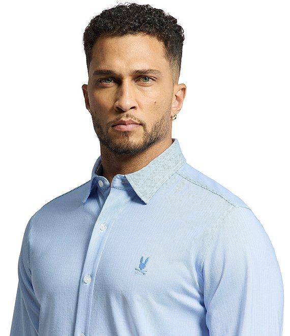 From Psycho Bunny, this dress shirt features: Twill-like look Striped design Spread collar Long sleeves with two-button cuffs Button-front closure Mother-of-pearl buttons Embroidered "Psycho Bunny" logo on the left side of chest Shirttail hem Regular fit Laid-back option that can be dressed up or down Ultra-comfortable Pima cotton Machine wash/tumble dry Imported.