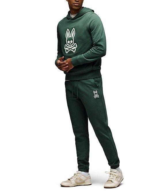 From Psycho Bunny, these sweatpants feature: Solid tone Mid rise Drawstring elastic waist Flat front Welt pockets on the front Embroidered signature "Bunny" on the side Zip pocket on the back Full length Elasticized cuffs Cotton/polyester/viscose Machine wash/tumble dry Imported.