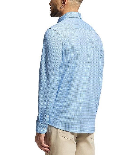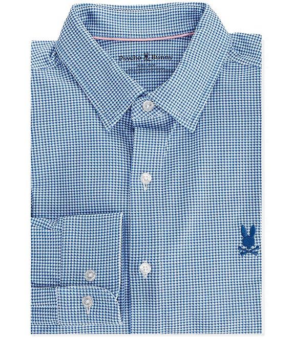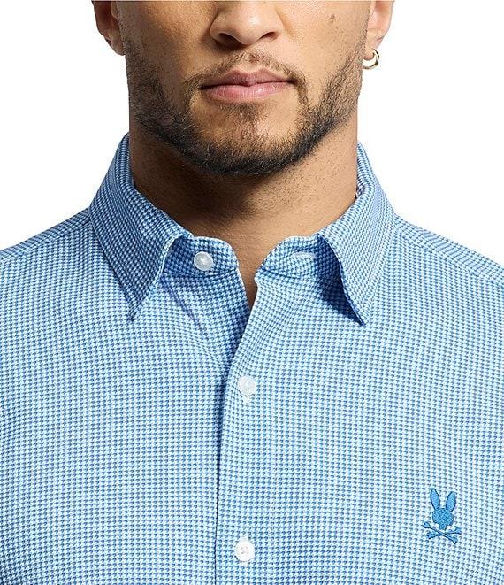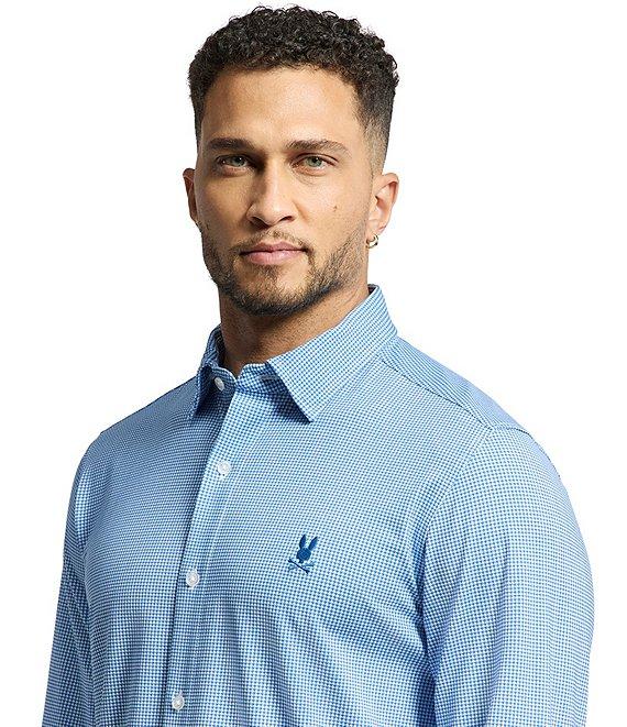 From Psycho Bunny, this dress shirt features: Regular fit Spread collar Long sleeves with two-button cuffs Button-front closure Mother-of-pearl buttons Embroidered "Psycho Bunny" logo on left side of chest Shirttail hem Laid-back option that can be dressed up or down Pima cotton/elastane stretch knit Machine wash/tumble dry Imported.