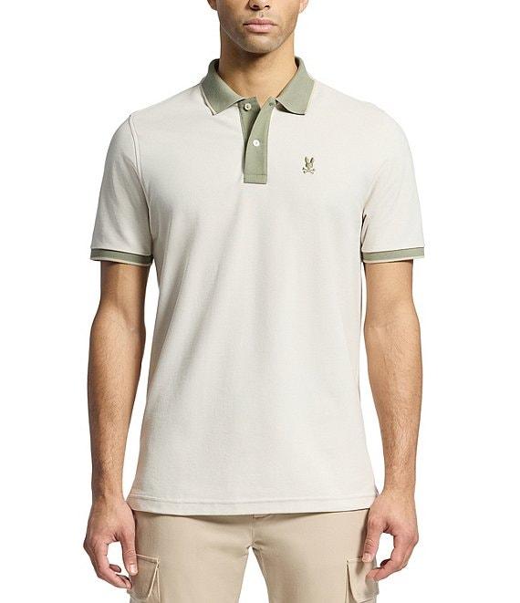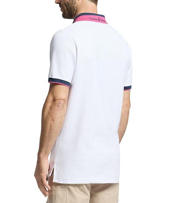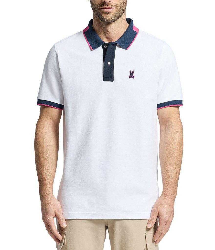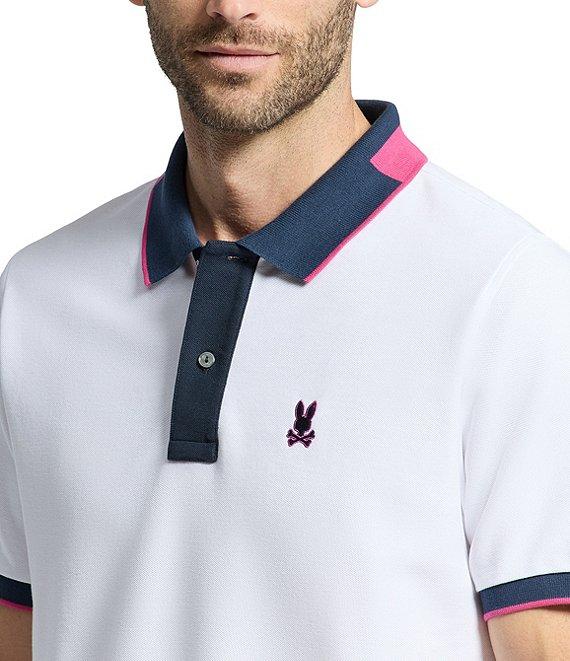 From Psycho Bunny, this polo shirt features: Ribbed polo collar Short sleeves with contrasting cuffs 2-button placket with Mother-of-Pearl buttons Contrasting placket Embroidered Bunny logo on the left side of the chest Pullover construction Pima cotton pique Machine wash/tumble dry Imported.