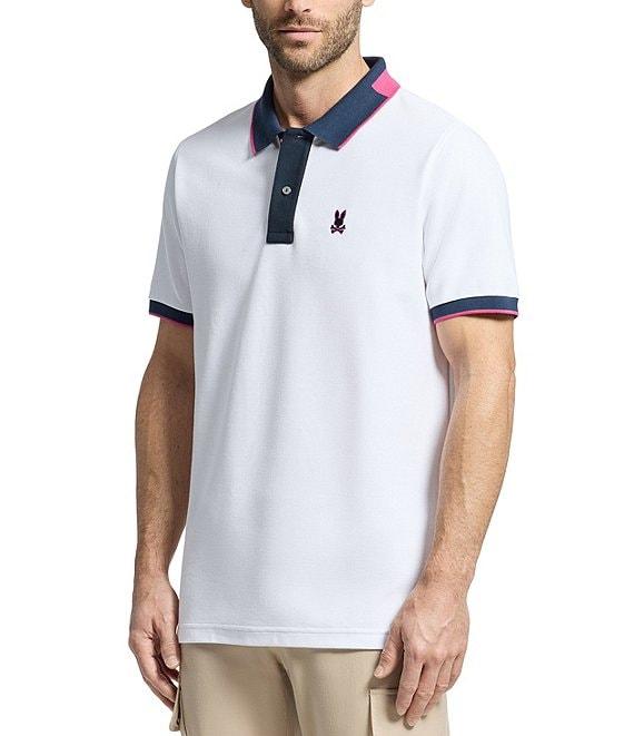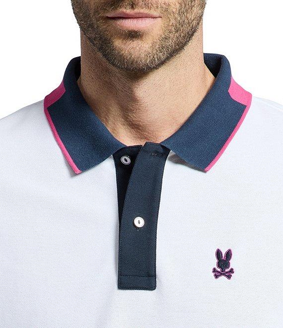 From Psycho Bunny, this polo shirt features: Ribbed polo collar Short sleeves with contrasting cuffs 2-button placket with Mother-of-Pearl buttons Contrasting placket Embroidered Bunny logo on the left side of the chest Pullover construction Pima cotton pique Machine wash/tumble dry Imported.