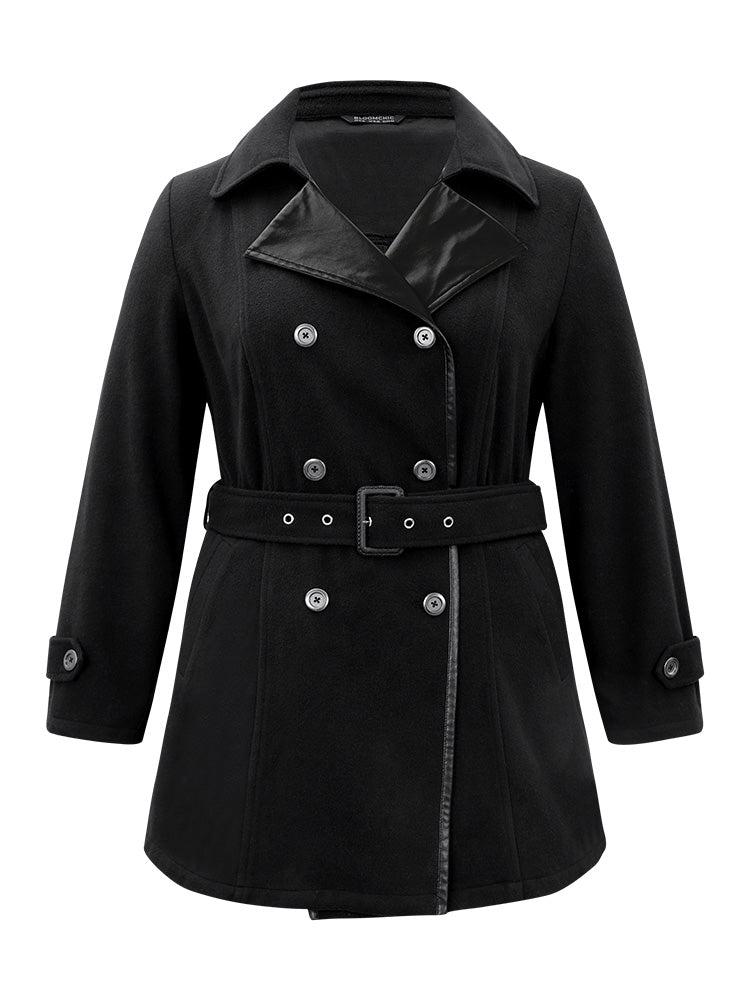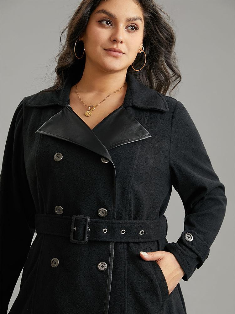 Shop PU Leather Patchwork Lapel Collar Double Breasted Belted Coat now and redefine your style with confidence at BloomChic. Tailored for mid and plus-size women. This trendy Outerwear Women, sizes 10-30. Season:Winter;Color:Black;Style:Casual;Pattern Type:Plain;Details:Pocket, Button, Belted, Patchwork;Pocket:It is perfectly sized to carry a phone.;Belt:Belt;Closure Type:Button;Lining:No-lining