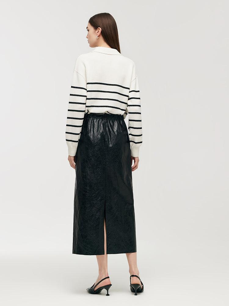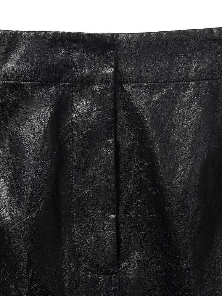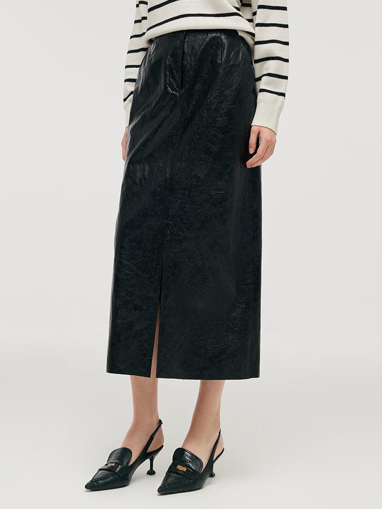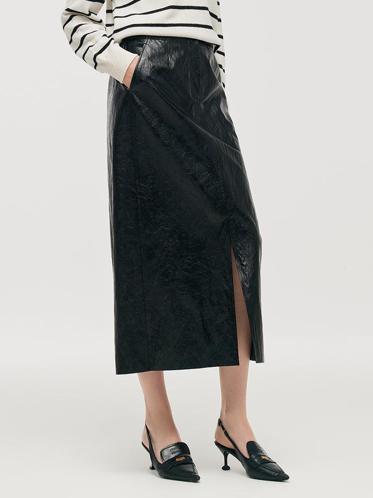 -H-line fit -With pockets -Workwear This PU leather skirt combines sleek style with practical versatility. Its H-line fit enhances its streamlined silhouette, making it a sophisticated choice for both office wear and evening outings. The slit detail adds a touch of allure, ensuring that this piece is both fashionable a