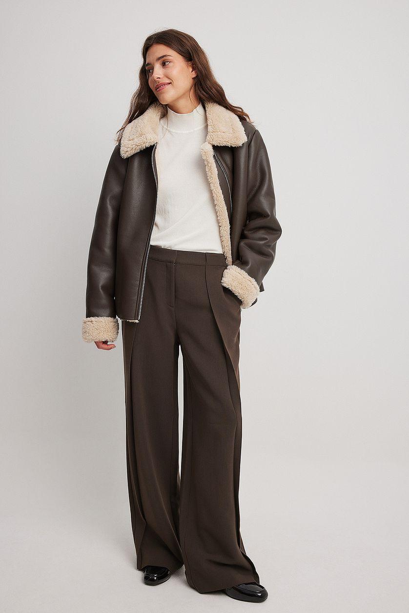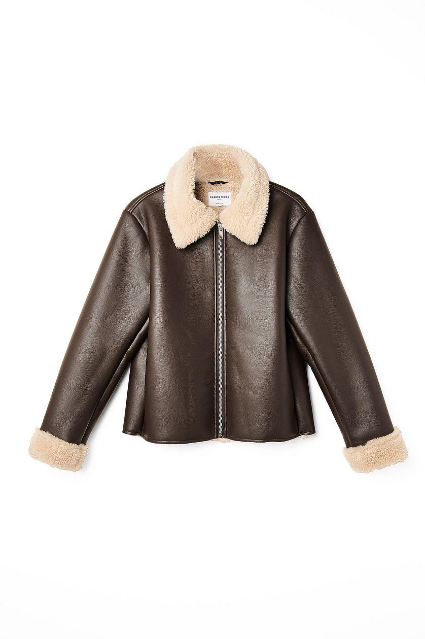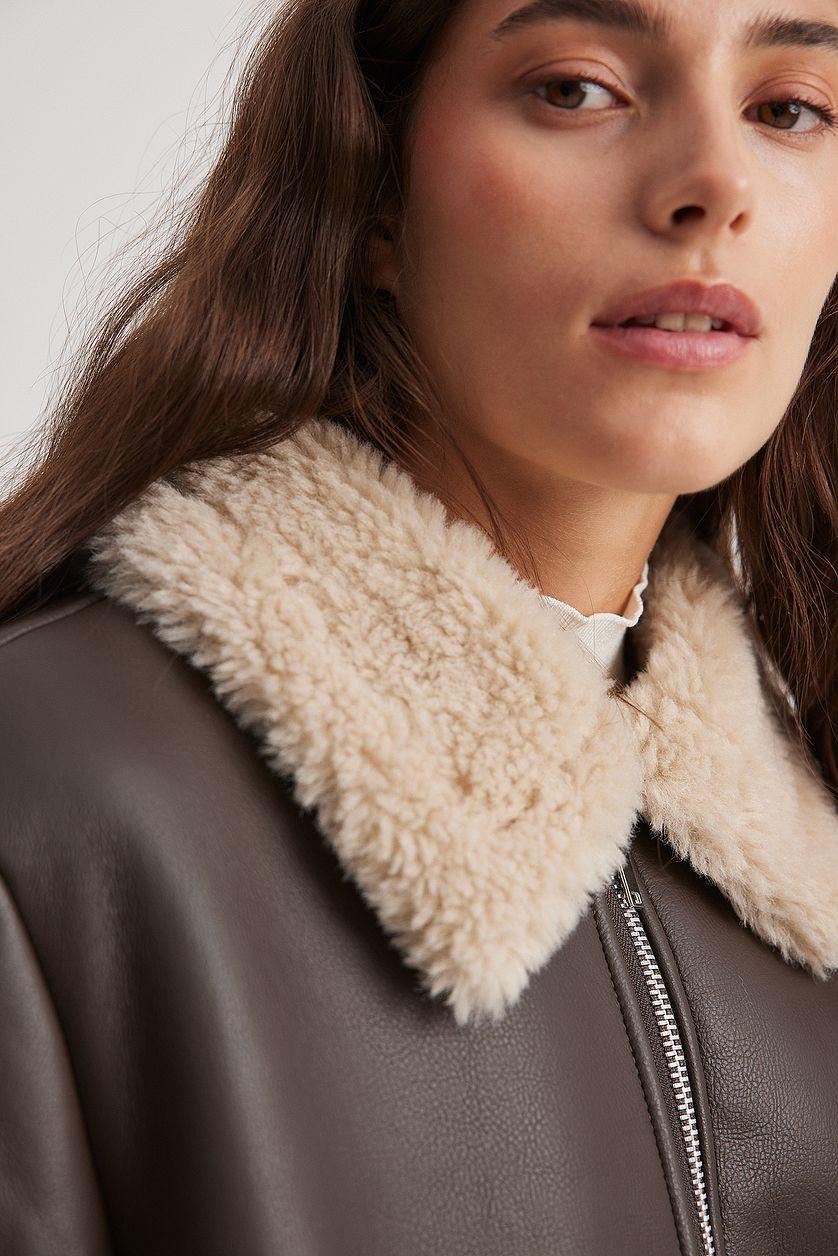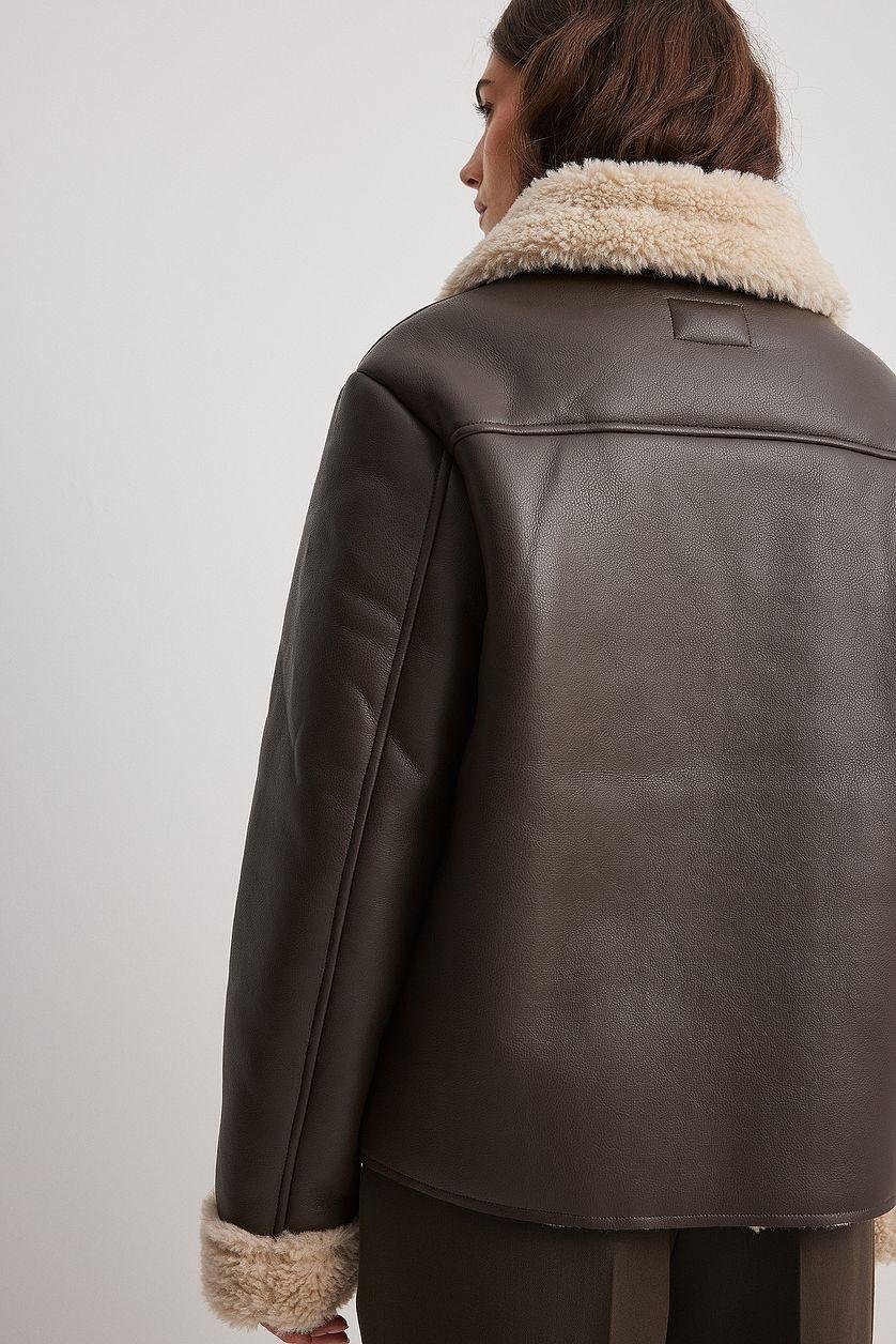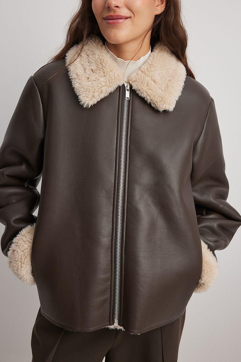This jacket is made of PU and features an oversized short fit and a teddy material on the inside. It has a classic collar and open side seam pockets. Our jacket features a front zipper.