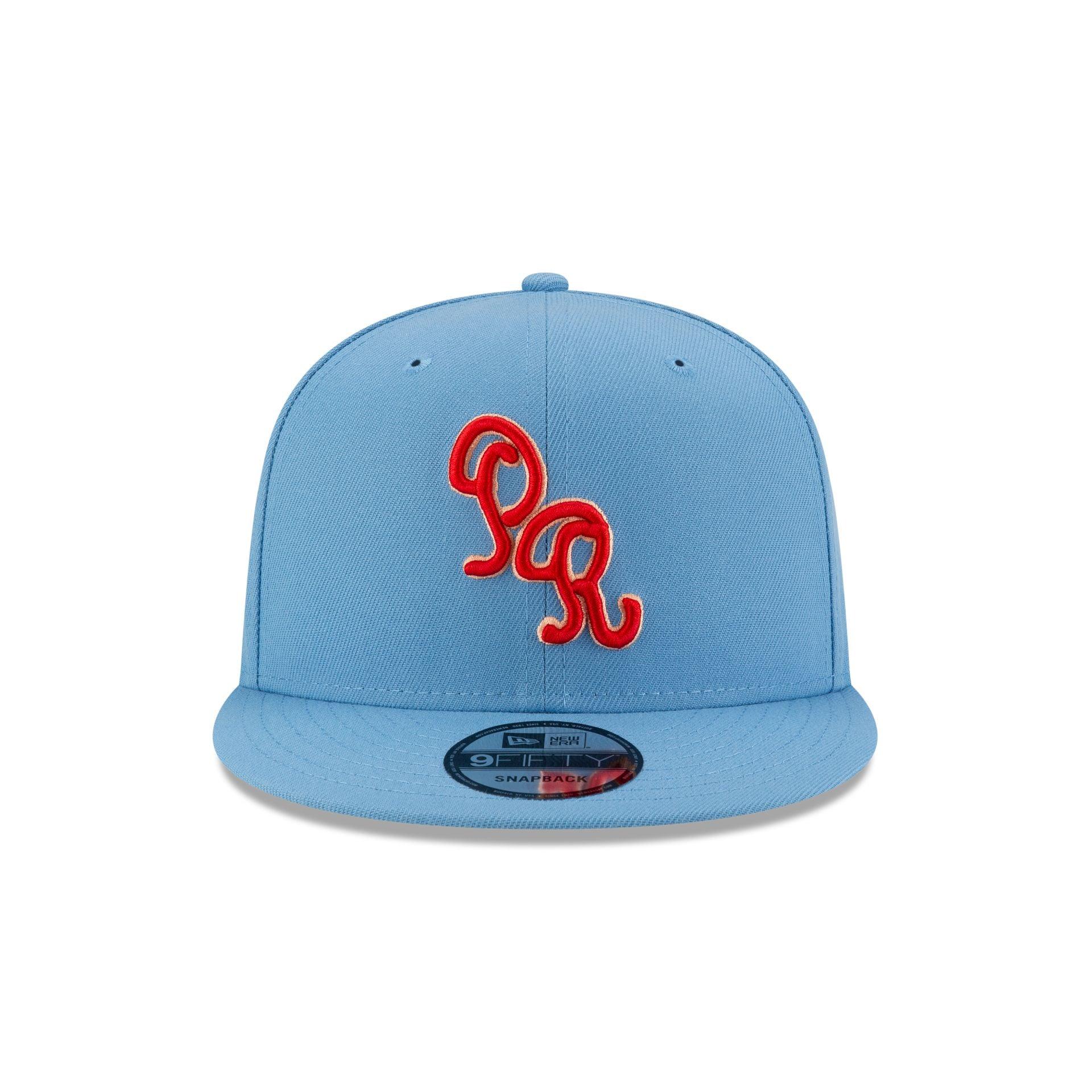 The Puerto Rico Sky Blue 9FIFTY Snapback features an embroidered PR script logo at the front panels with a snapback closure at the rear and a gray undervisor.