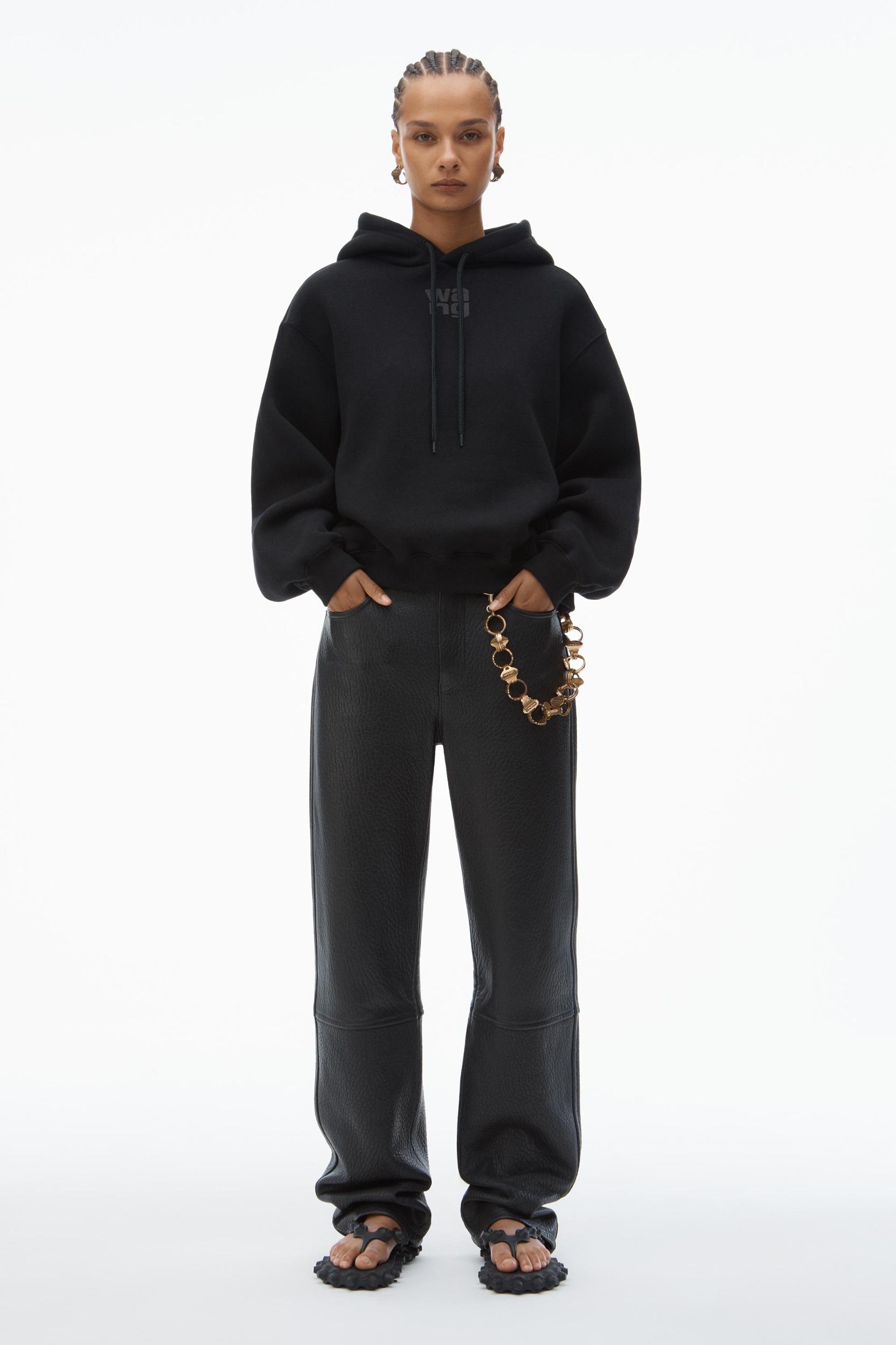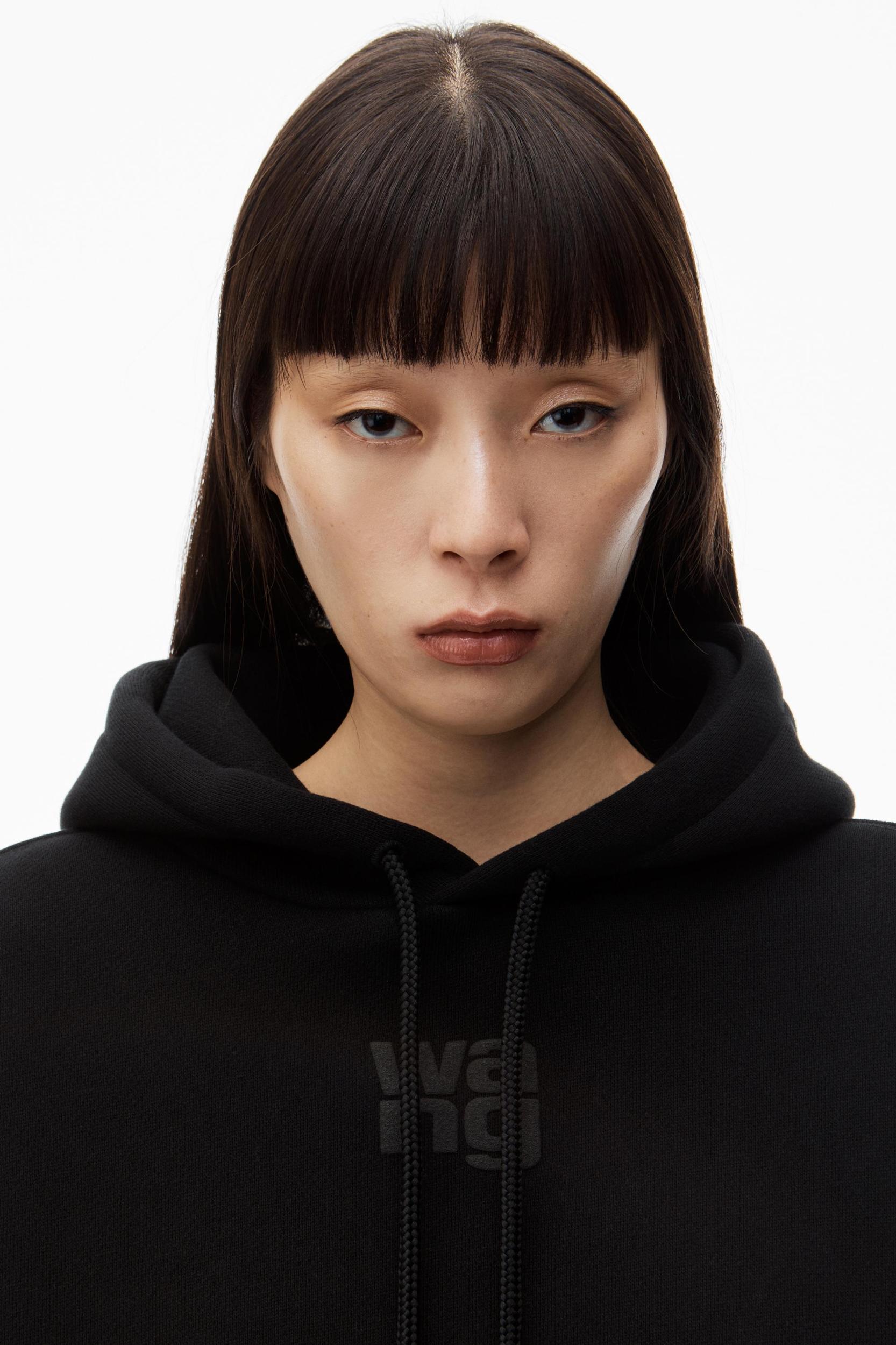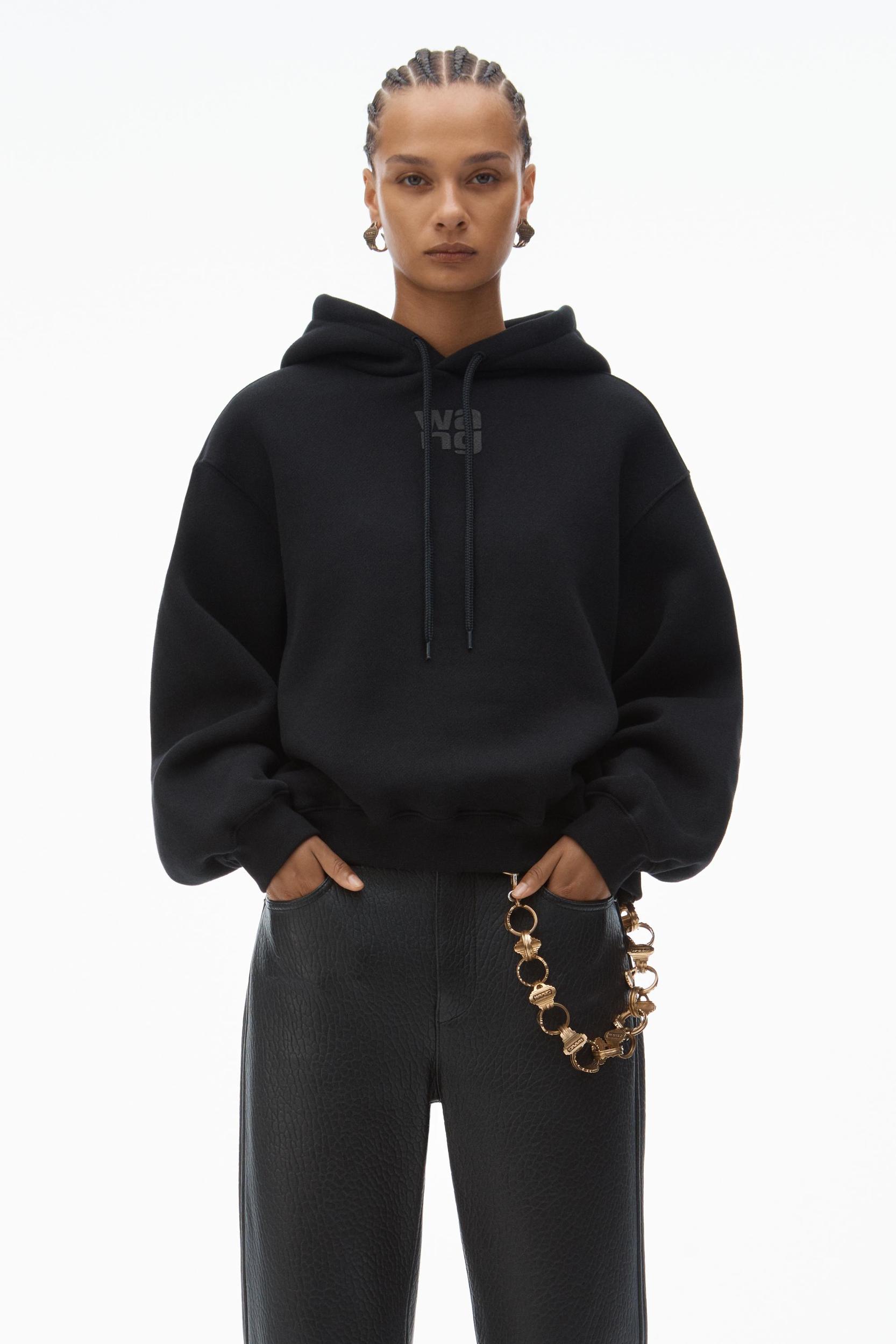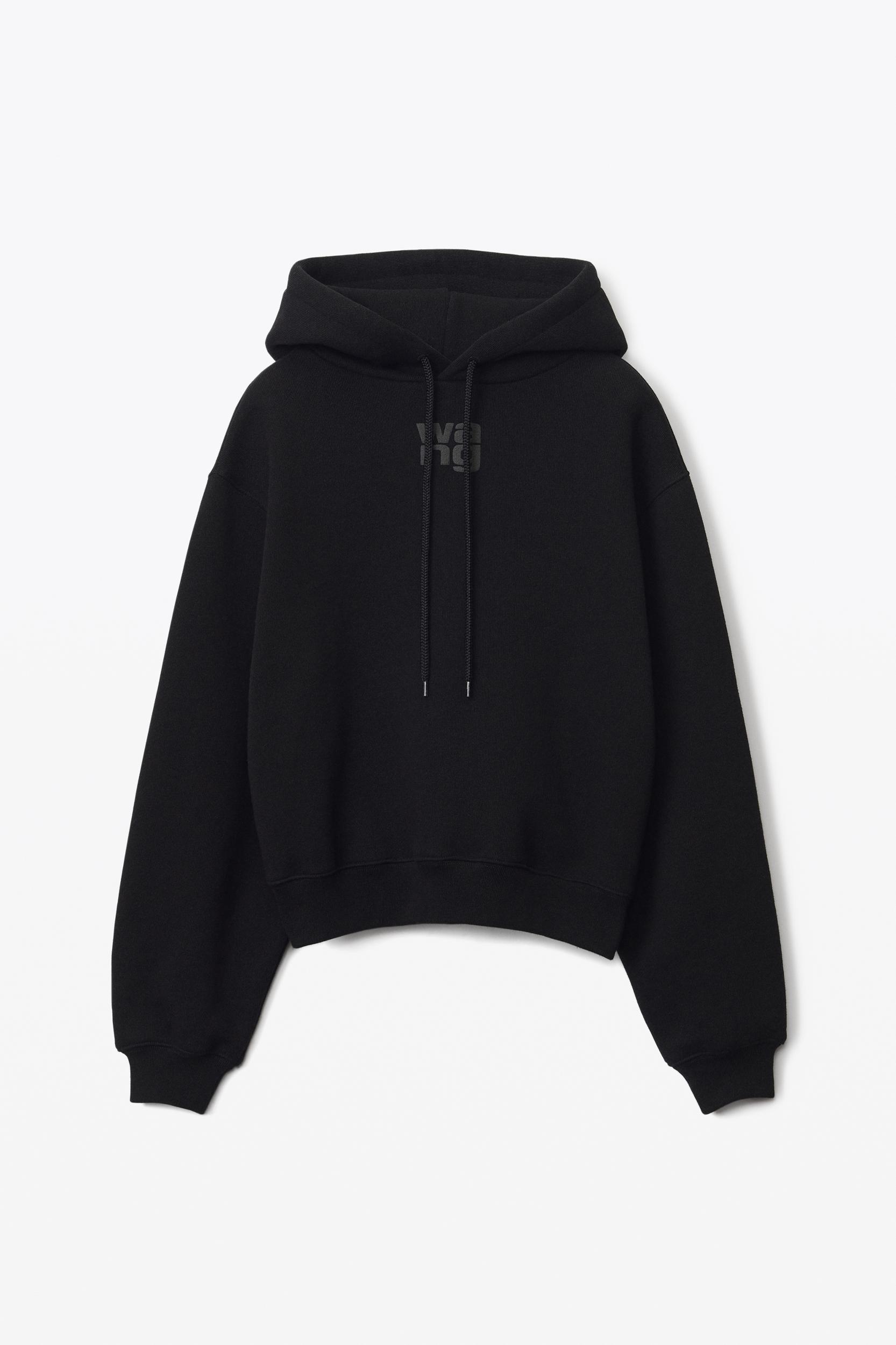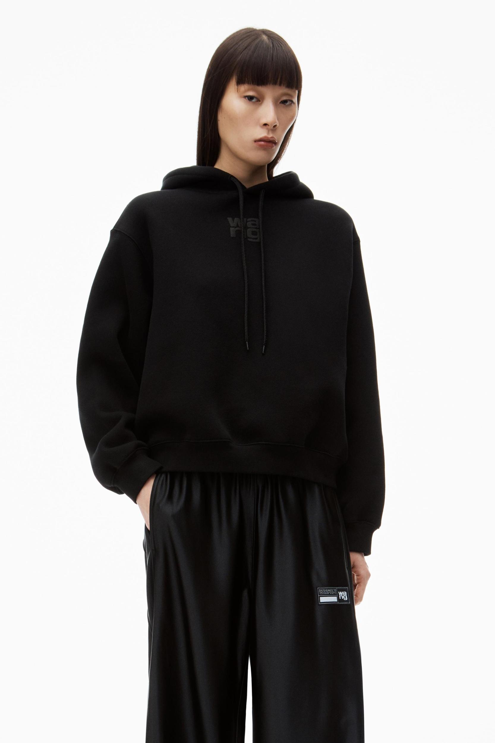 black long-sleeve heavy brushed structured terry hoodie with a stacked puff paint logo