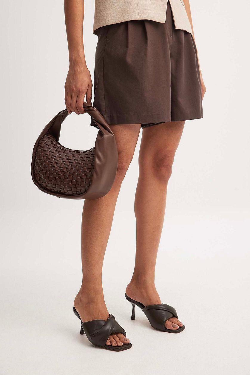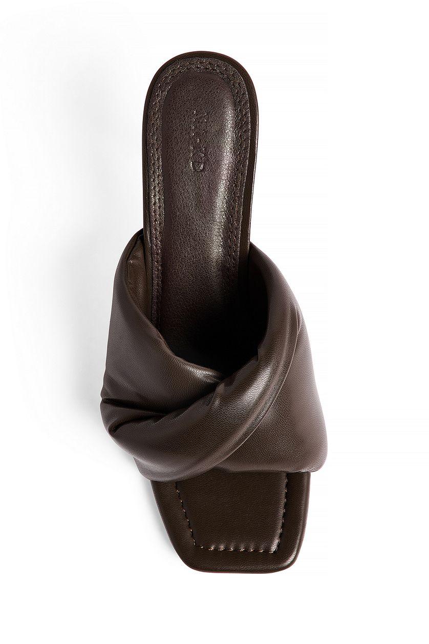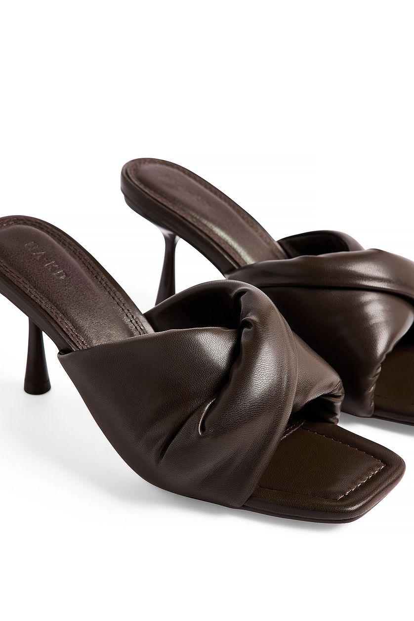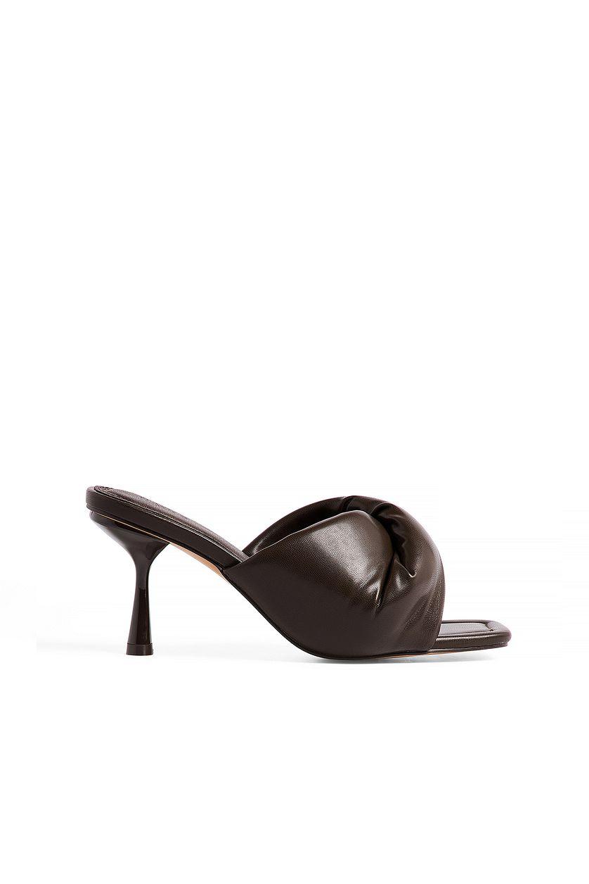 These heels feature a gently rounded square toe and a slip-on design. They have a puffy twist detail at the front and a rounded hourglass heel. Measurements in size EU 39: Heel height: 9 cm / 3.54 in.