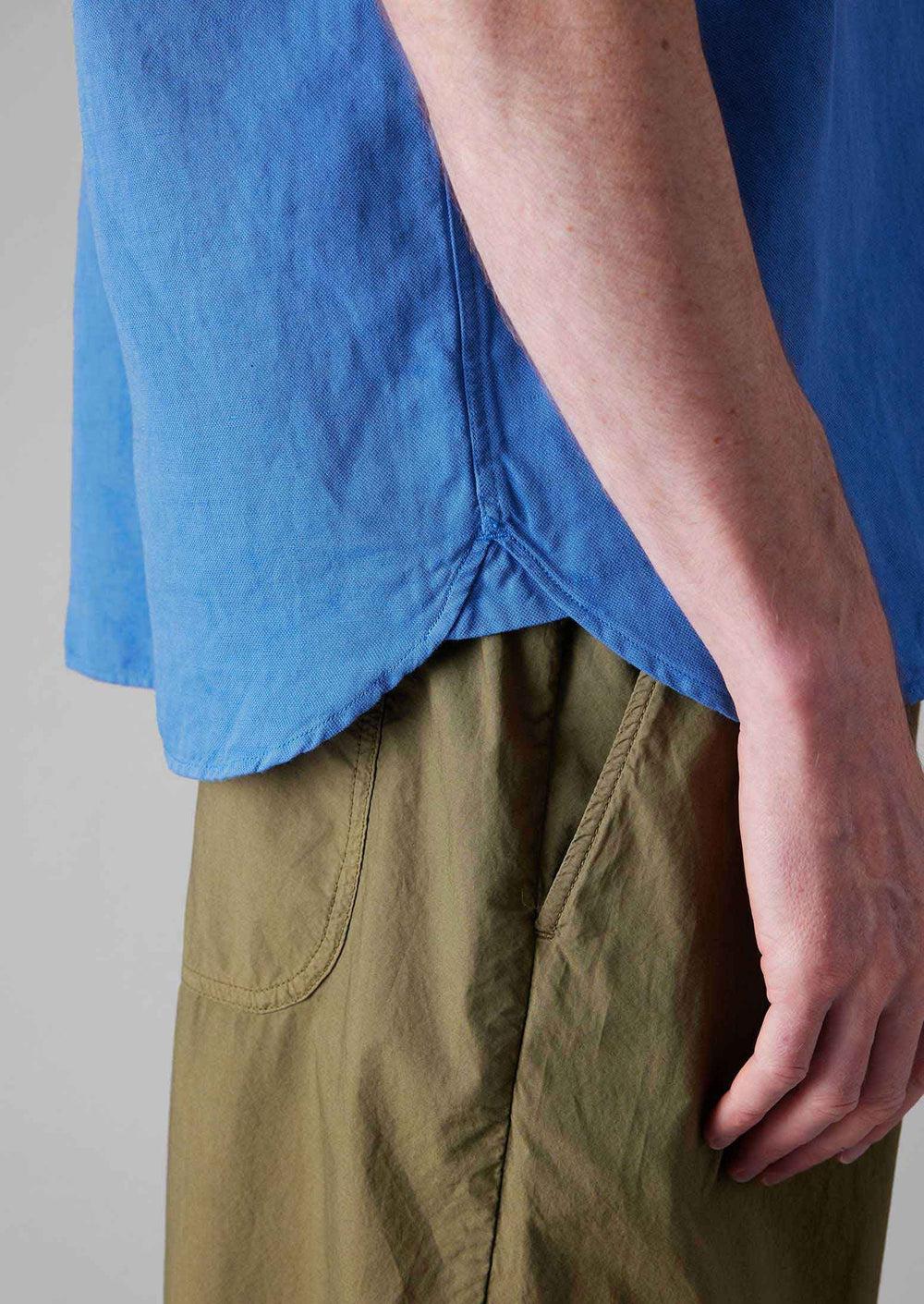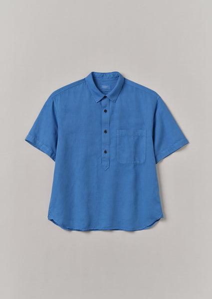 Cotton and linen twill. Garment-dyed. Elbow-length sleeves. Hip length. Half placket. Corozo buttons. Curved hem.