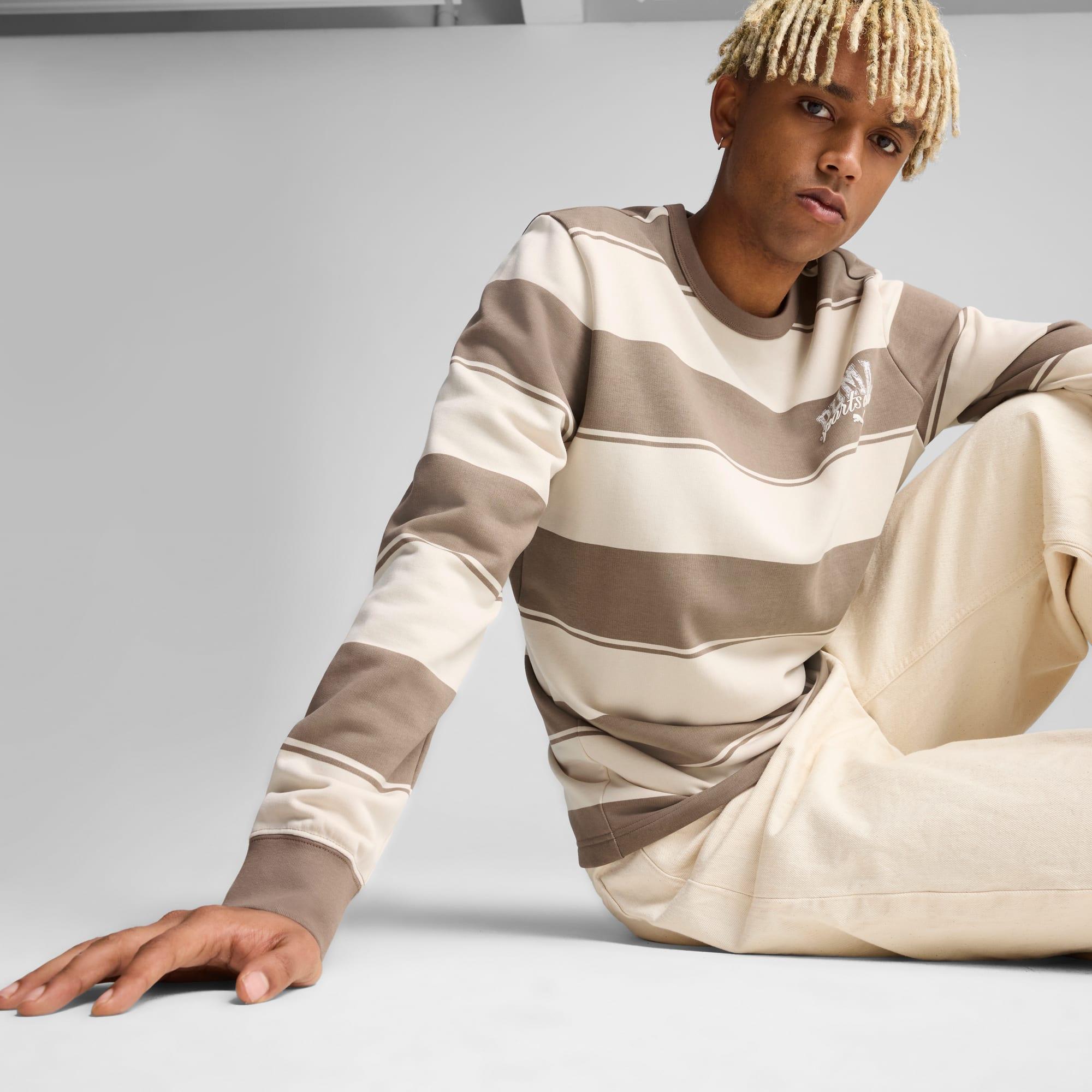 Featuring An All-Over Print And Graphic Rubber Details, This Puma Crew Brings Vibrant Energy To Your Wardrobe. Rib Cuffs Add A Touch Of Classic Style, Making It Perfect For Those Who Love To Mix Bold Design With Everyday Wear. Features & Benefits Made With At Least 20% Recycled Cotton Details Regular Fitcrew Neckribbed Cuffslong Sleevespuma Allover Printpuma Branding Details | | PUMA Class Men's Striped Crew Sweatshirt in Brown, Size S