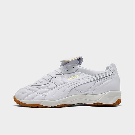 Low-top lifestyle sneakers with a rich soccer heritage. Premium cow leather with Puma iconography for smooth heritage style. Removable folded tongue and retro-inspired details play up the soccer roots. Lace closure ensures a snug, secure fit. Lightweight and flexible EVA midsole absorbs shock for a smooth, stable ride. Durable rubber outsole designed for multi-surface traction. The Puma King Indoor is imported. Blending vintage athletic aesthetics with modern comfort, the Mens Puma King Indoor